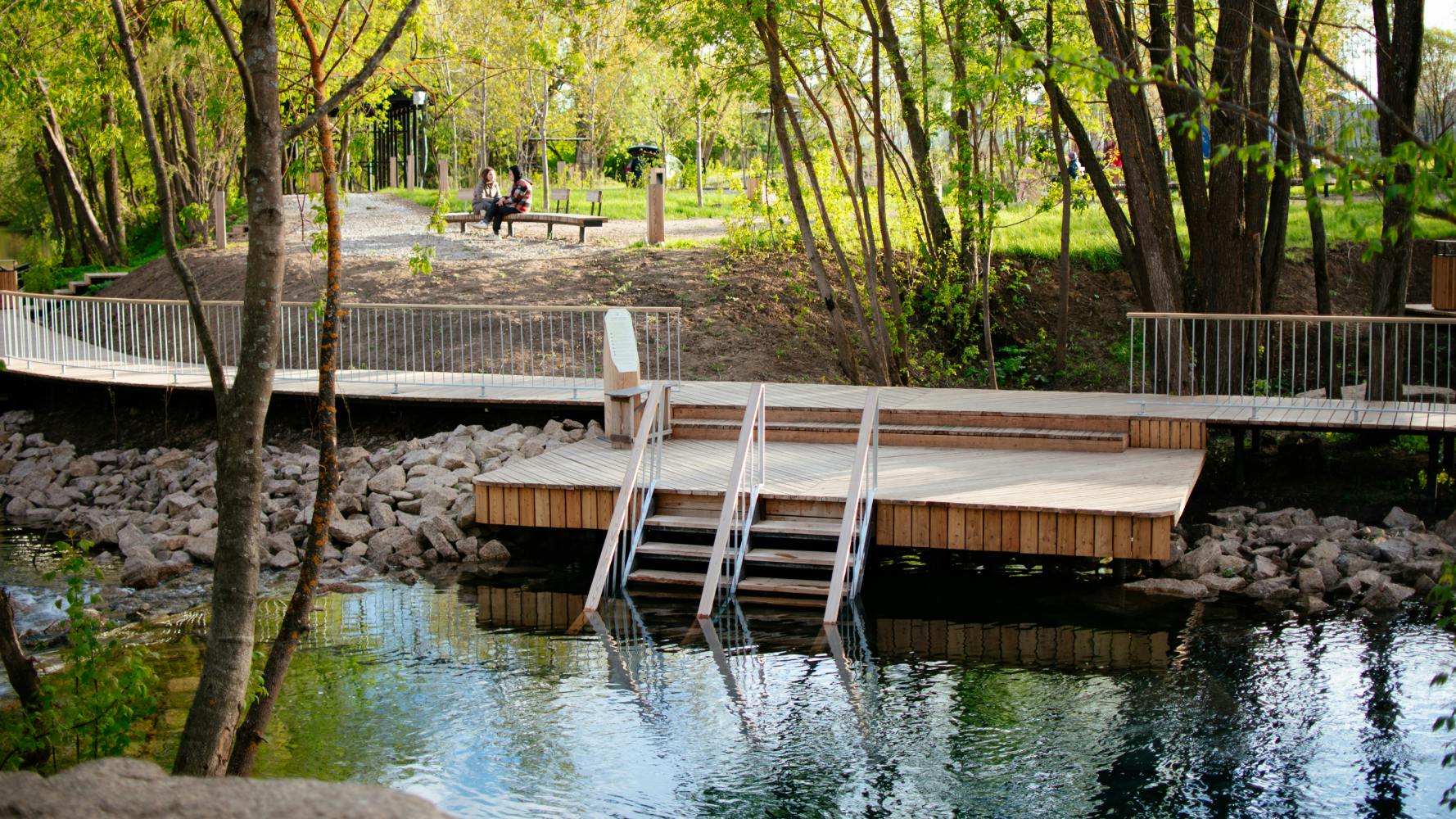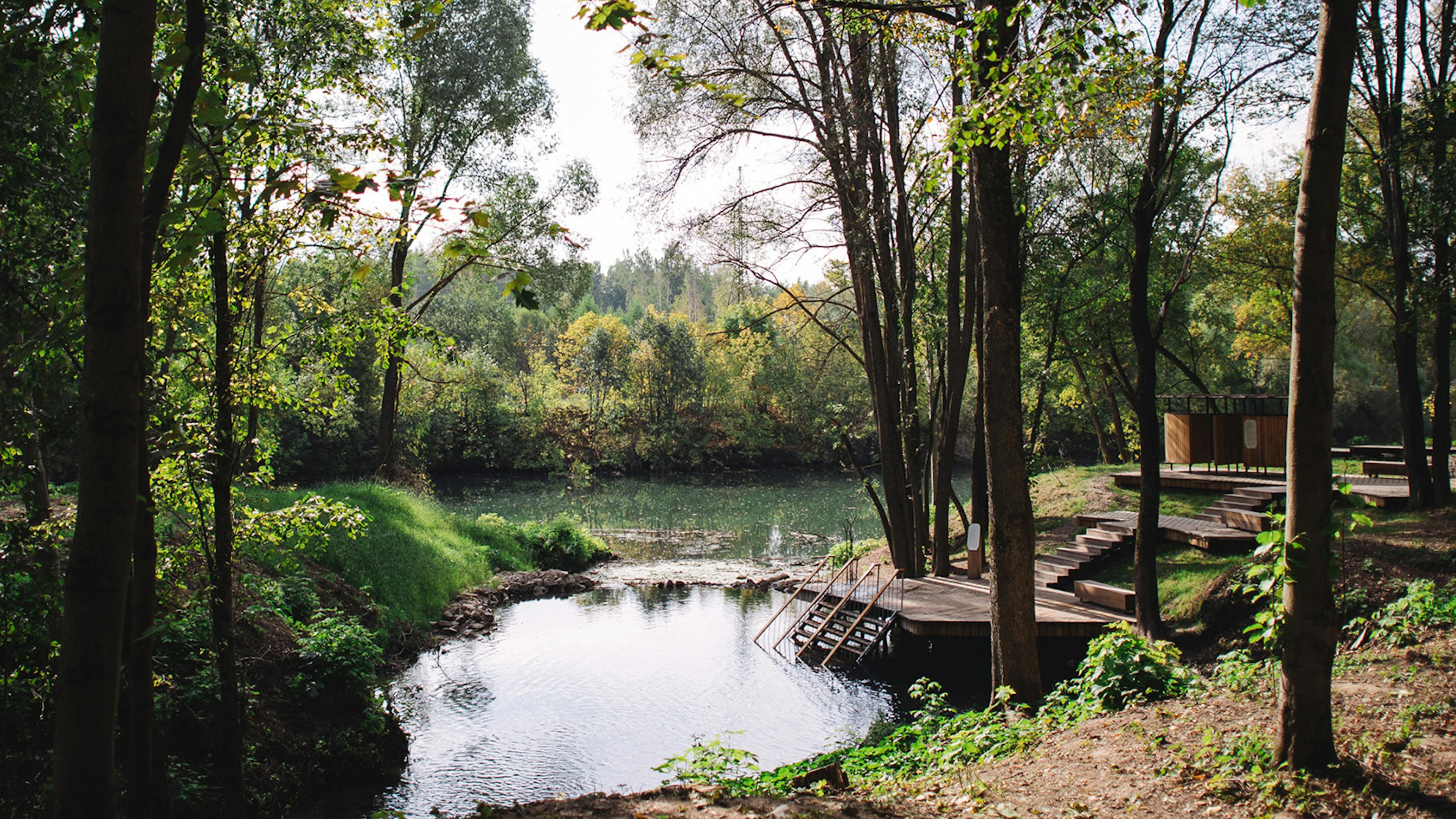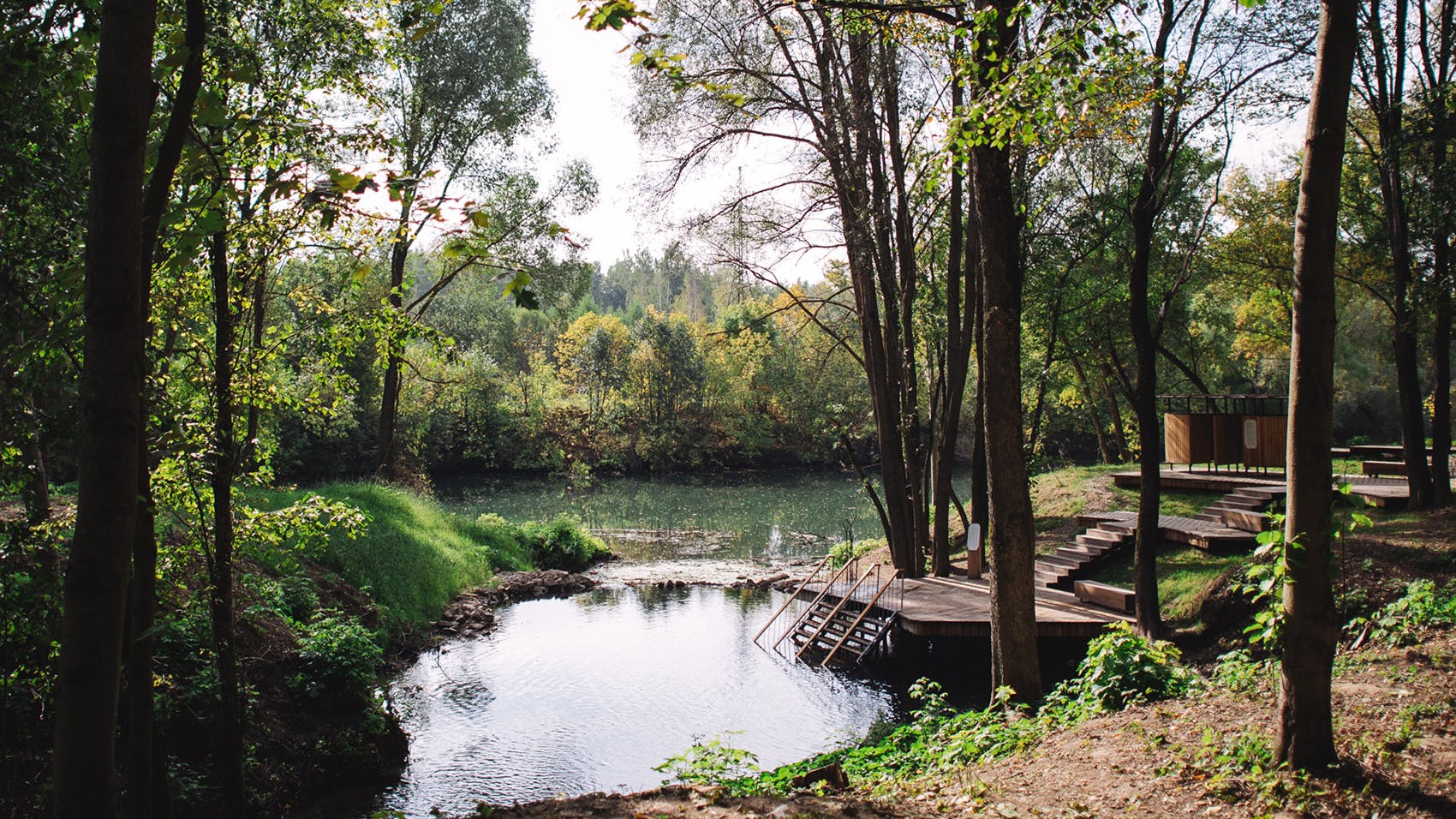 A relaxation zone near the waterfall, which brings together the cluster’s main facilities: an eco-center with a café and event space, rest areas with picnic-style furniture, an amphitheater with a scenic overlook, a dock, a small footbridge, and a nautical base. New swimming areas with piers are also planned where the lakes flow into the river.