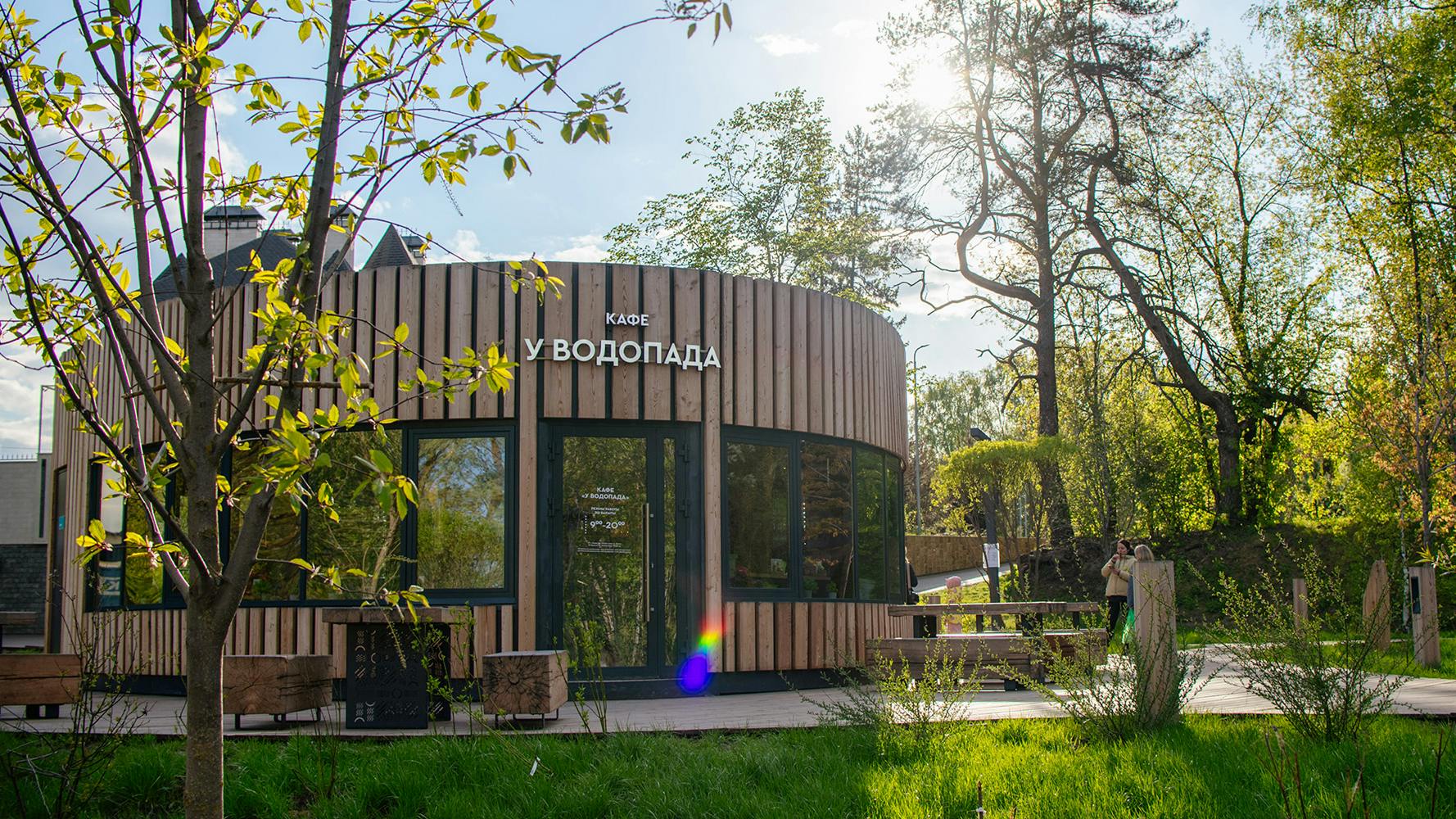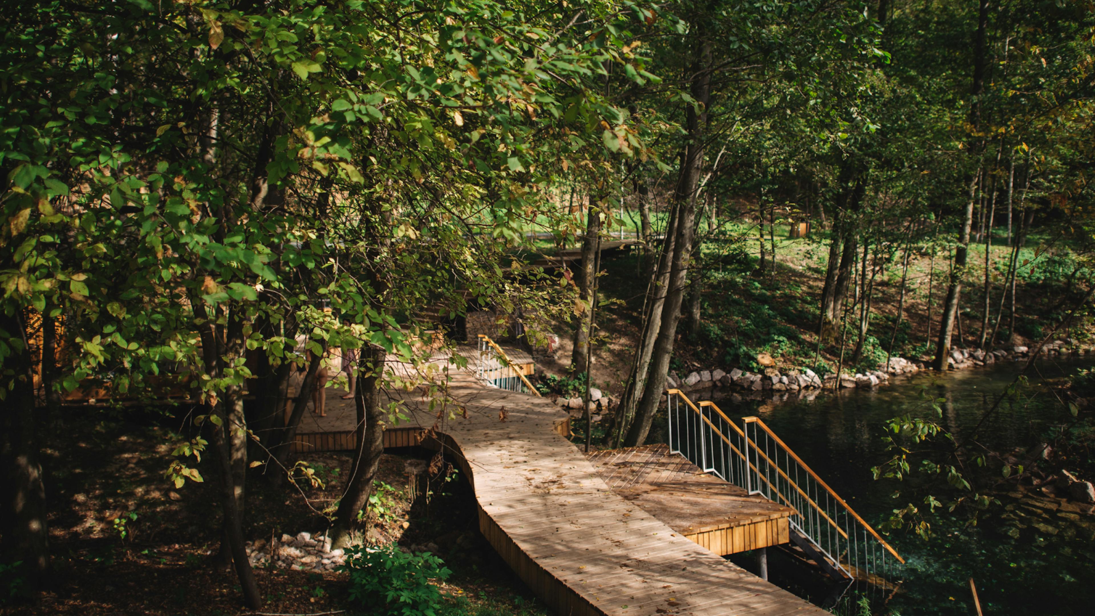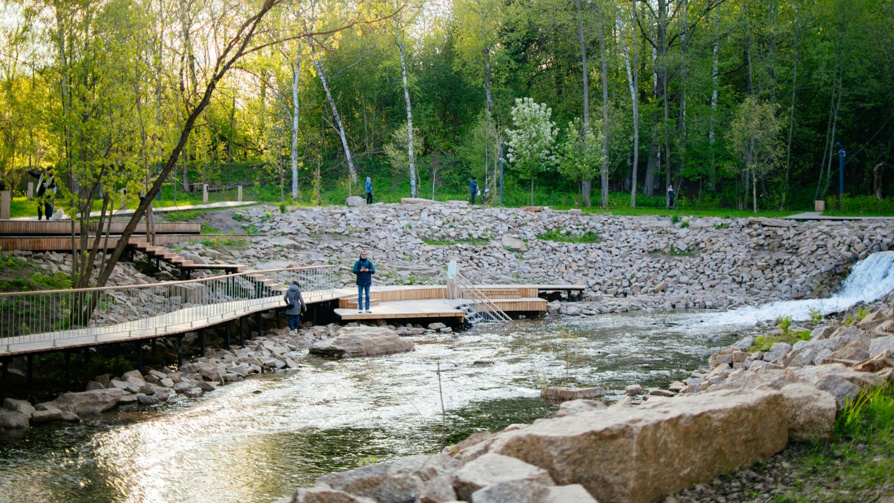 A relaxation zone near the waterfall, which brings together the cluster’s main facilities: an eco-center with a café and event space, rest areas with picnic-style furniture, an amphitheater with a scenic overlook, a dock, a small footbridge, and a nautical base. New swimming areas with piers are also planned where the lakes flow into the river.