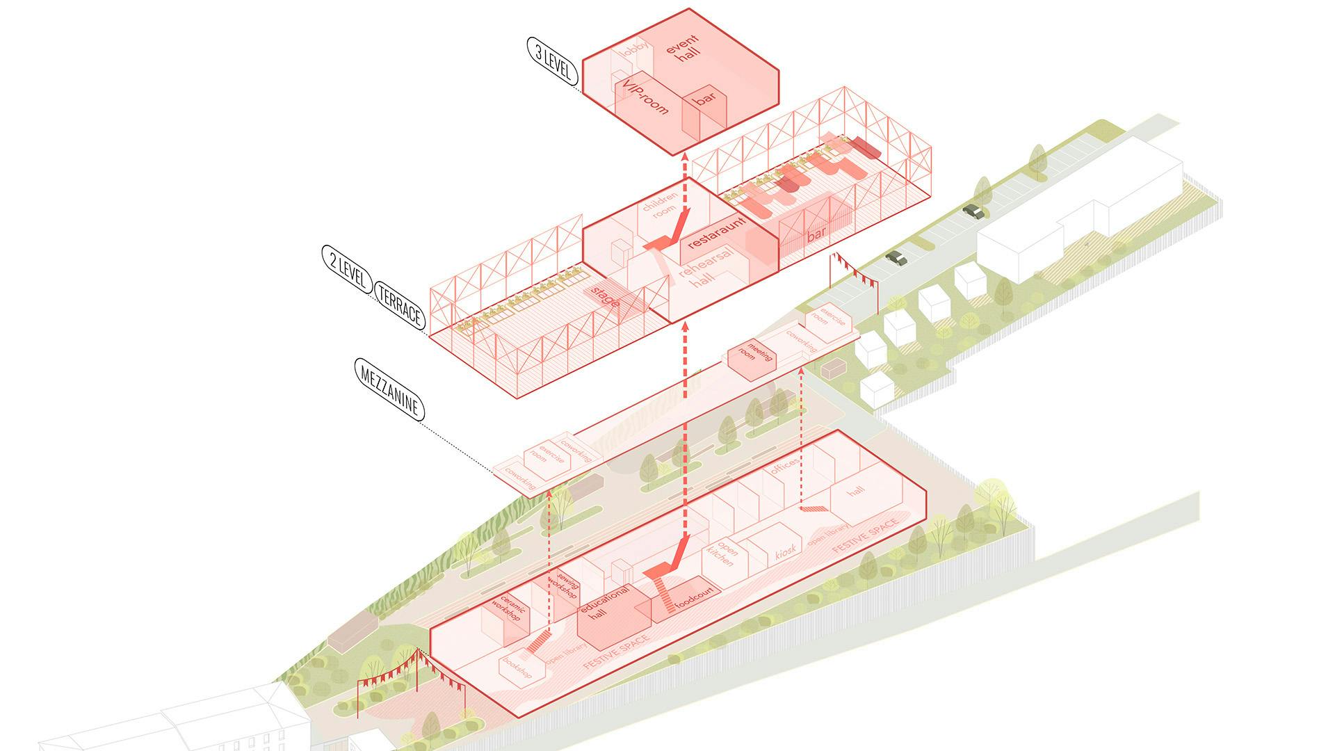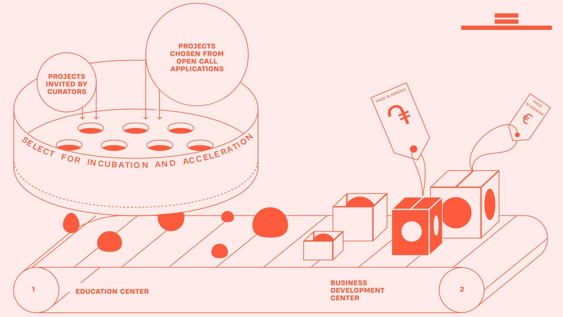 As part of the project, we have developed an architectural concept for the factory space and its surrounding grounds. The building’s visual identity is centered on the existing terraced roofs. These iconic elements, visible from various points in the city, become a contemporary reinterpretation of the traditional Dilijan balcony and symbolize future opportunities. One of the terraces will be transformed into an event space, and another will host an outdoor café-bar. Inside the incubator, there will be an open library and a co-creation platform with a café, bookstore, and event hall; a production line with workshops and studios; offices; a coworking space; a media lab with a podcast room; as well as a large multifunctional hall.