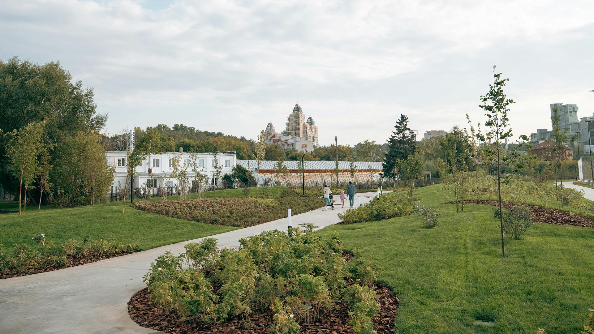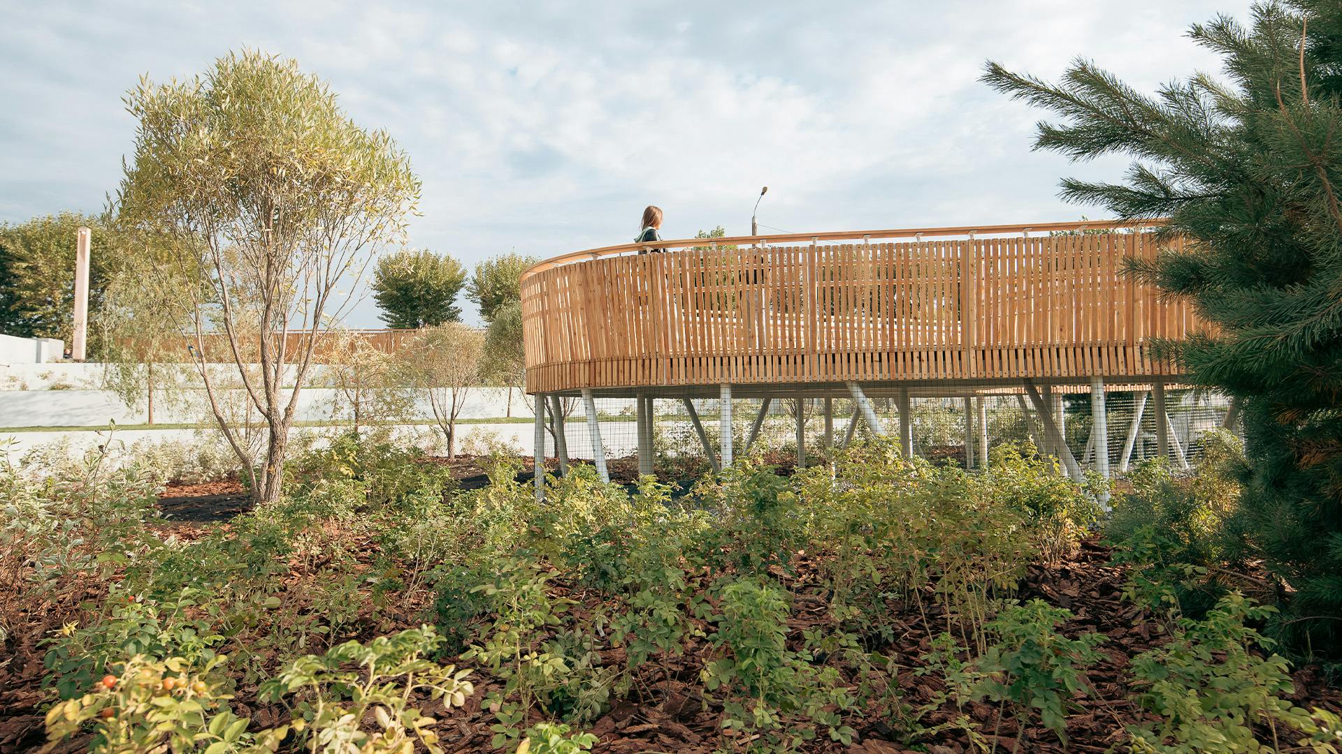 On a section of the embankment, we designed a panoramic green amphitheatre to create a smooth transition between the upper and lower levels of the structure. We integrated a ramp-bridge for bicycles and strollers. Its gentle curve, combined with slender metal supports arranged in a seemingly random pattern, creates a forest-like effect that blends delicately into the landscaped surroundings.