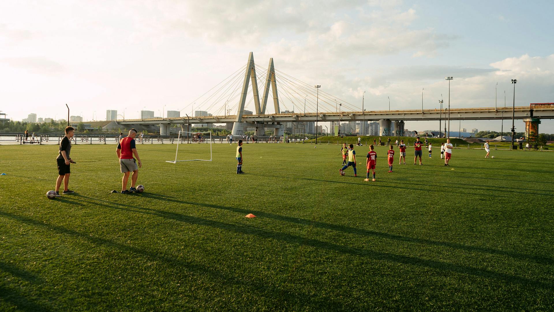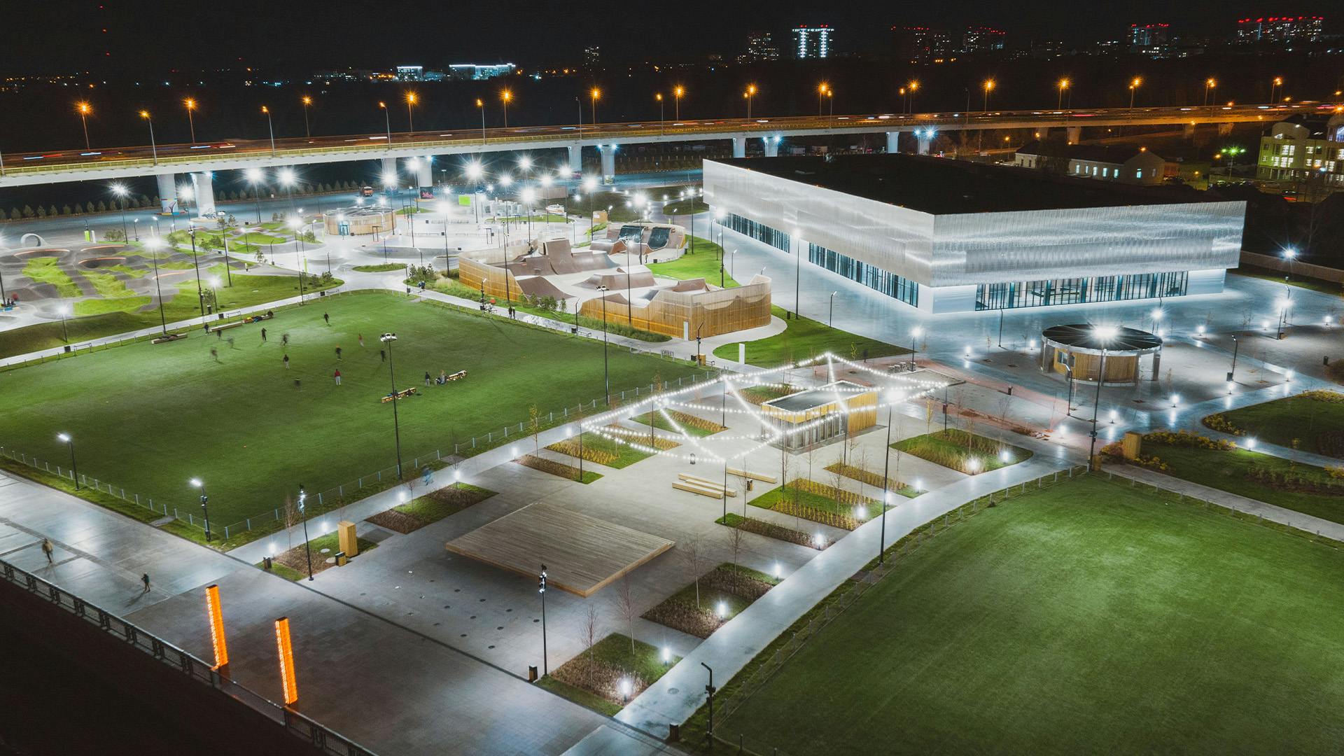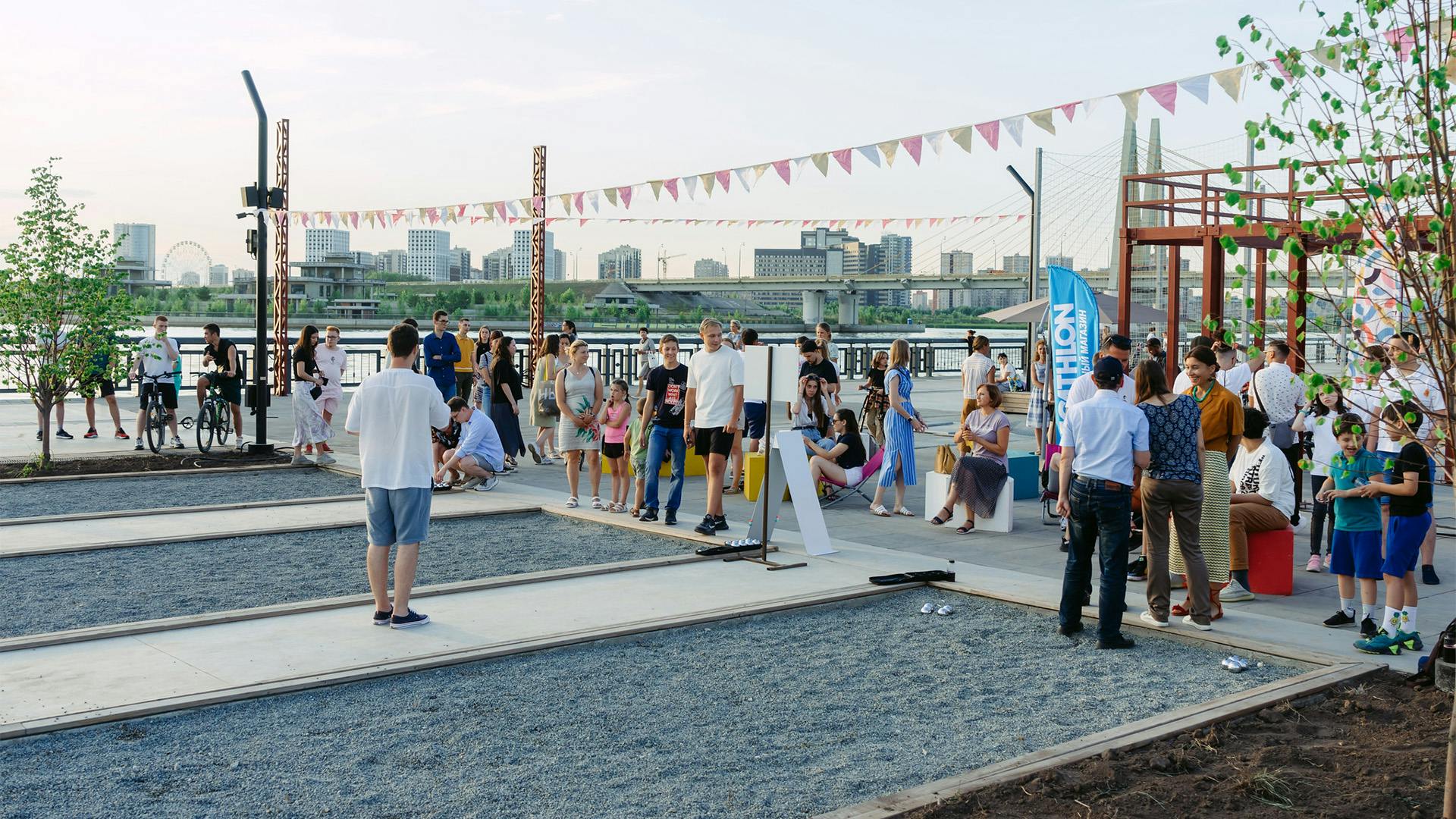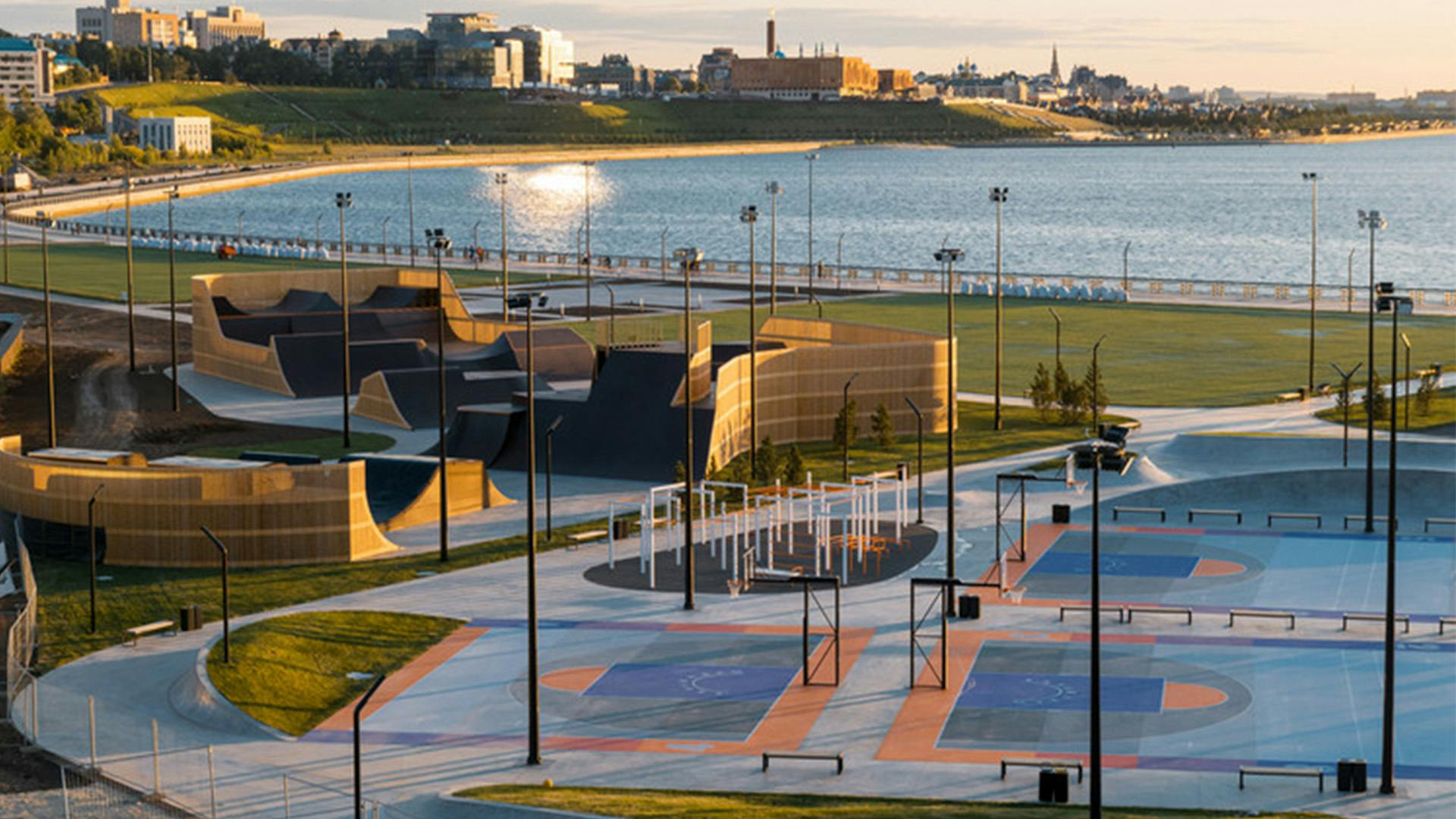 At the main entry points, event stages, fountains, pavilions, and kiosks were designed by the agency, along with custom seating furniture created specifically for the riverbank. Several football fields of various sizes, a sand volleyball court, and pétanque courts punctuate the promenade. For younger children, a sandy playground was created, featuring climbing structures made from large oak trunks reclaimed from nearby forests — a nod to local shipbuilding traditions and the historic use of Kazan oaks for that purpose.