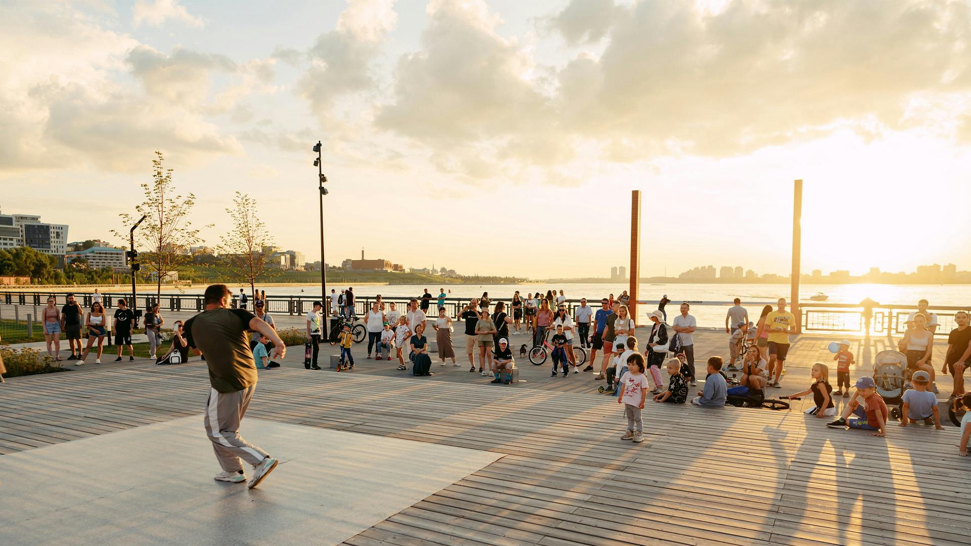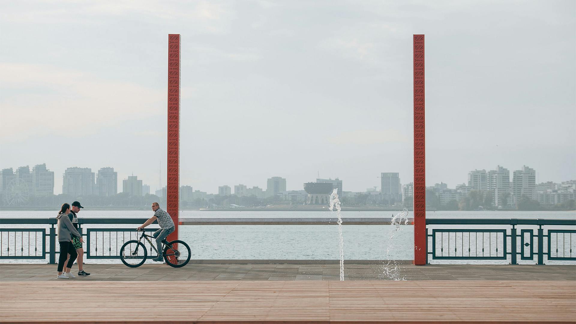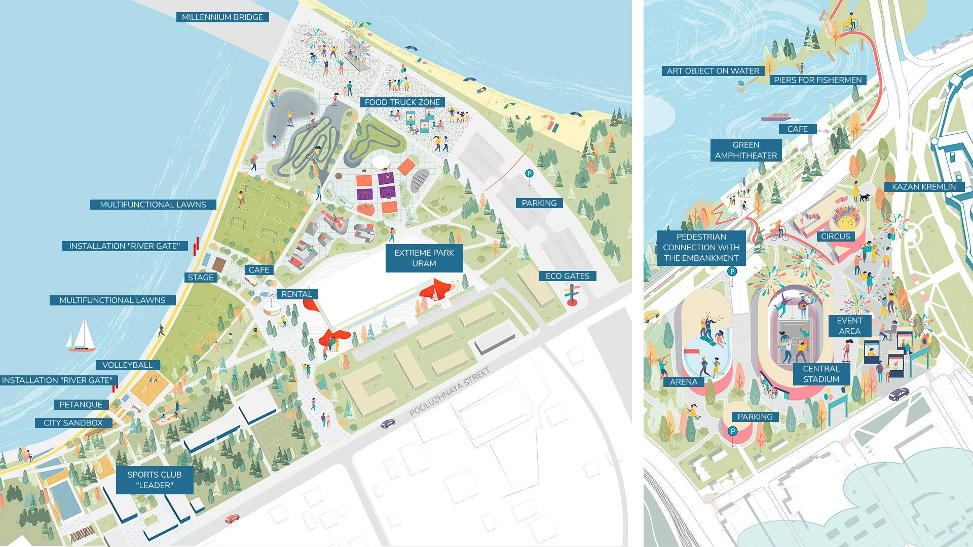 Over a stretch of more than 3.5 km, the development of the riverbanks had to meet the main challenge of being built on a concrete embankment — a technical structure essential for managing major floods. We introduced landscaping wherever possible and proposed an approach that strengthens uses related to sport and physical activity, while also placing strong emphasis on cultural programming. This work represented the first step in implementing the Kazanka River Development Strategy.
