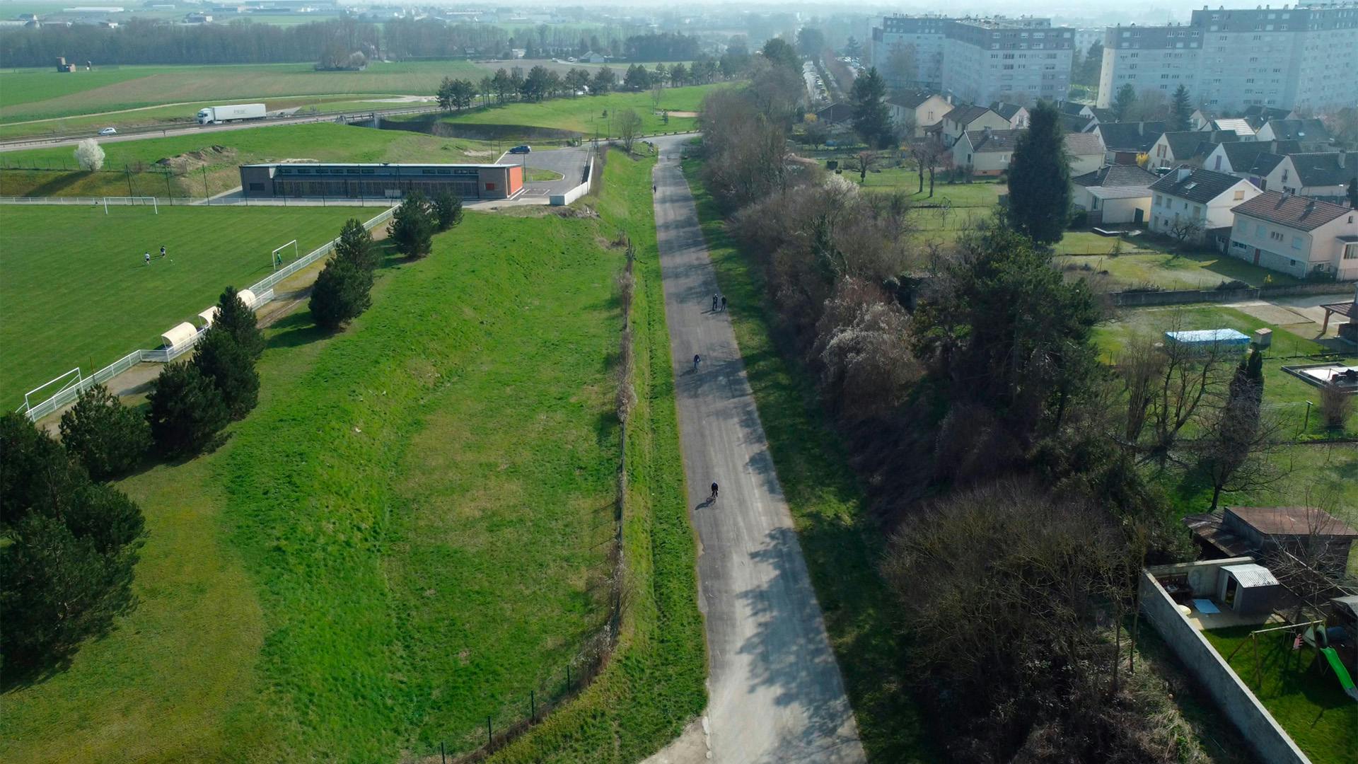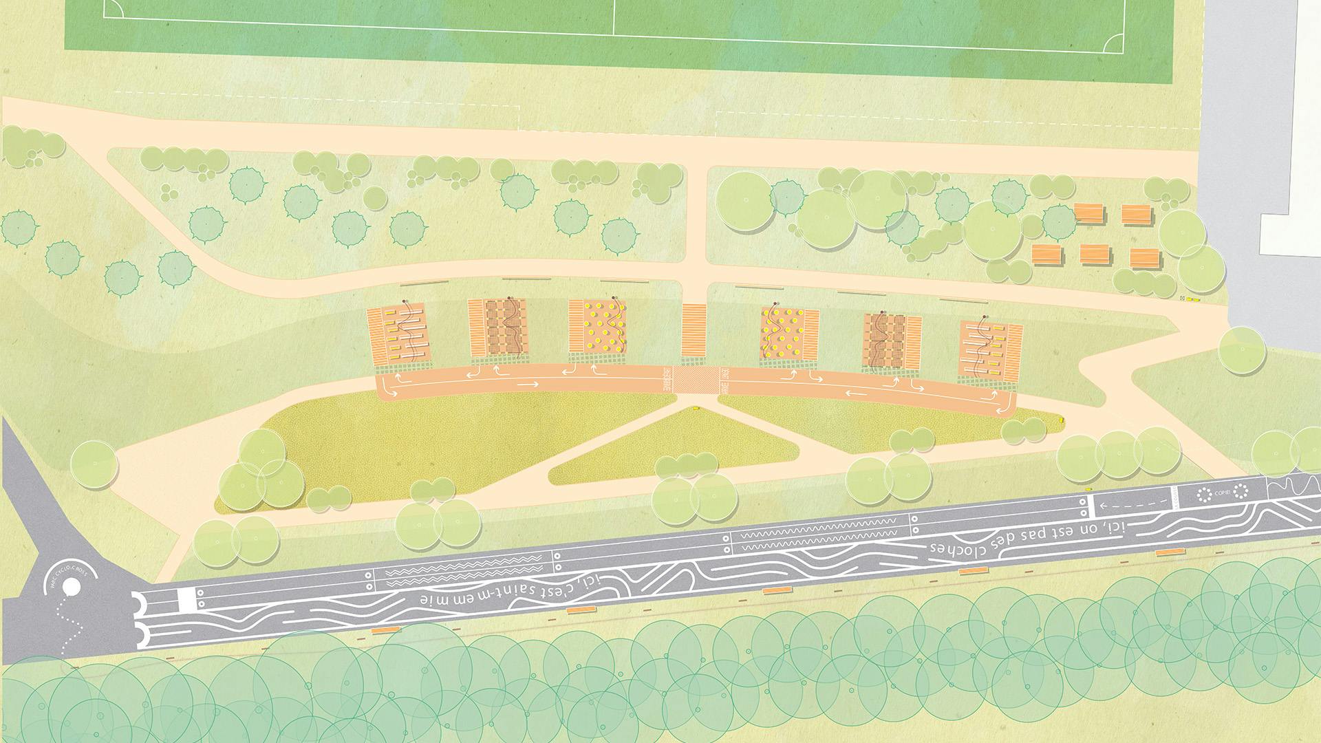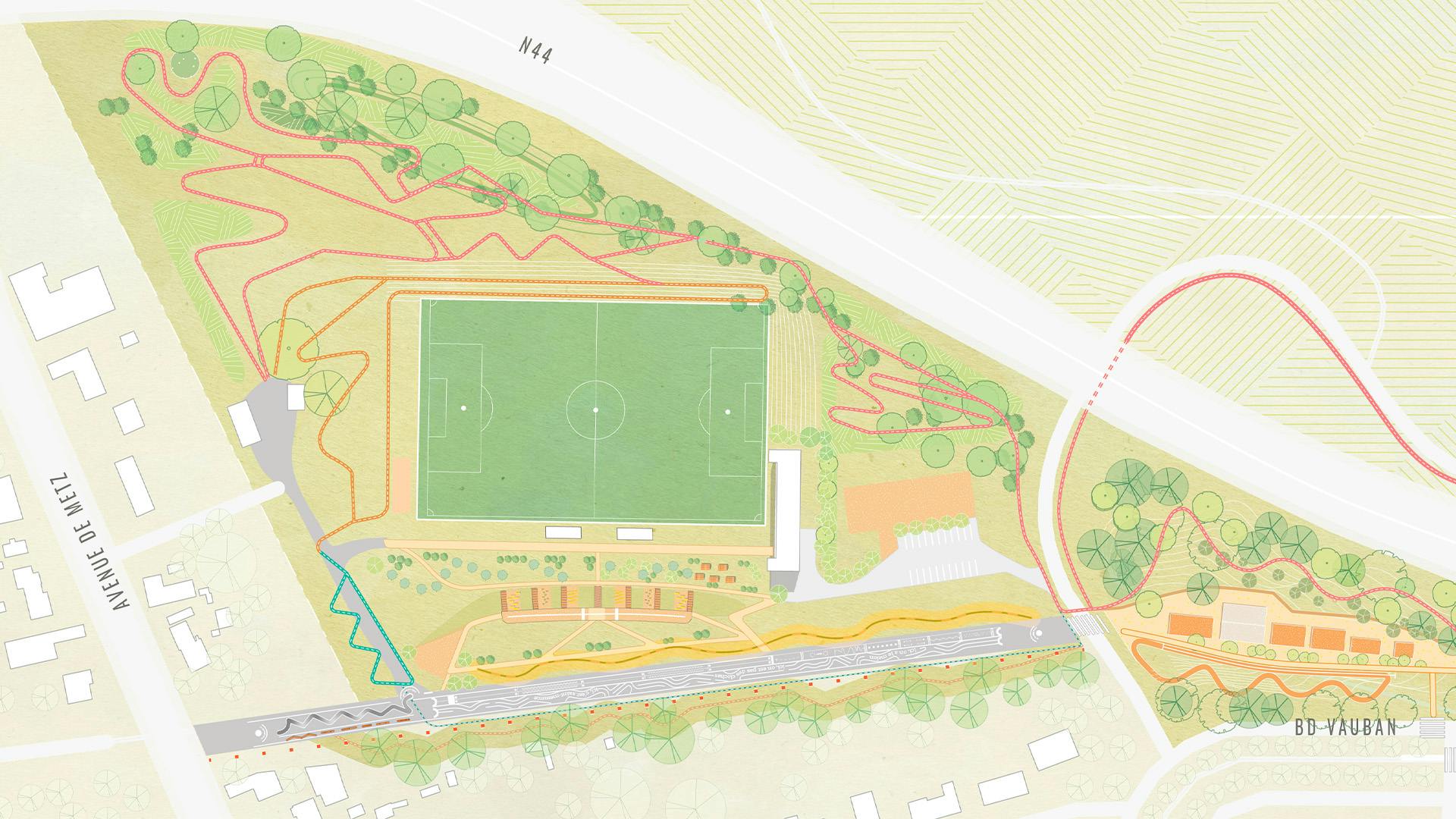 The small town of Saint-Memmie is located on the outskirts of Châlons-en-Champagne, between "city and fields". The proposed site for the sports park builds on existing infrastructure, including football fields, as well as a nature walk through the heart of a wooded area. It is also situated at the edge of a residential neighborhood. However, the site remains fragmented, due to roadside and leftover spaces.