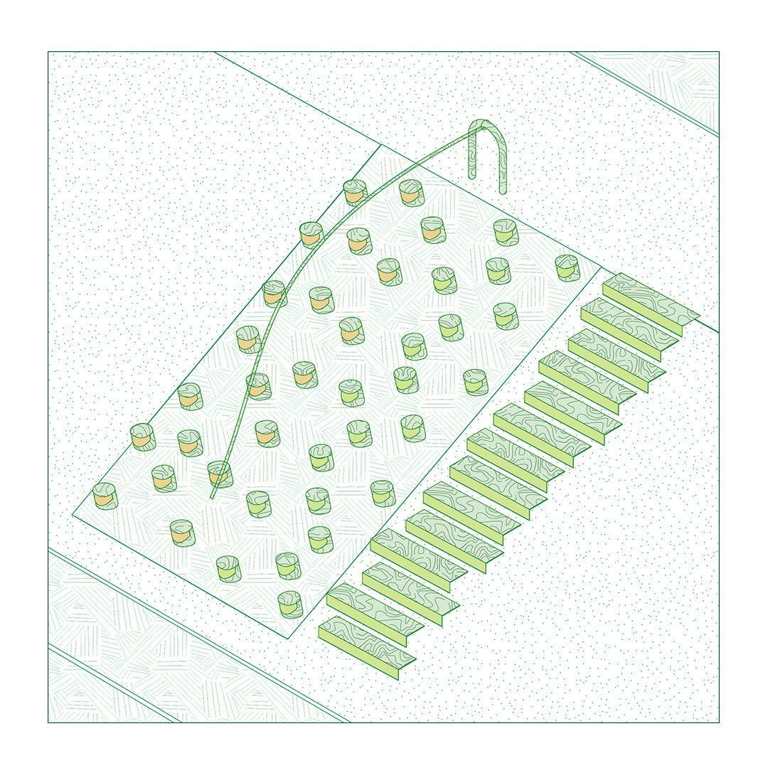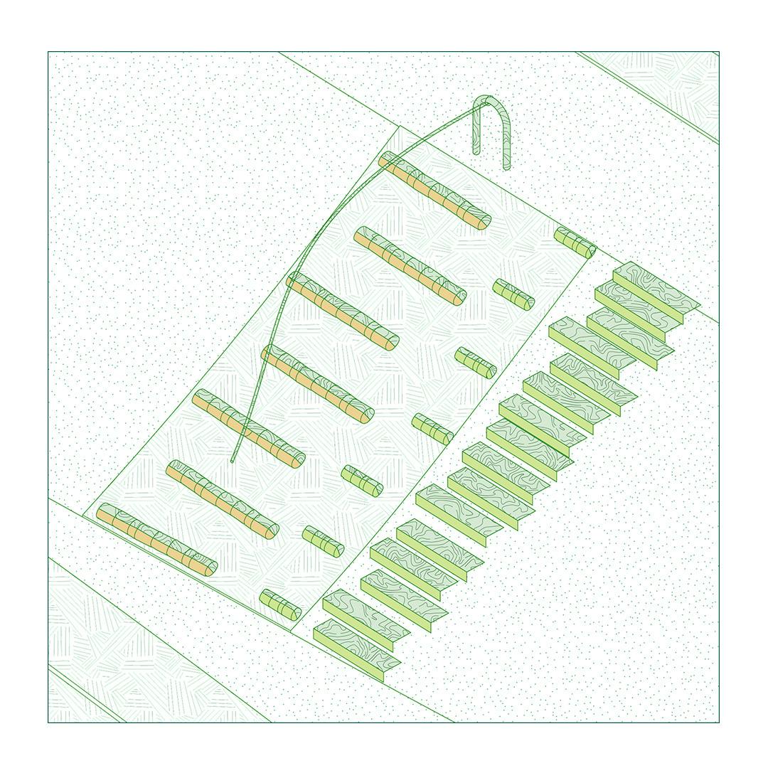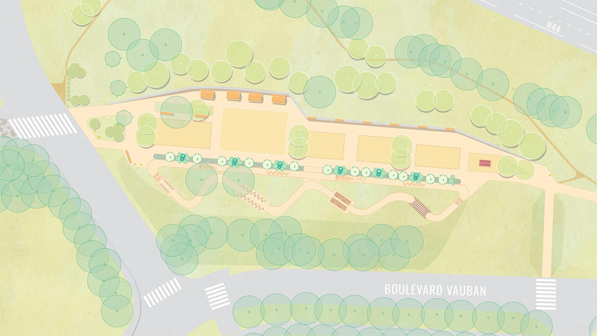 The small town of Saint-Memmie is located on the outskirts of Châlons-en-Champagne, between "city and fields". The proposed site for the sports park builds on existing infrastructure, including football fields, as well as a nature walk through the heart of a wooded area. It is also situated at the edge of a residential neighborhood. However, the site remains fragmented, due to roadside and leftover spaces.
