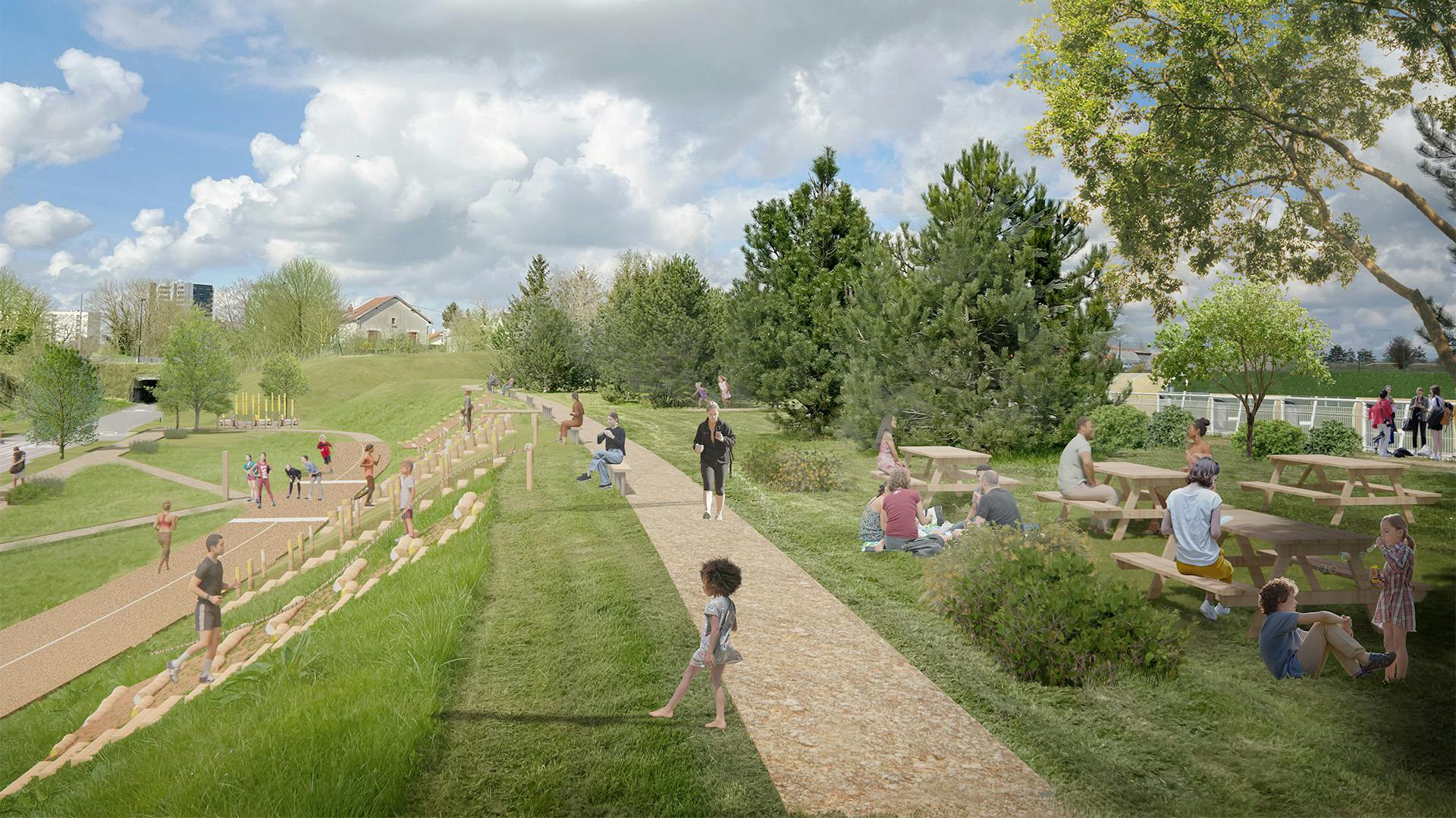 These installations are integrated into former roadside wastelands and embankments, taking advantage of the site’s unique topography. The park follows a co-design approach, involving two major local sports associations present on-site, as well as neighborhood associations.