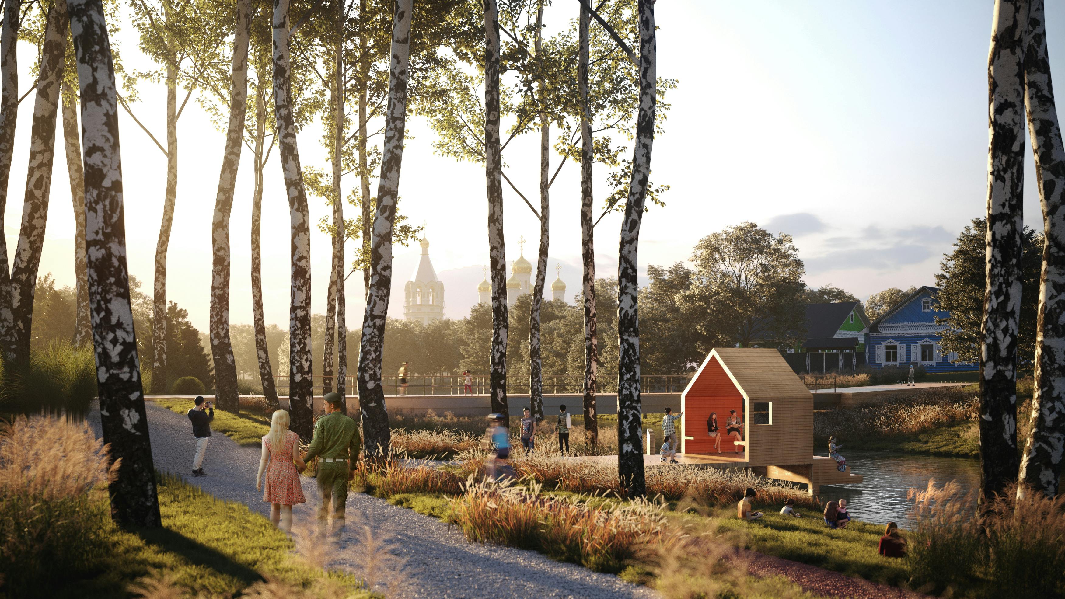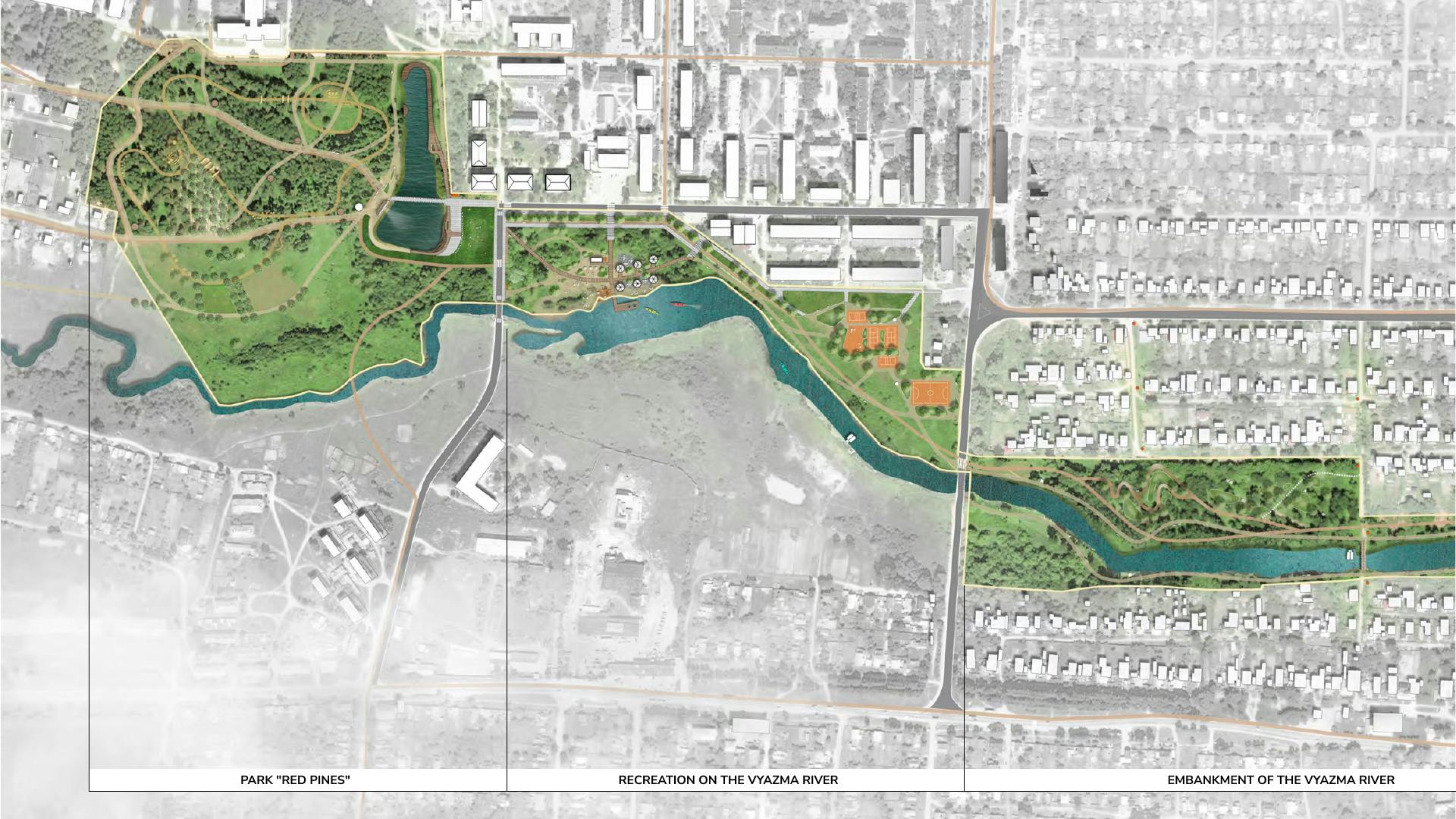 In 2020, the first stage of the project was implemented around the recreation area "Red pines", located next to an old red pine forest. A city beach was created along the Vyazma embankment with three distinct piers for fishing and recreational activities, a playground made from tree trunks, and a picnic area. An amphitheater was located on one side of a large pond, and next to it is a small stage for community events. The natural character of the zone is emphasized by the smooth curves of the new paths inscribed in the relief.