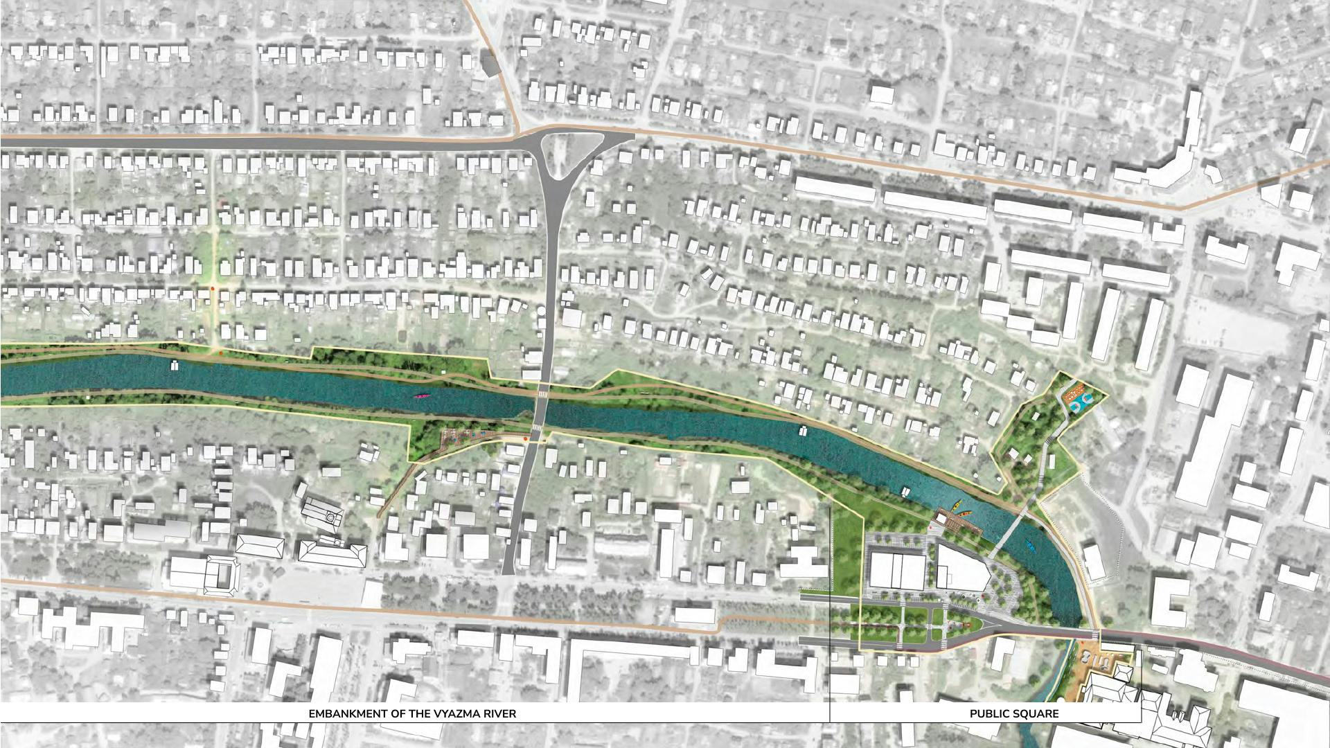 New public spaces along the river will be connected by a system of routes: walking, cycling, sports ("health path"). On the axis along the river, special objects are planned on the location of historical “washing houses” used by the textile industry, to reinforce the place making.