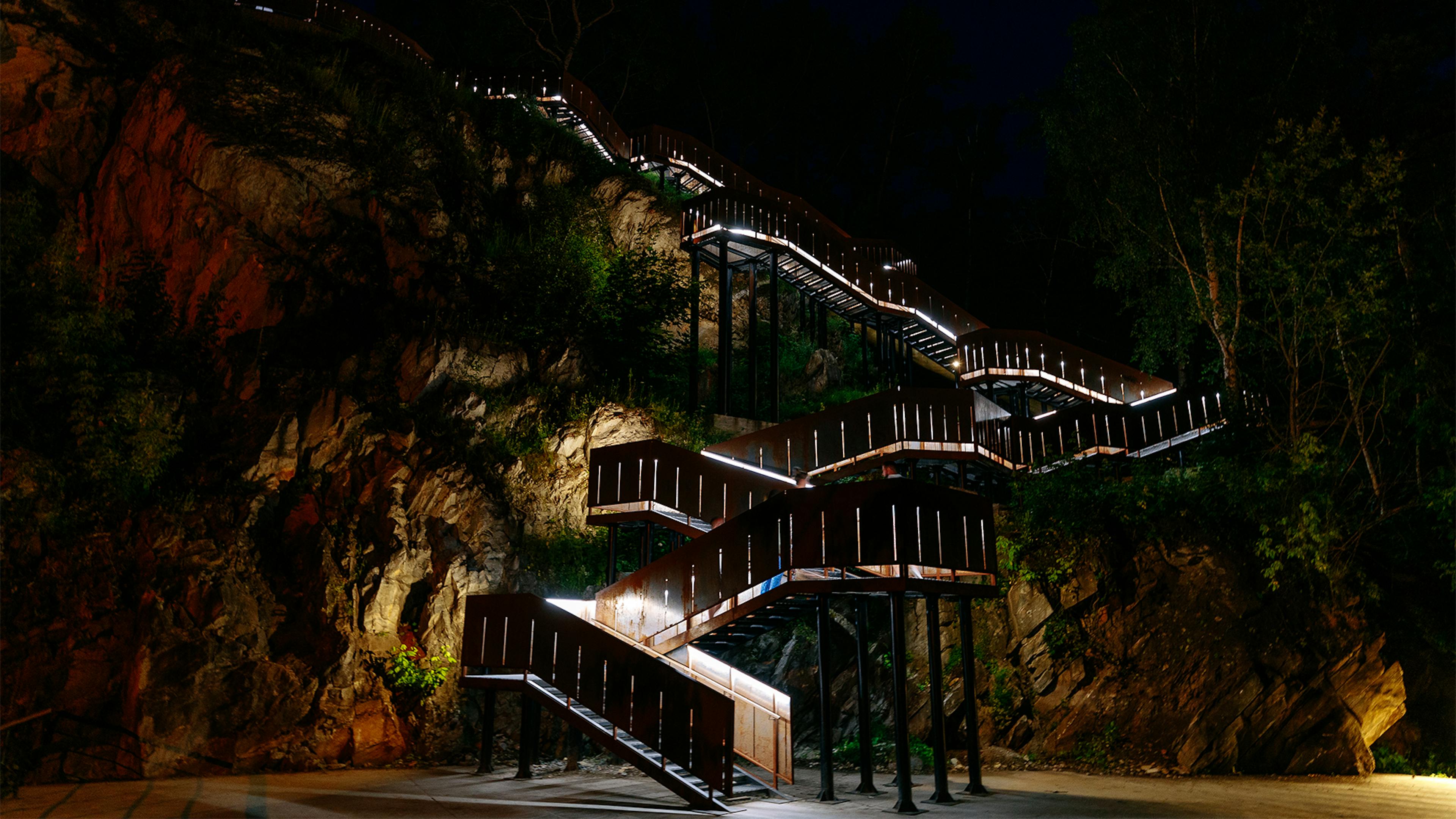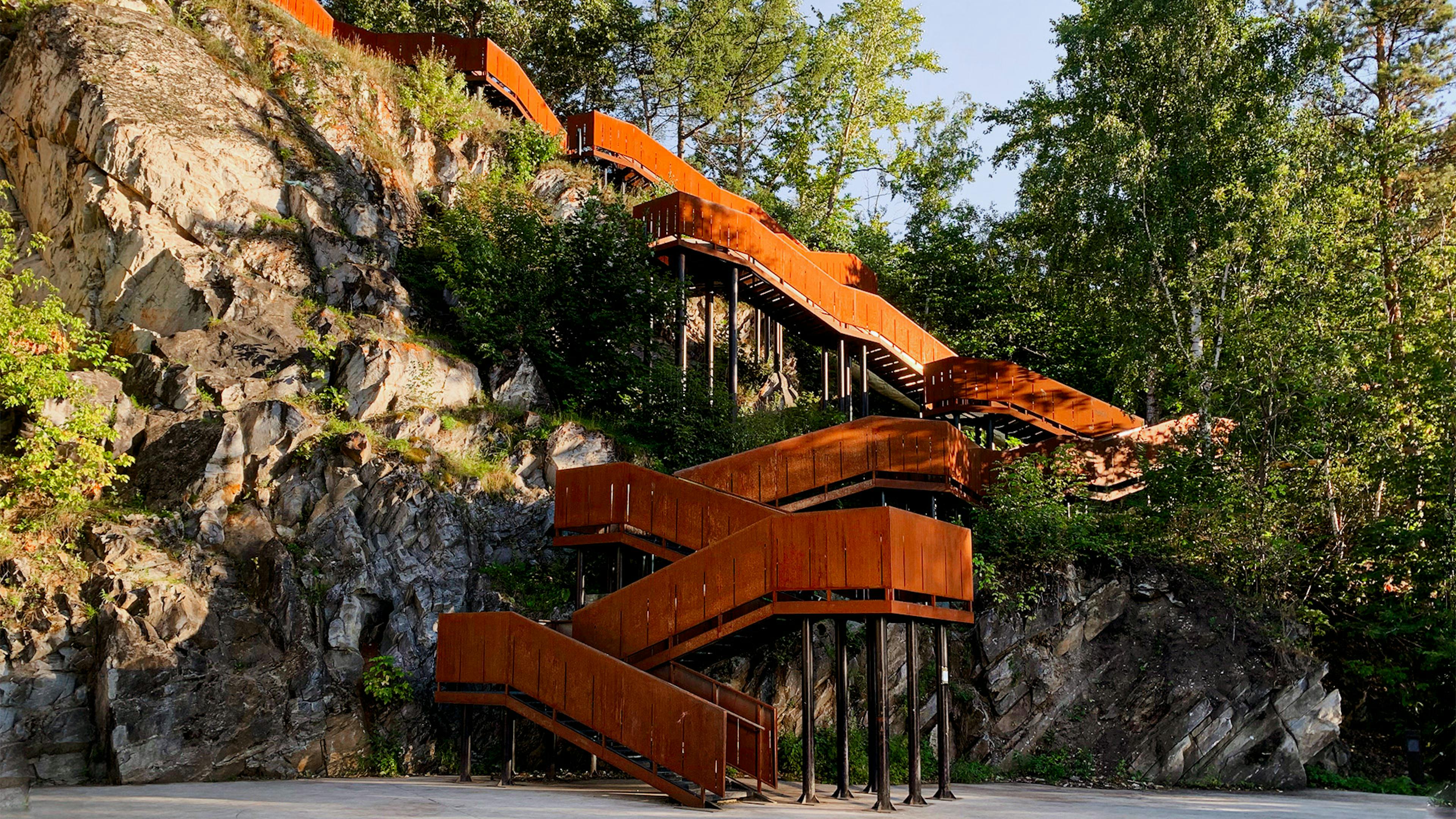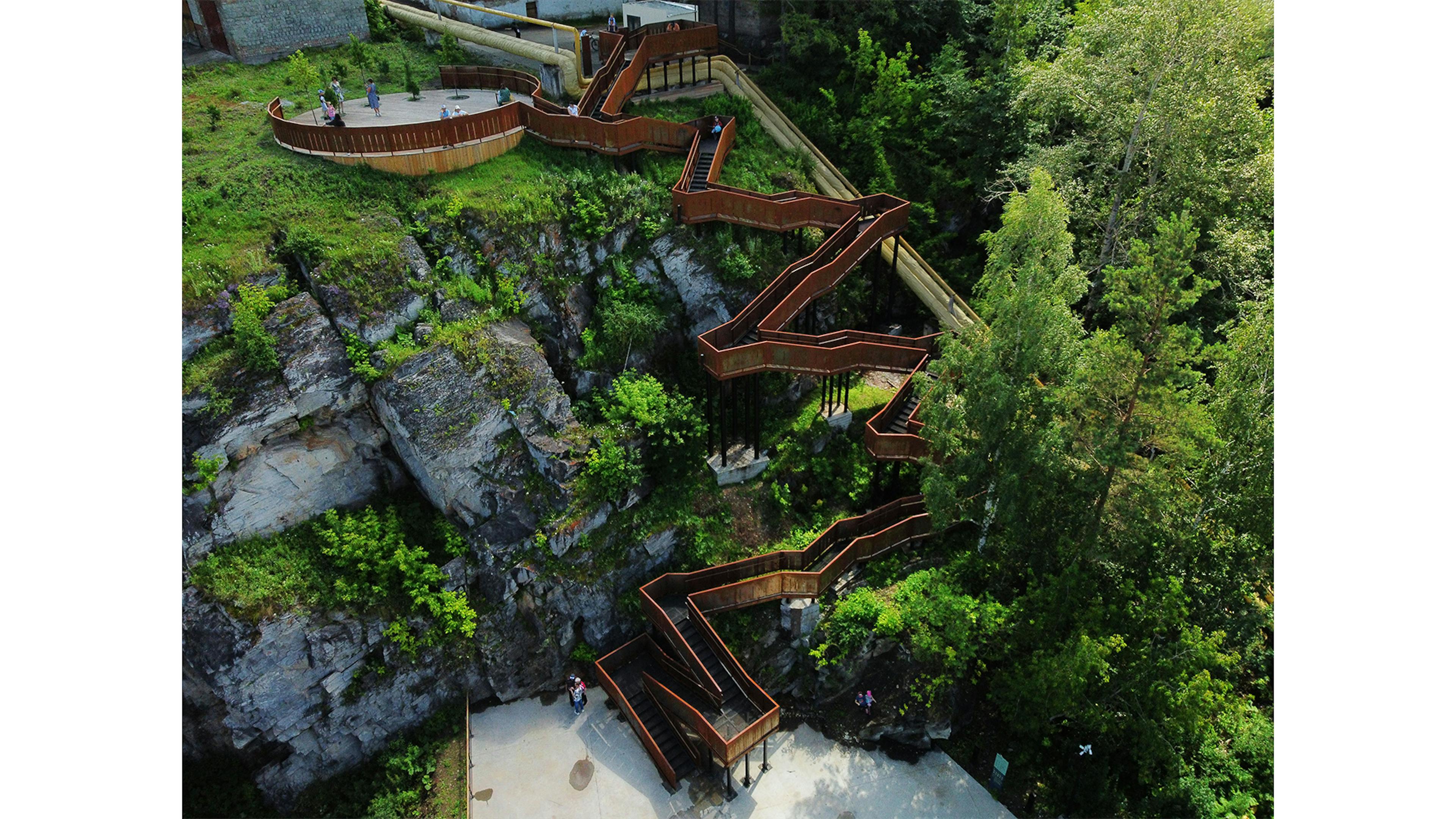 Лестница в виде металлической ленты, построенная в 2021 году, объединяет в себе место для скалолазания и смотровую площадку на вершине скалы высотой 20 метров. Она создаёт непрерывную связь между нижней и верхней частью нового парка в Белорецке на Южном Урале. Мы выбрали кортеновскую сталь и металл, чтобы создать «эффект монолита», который будет контрастировать со сложностью геологических линий и разнообразной цветовой палитрой горных пород. Лестница, как лента, скользит по скале, обеспечивая разные точки обзора на пути. Использование металла является символической связью с металлообрабатывающей промышленностью города, создающей симбиотическое, а иногда и противоречивое отношение между природой и человеком.