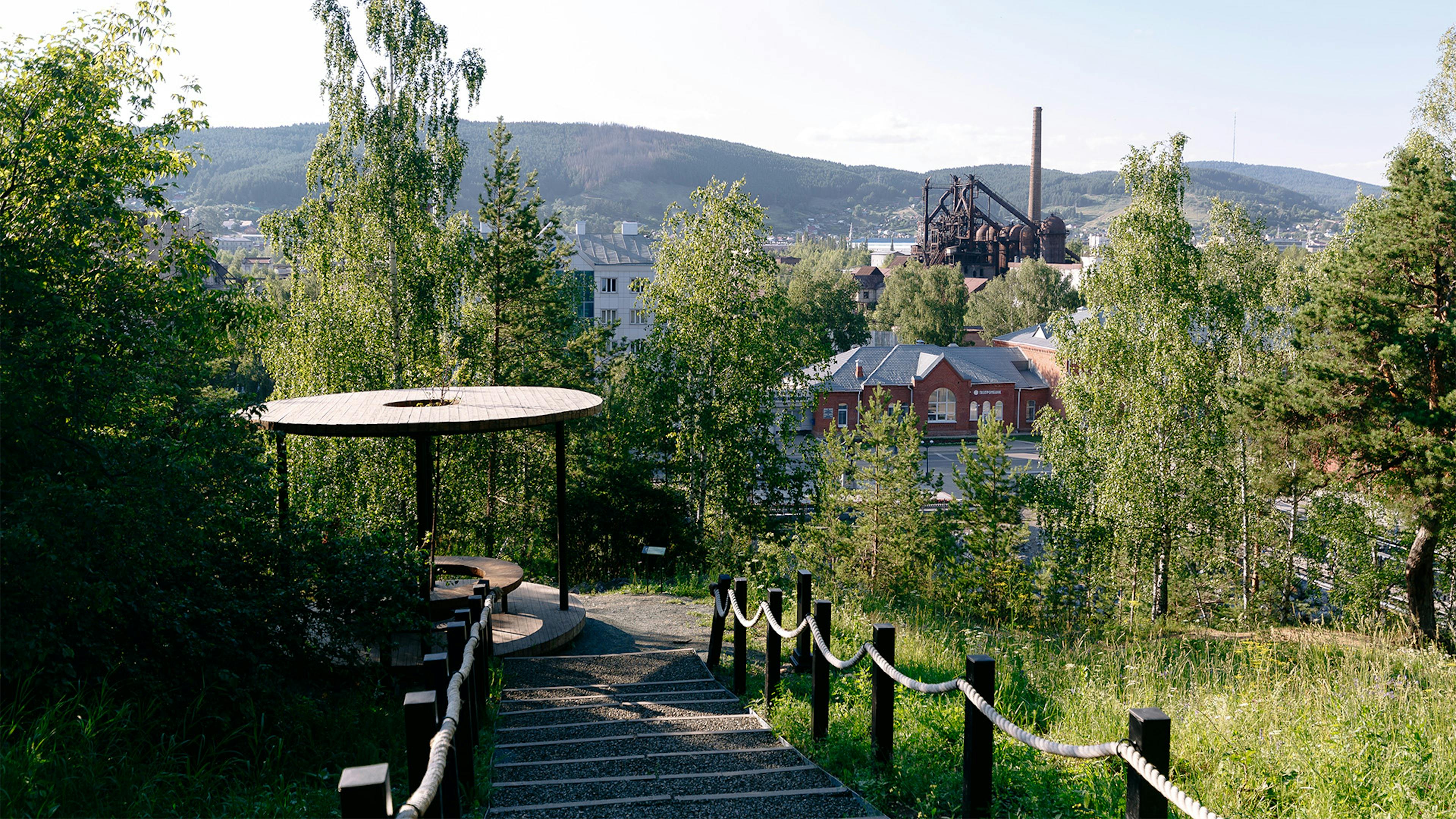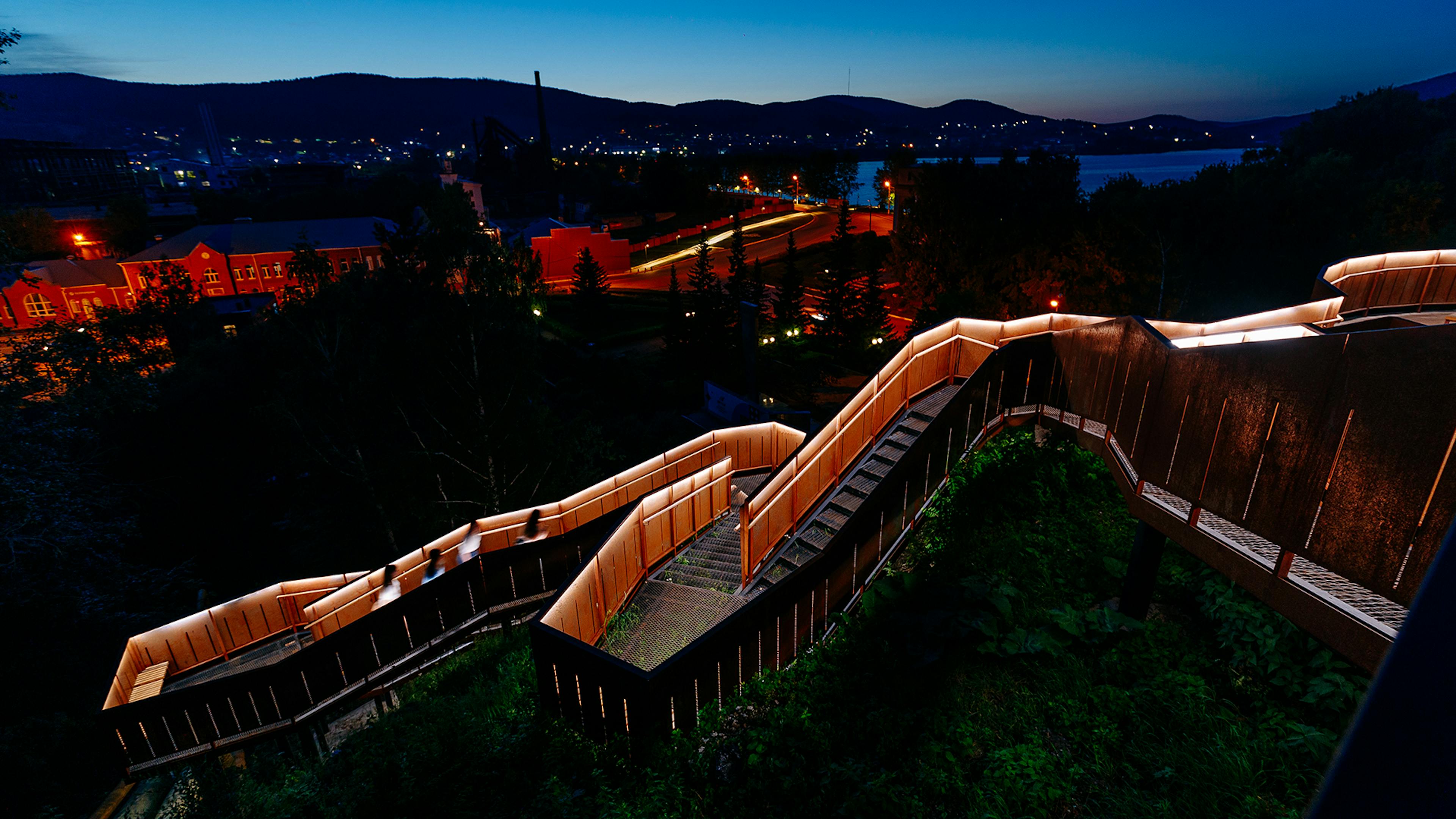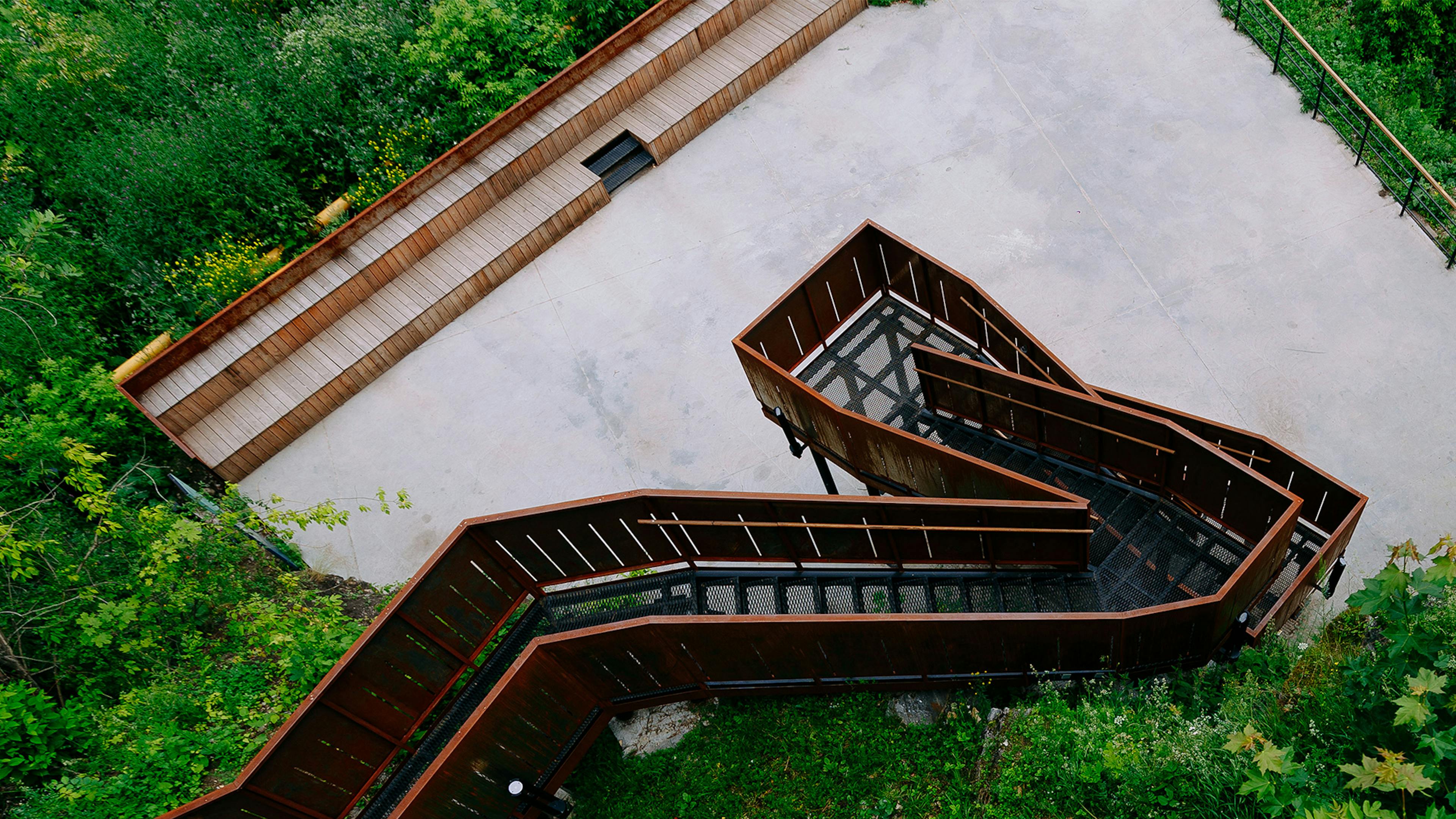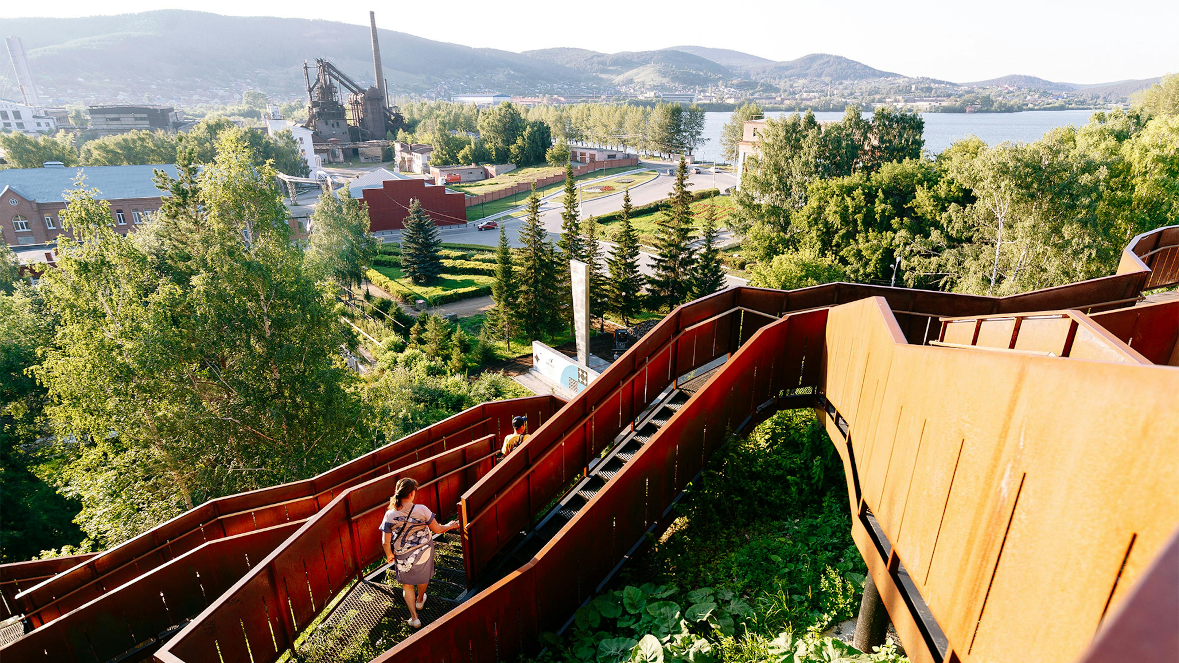 Лестница в виде металлической ленты, построенная в 2021 году, объединяет в себе место для скалолазания и смотровую площадку на вершине скалы высотой 20 метров. Она создаёт непрерывную связь между нижней и верхней частью нового парка в Белорецке на Южном Урале. Мы выбрали кортеновскую сталь и металл, чтобы создать «эффект монолита», который будет контрастировать со сложностью геологических линий и разнообразной цветовой палитрой горных пород. Лестница, как лента, скользит по скале, обеспечивая разные точки обзора на пути. Использование металла является символической связью с металлообрабатывающей промышленностью города, создающей симбиотическое, а иногда и противоречивое отношение между природой и человеком.
