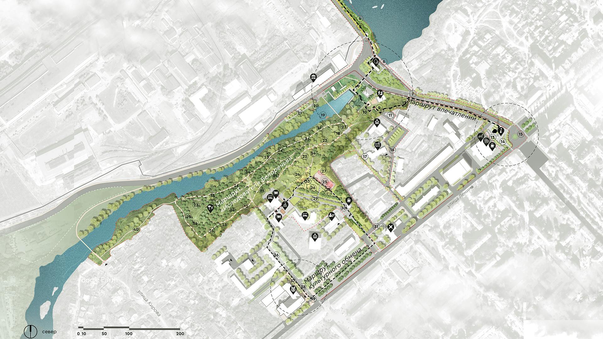Проект реновации парка культуры и отдыха и прибрежных территорий г. Белорецка включает в себя планировку «Квартала вдохновения» с созданием маршрутов, отвечающих на три основные задачи: соединить части города, подарить площадки для вдохновения, открыть культуру и науку Белорецка для всех. Маршруты включают в себя общественные зоны с образовательными, культурными и спортивными функциями, а также главные событийные зоны квартала в отреставрированном городском парке культуре и отдыха.