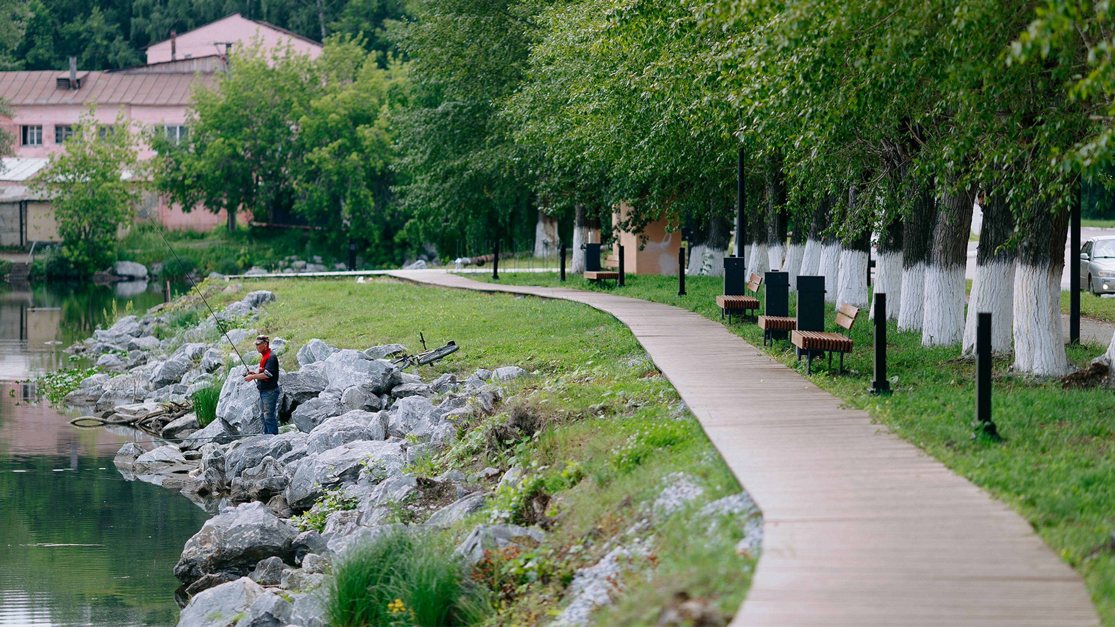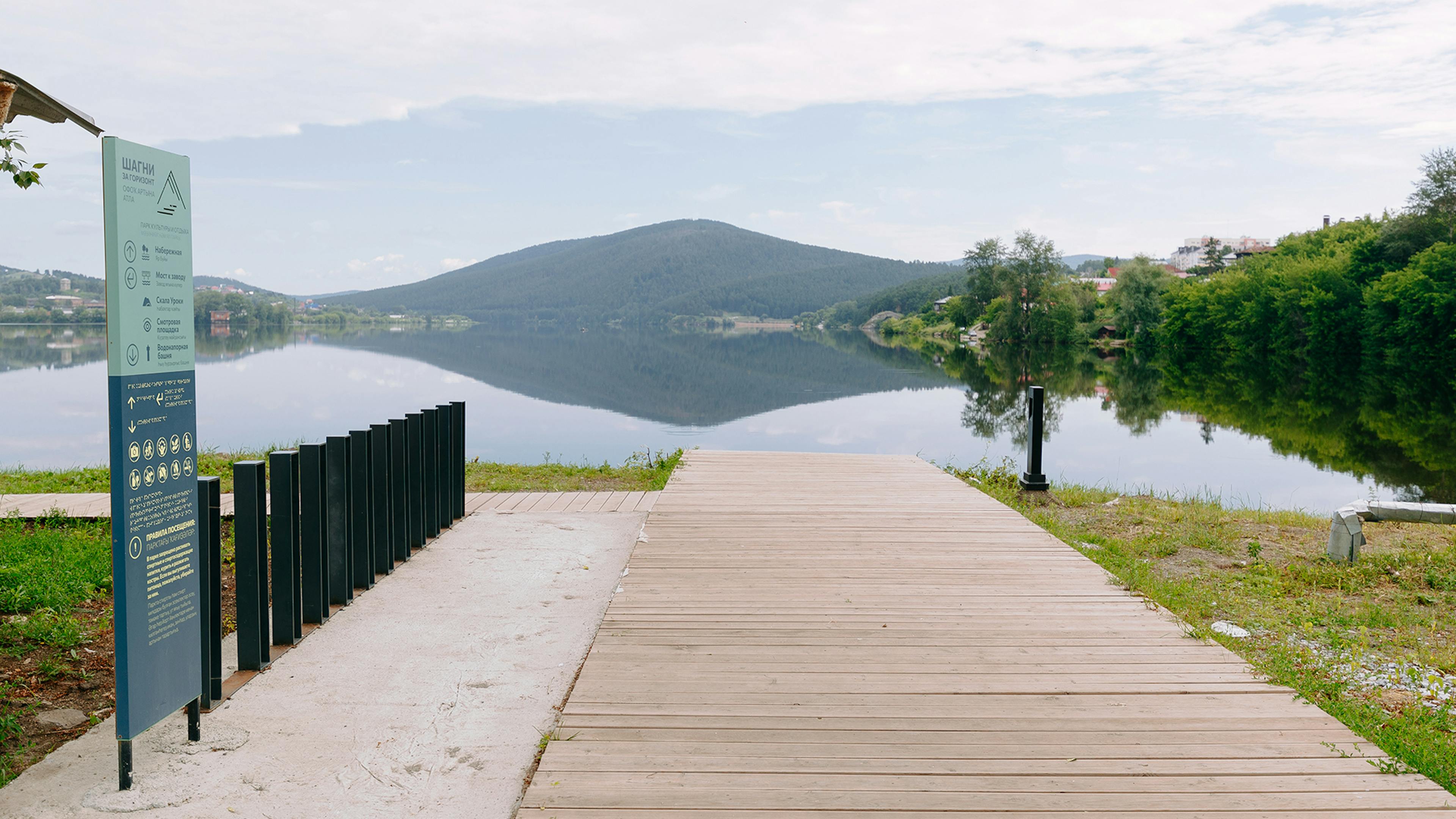 На набережной Белорецкого пруда были создана деревянная прогулочная дорожка по берегу с местами для сидения и отдыха. Отсюда можно полюбоваться панорамой гор и пруда.