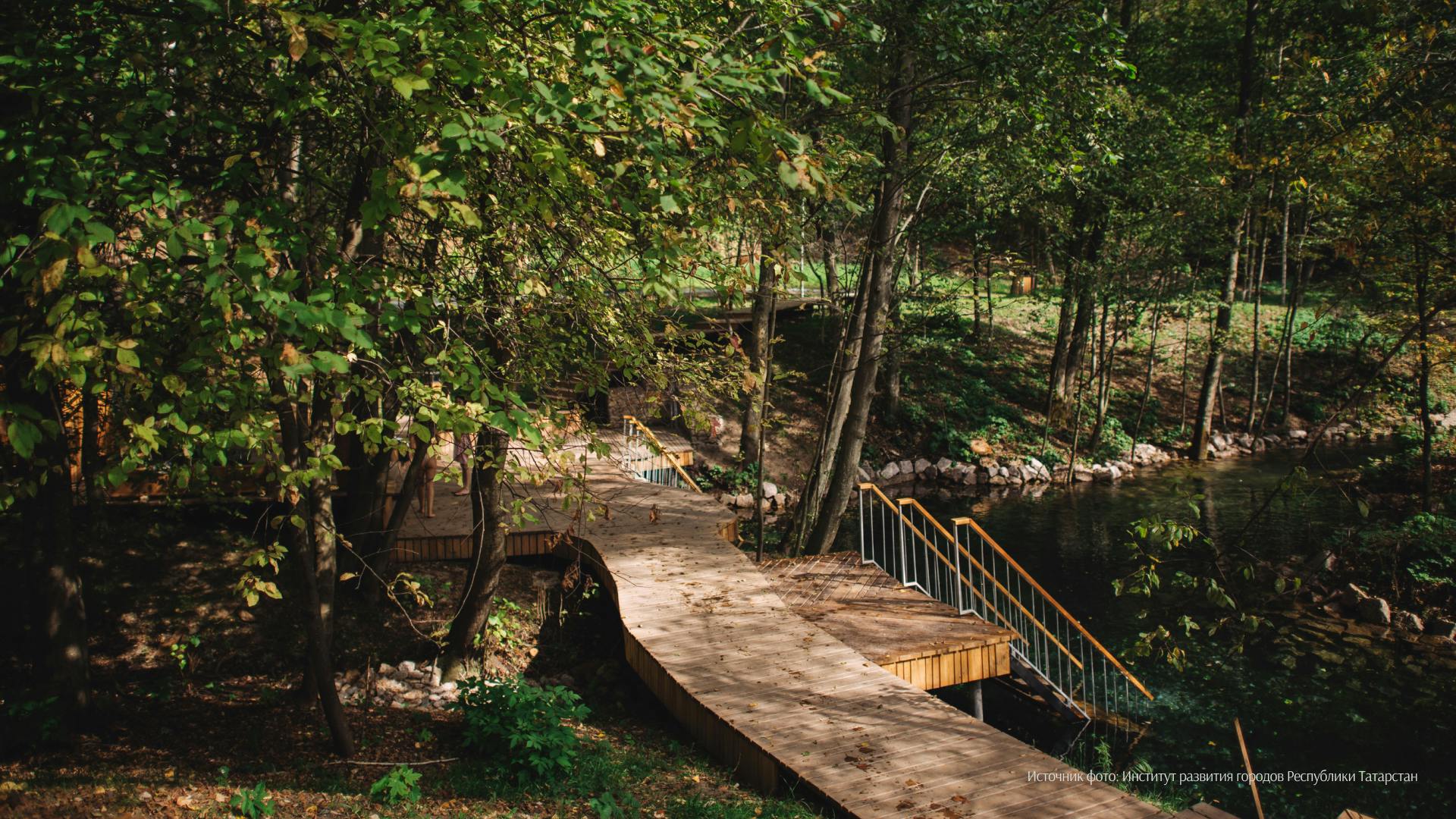 Для распределения потоков посетителей и формирования новых практик взаимодействия на территории Большого Голубого озера предусмотрены тематические велопешеходные маршруты, раскрывающие экологическую и историческую ценность места. Так как концепция кластера «Зеркала Татарстана» основана на принципах экотерапии, в рамках проекта реализован специализированный экотерапевтический маршрут. Он включает зоны для дыхательных практик и медитации, а также уникальные арт-объекты «Обитатели леса», способствующие глубокому сенсорному контакту с природой через активацию различных органов чувств.