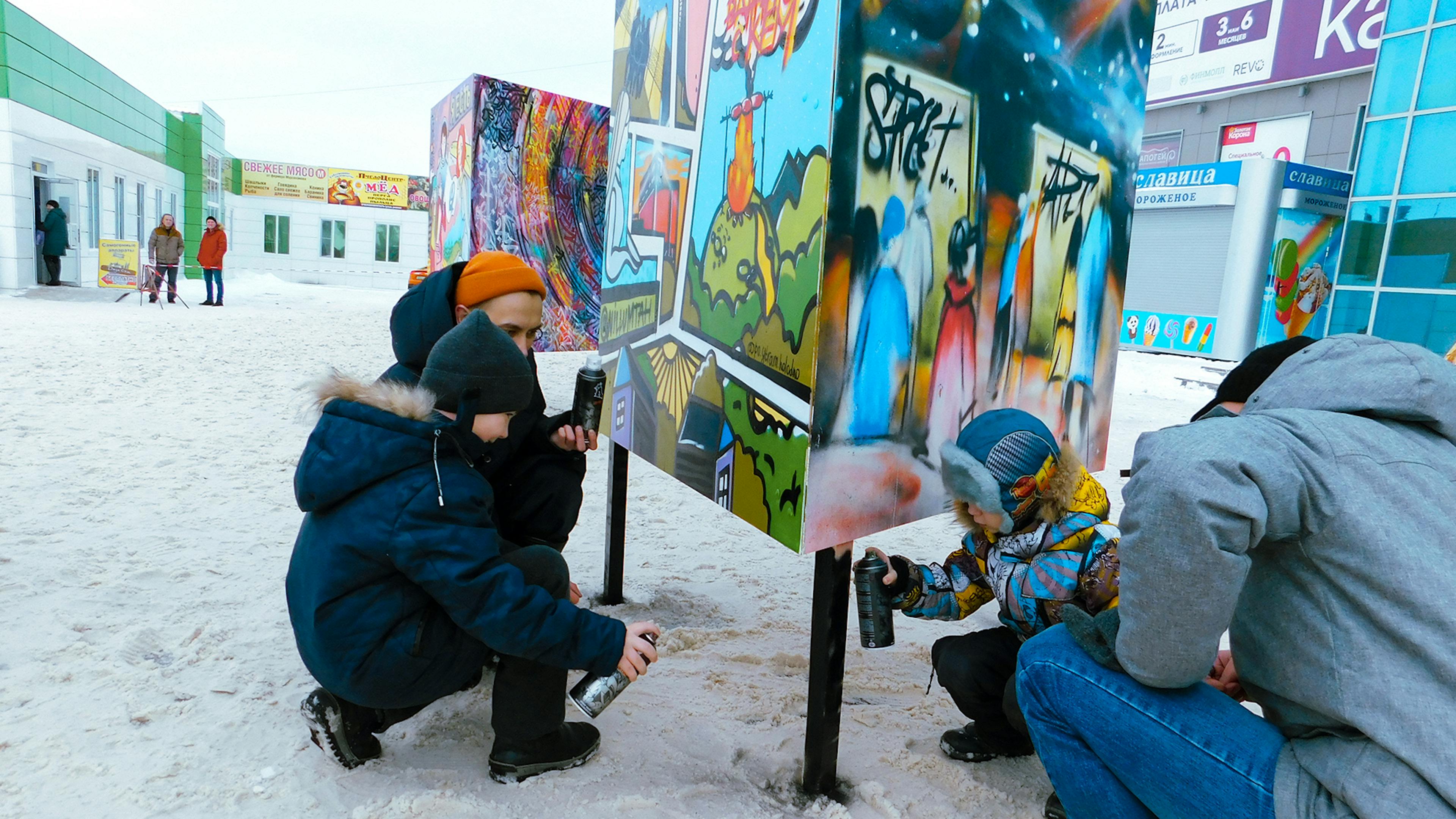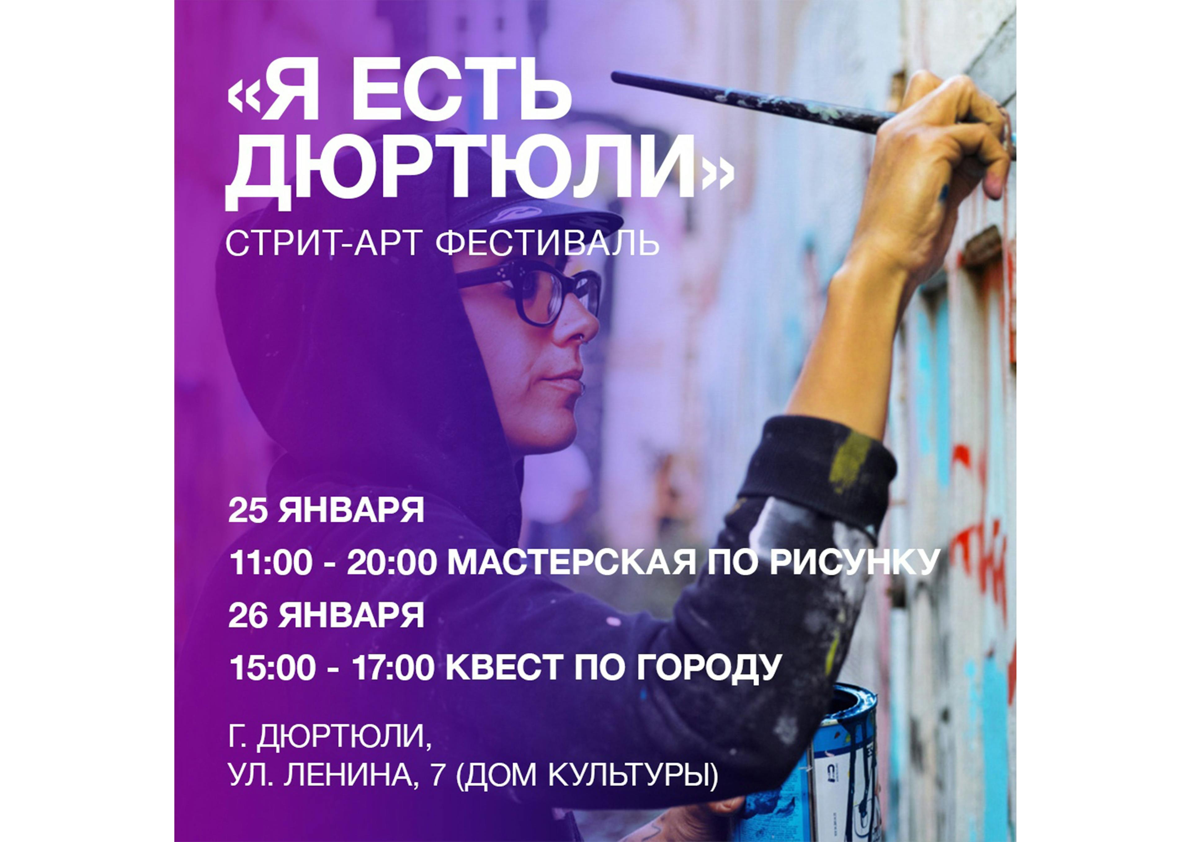 В рамках вовлечения горожан в проект мы организовали и провели первый в Дюртюлях зимний фестиваль уличного искусства. Приглашенные из Уфы художники Олег Кайбышев, Римад Ниллумтах и Мансур Зияев помогли участникам создать портреты себя в будущем — работы были выставлены в местном ТЦ. Фестиваль помог нам убедиться, что местная молодежь заинтересована в творческих проектах, и заложил начало работы с общественными пространствами Дюртюлей.