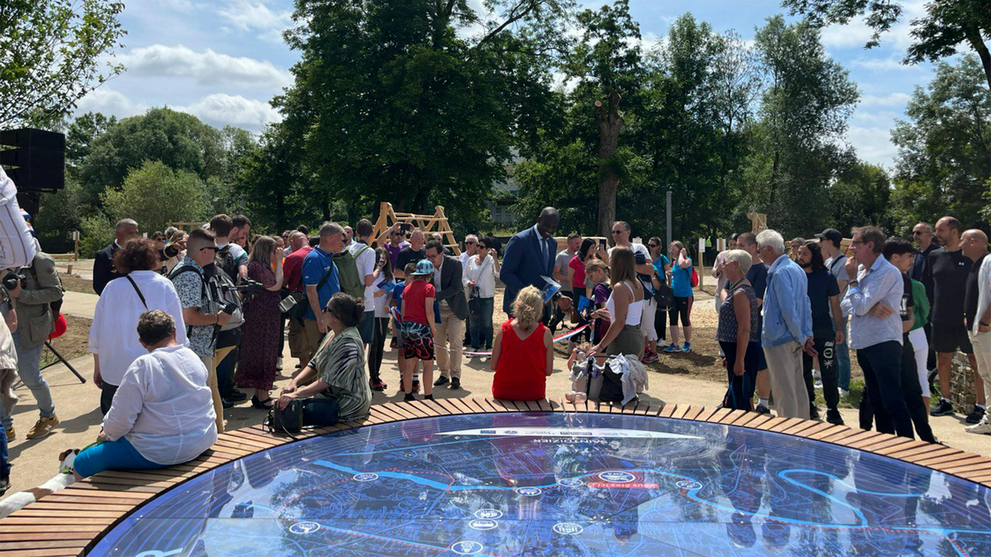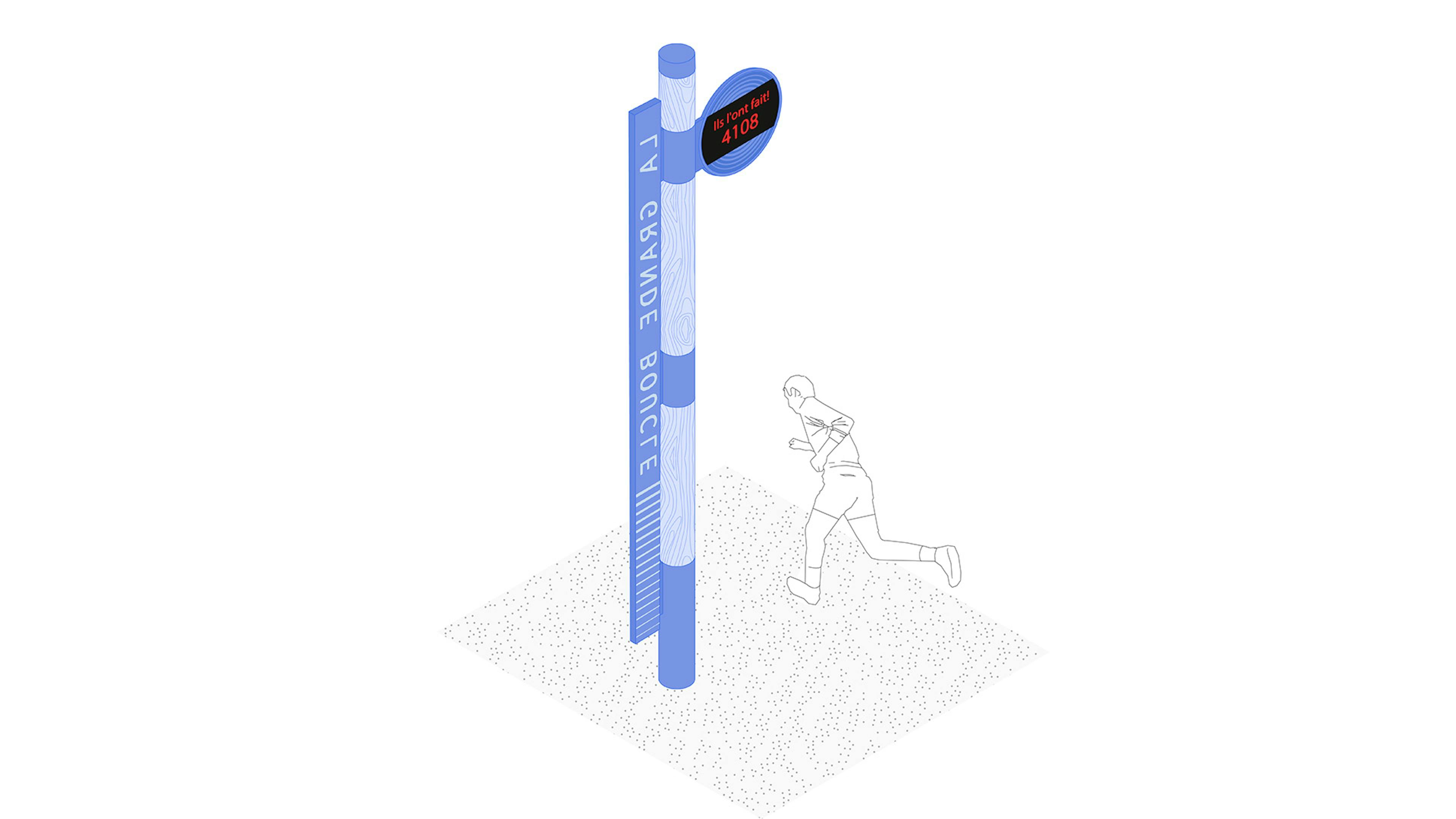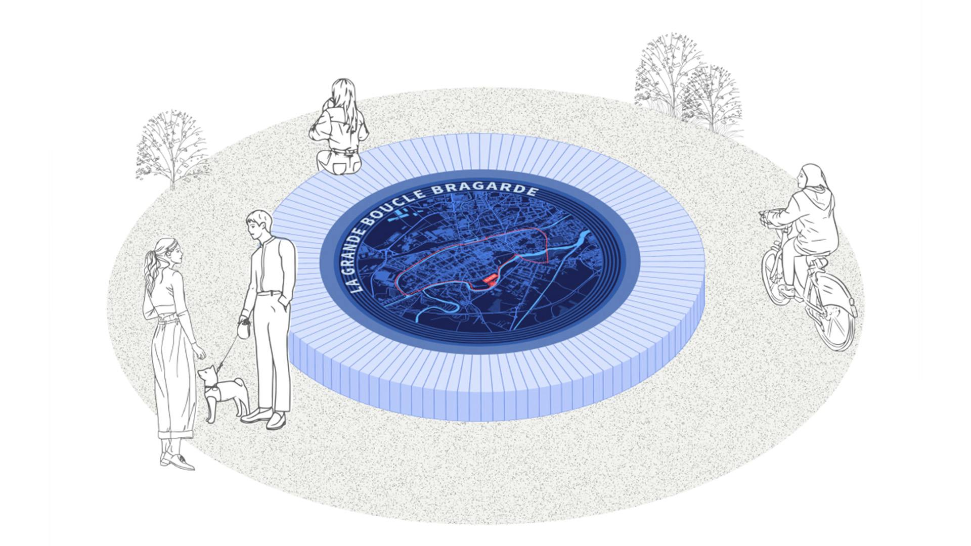 Скамья в виде круглой платформы с масштабной картой посредине знакомит с маршрутом и является его символической отправной точкой. Будучи расположенной в центре существующего спортивного парка, она естественным образом стала новым местом притяжения.