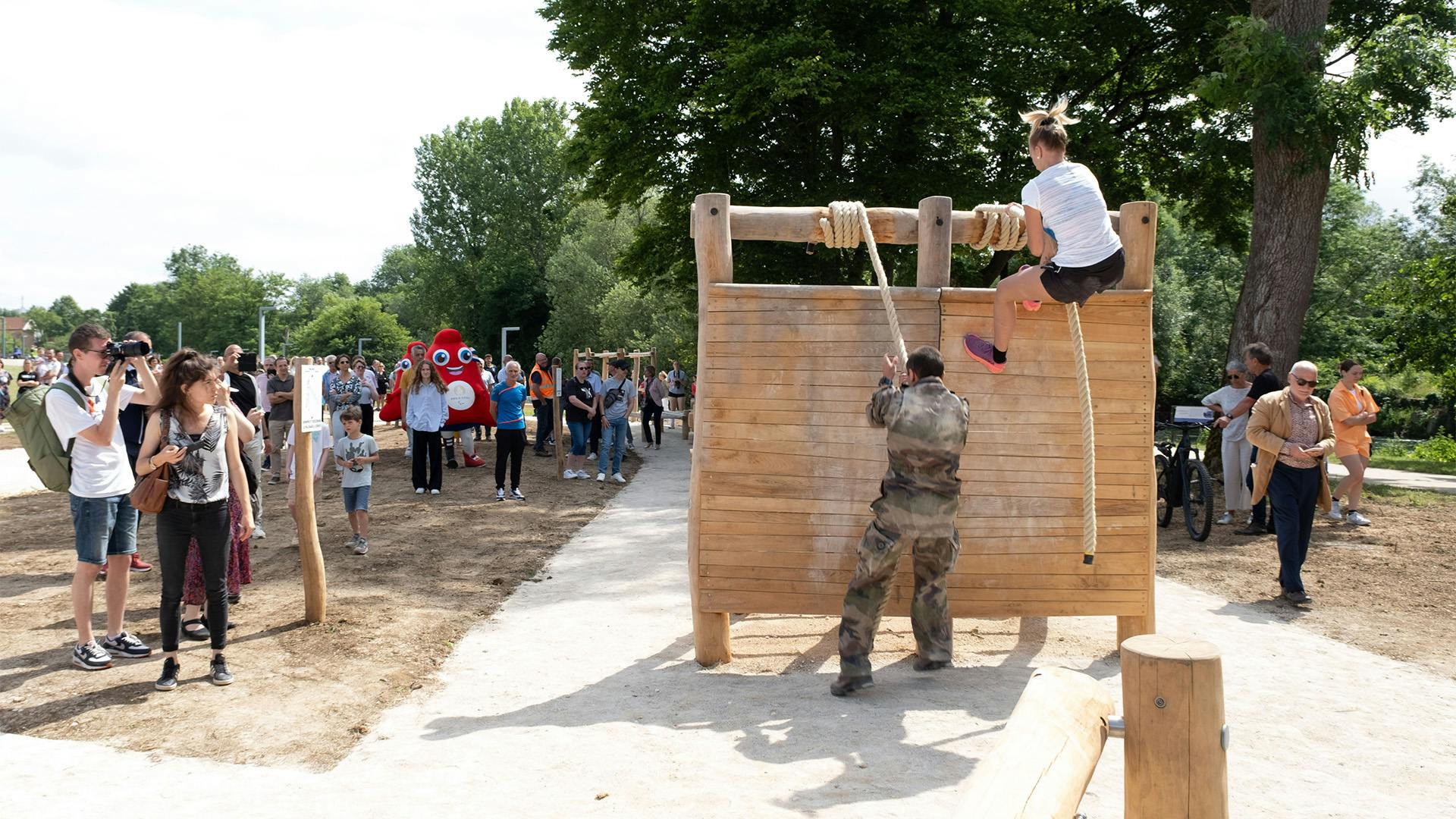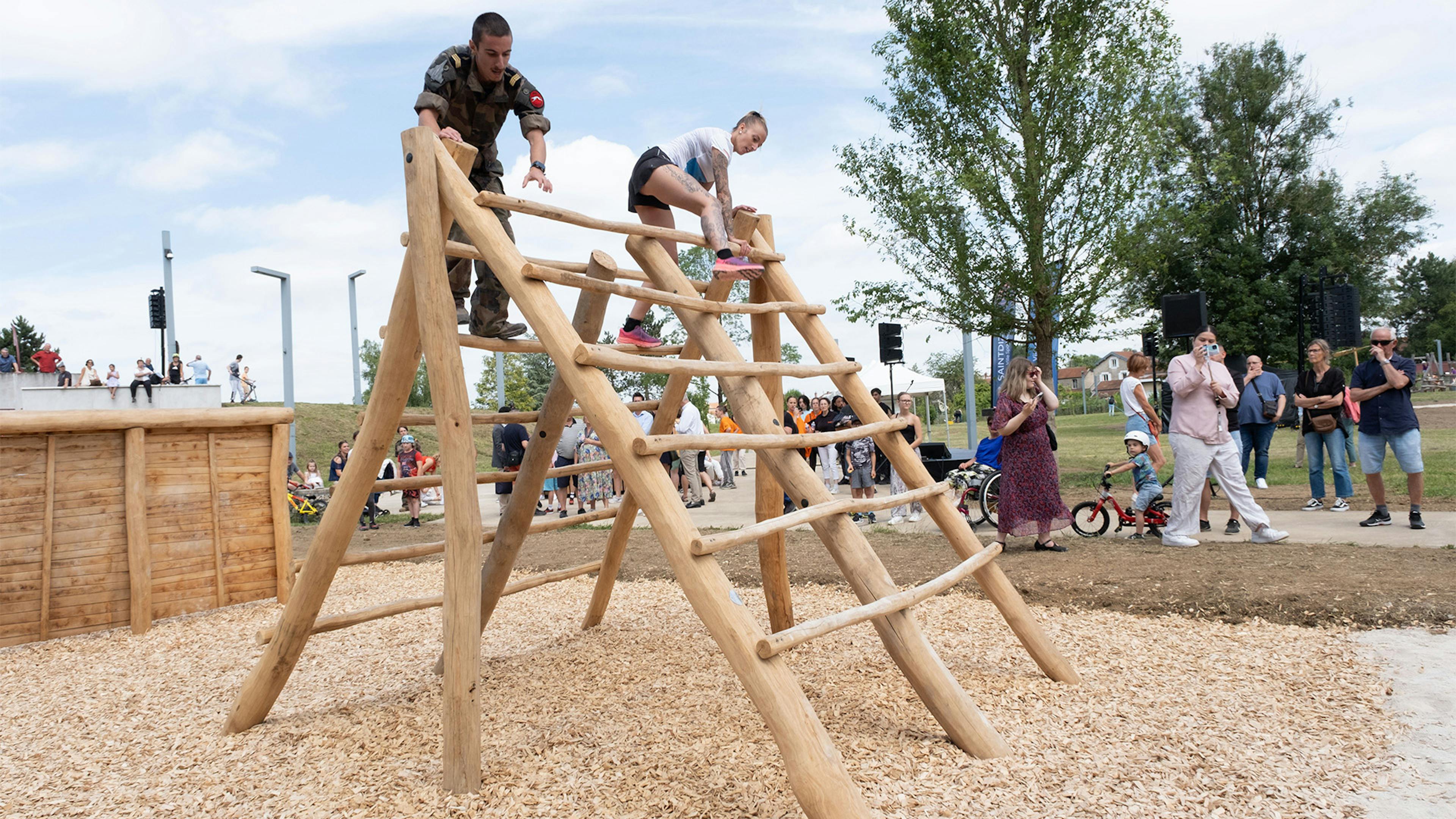 100-метровый участок маршрута включает десять специально спроектированных препятствий с препятствиями, бросая вызов подросткам и молодым людям проверить свою силу и ловкость, а встроенный секундомер позволяет фиксировать рекорды.