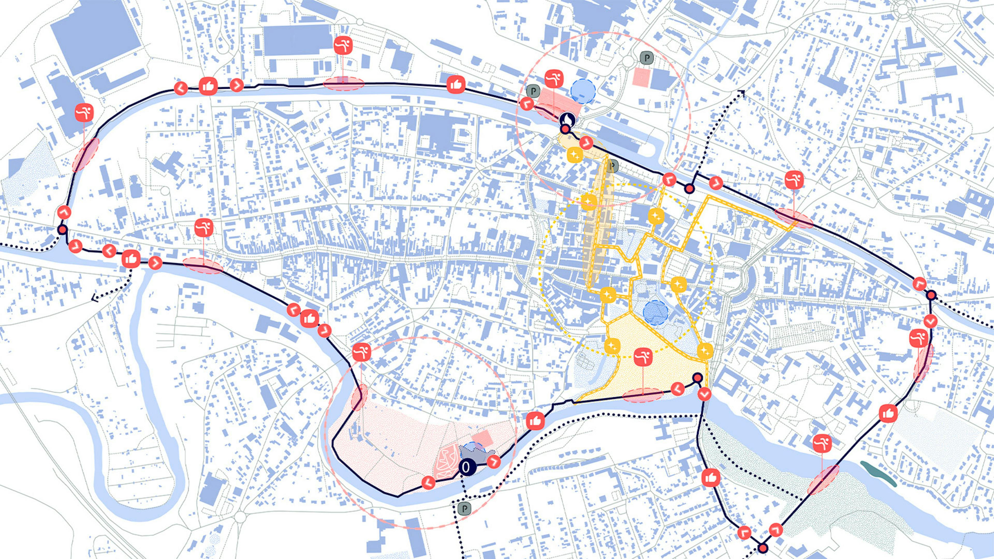 Идея проекта возникла в ходе проектных семинаров, посвященных развитию центра города. Этот масштабный 8-километровый маршрут, проложенный вдоль воды, отражает концепцию «активного города», где среда мотивирует к движению, предлагая различные варианты активностей. Специальные «спортивные станции», расположенные по всему маршруту, сочетаются с зонами для отдыха у воды, что позволяет учитывать запросы и возможности пользователей. Визуальный образ территории формируется за счет дизайна информационных и навигационных элементов, которые делают маршрут заметным в городском пространстве.
