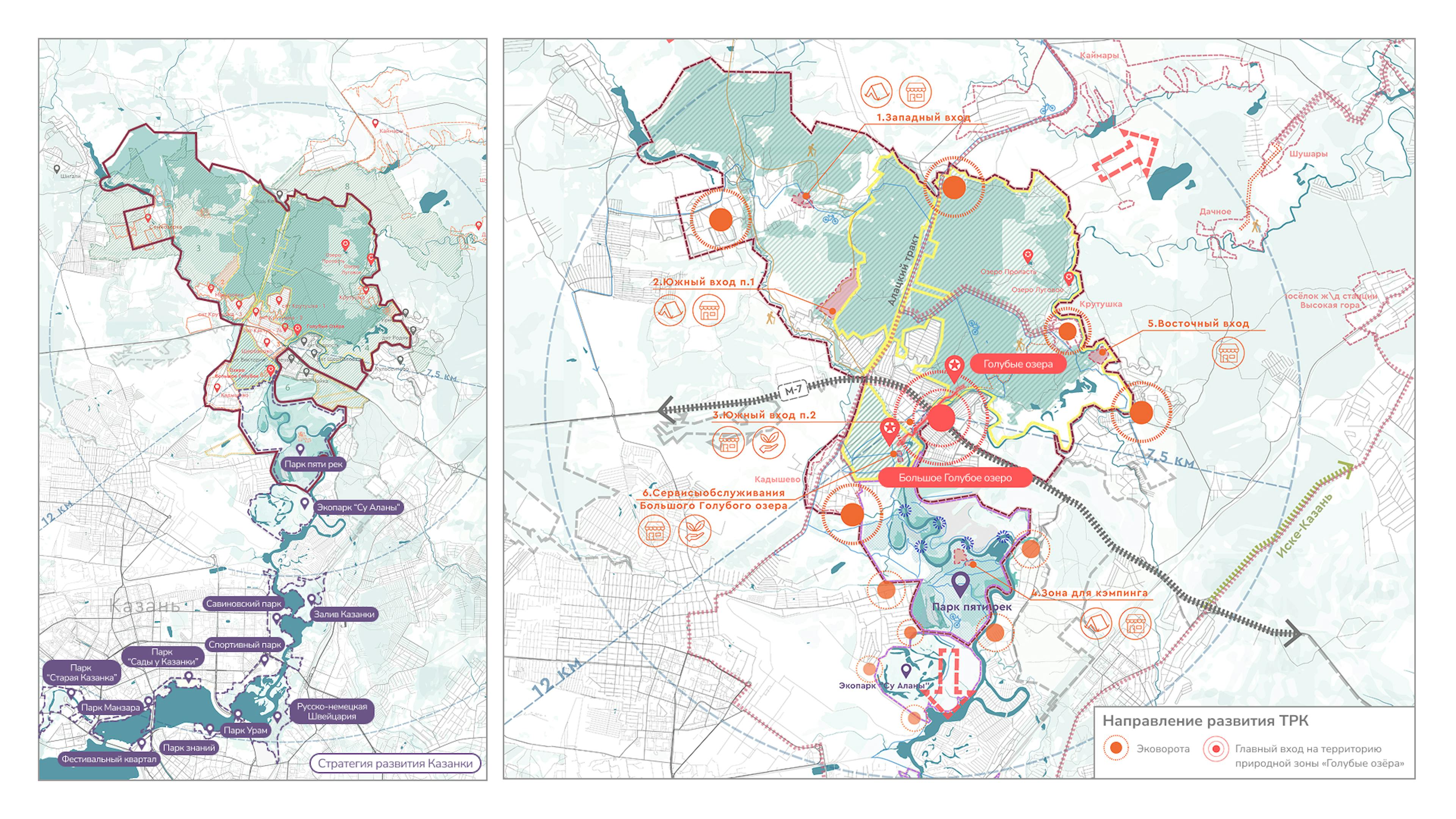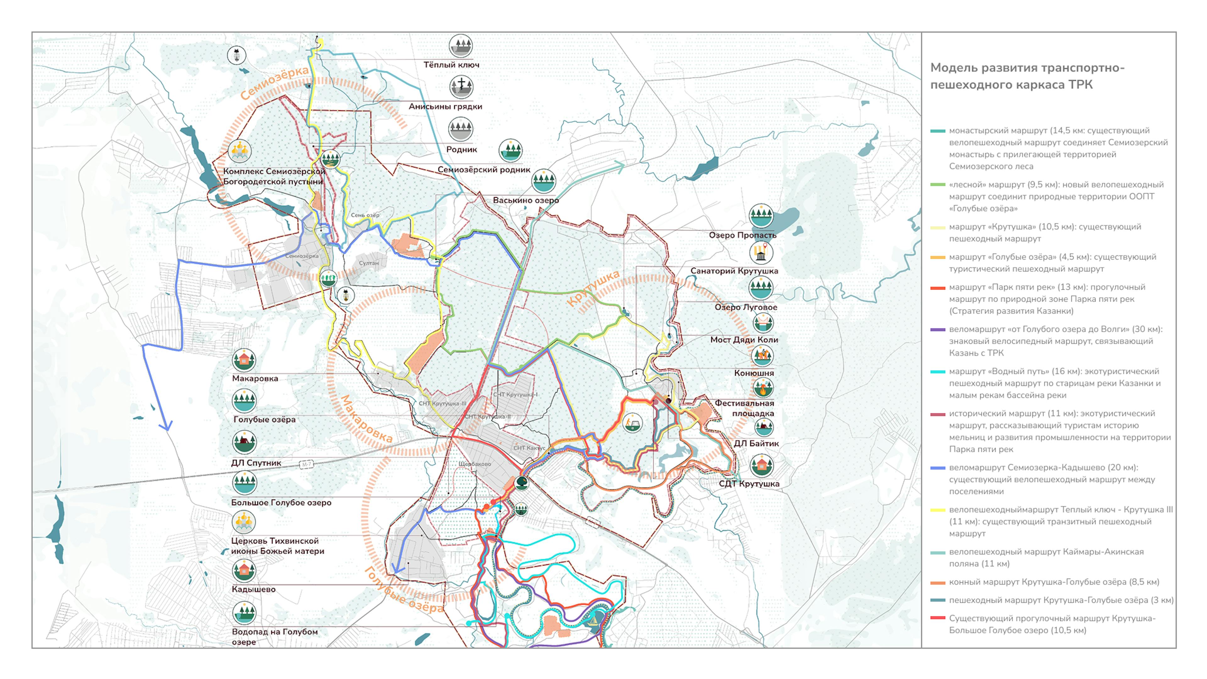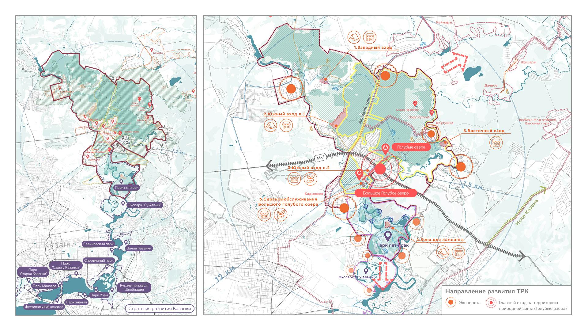 Голубые озера — главная точка притяжения кластера, которая сегодня страдает из-за повышенной антропогенной нагрузки. Проект поможет смягчить негативное влияние на ценную территории за счет более строгого режима охраны. Основным времяпрепровождением у озер станут прогулки и созерцание, а все активные функции будут перенесены на реку Казанку.