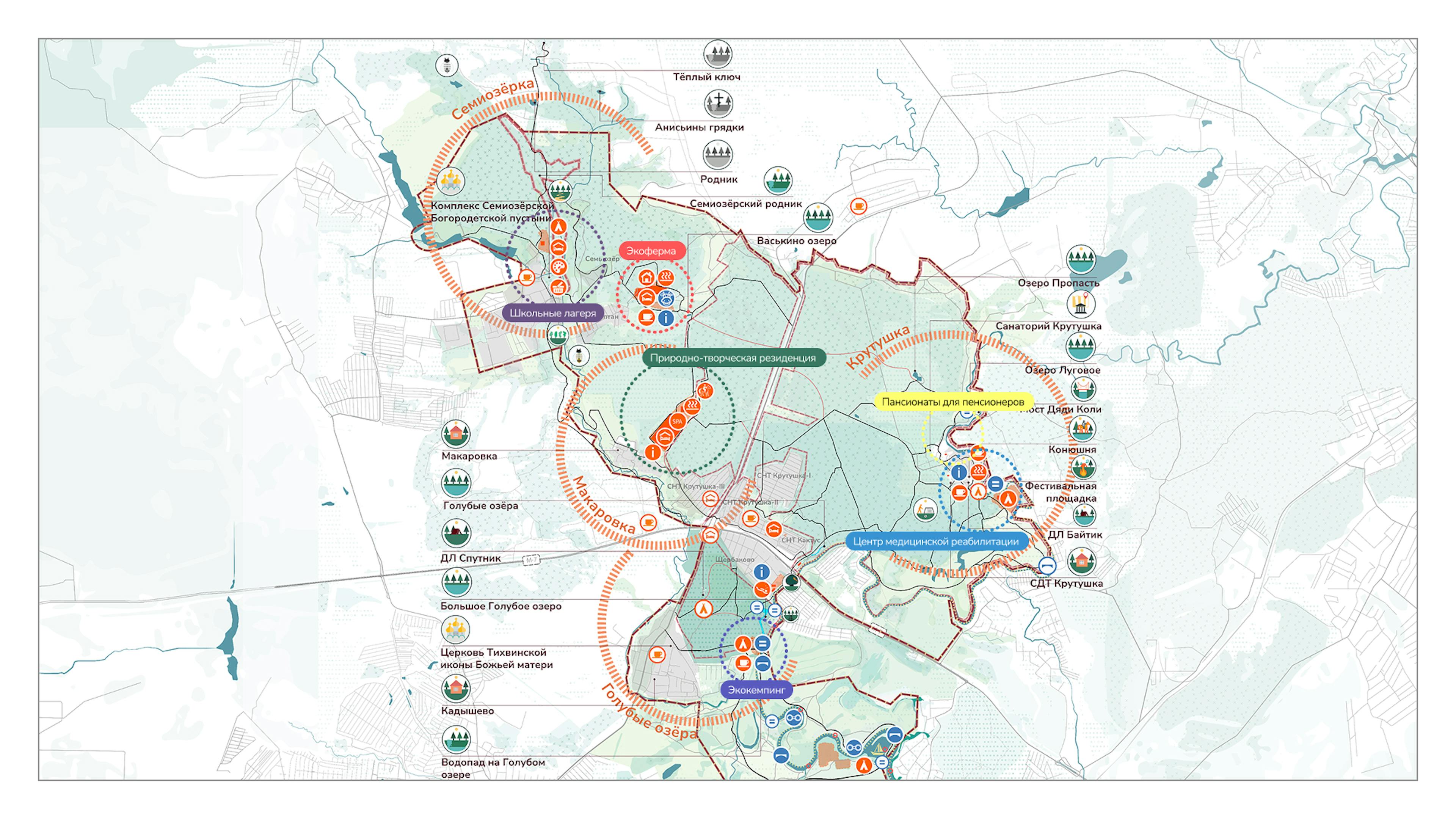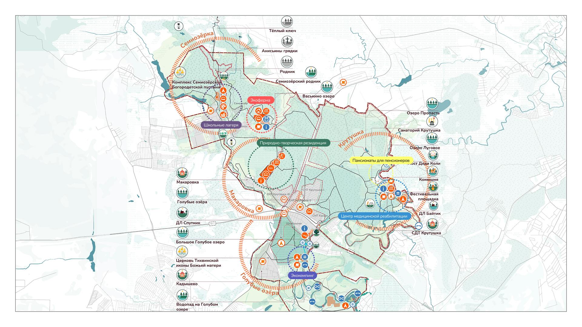 Ключевые центры активности будут сформированы вокруг уже существующих точек притяжения локальных сообществ, в них будут поддерживаться и развиваться уже сложившиеся практики рекреации, оздоровления, научных исследований и спорта.