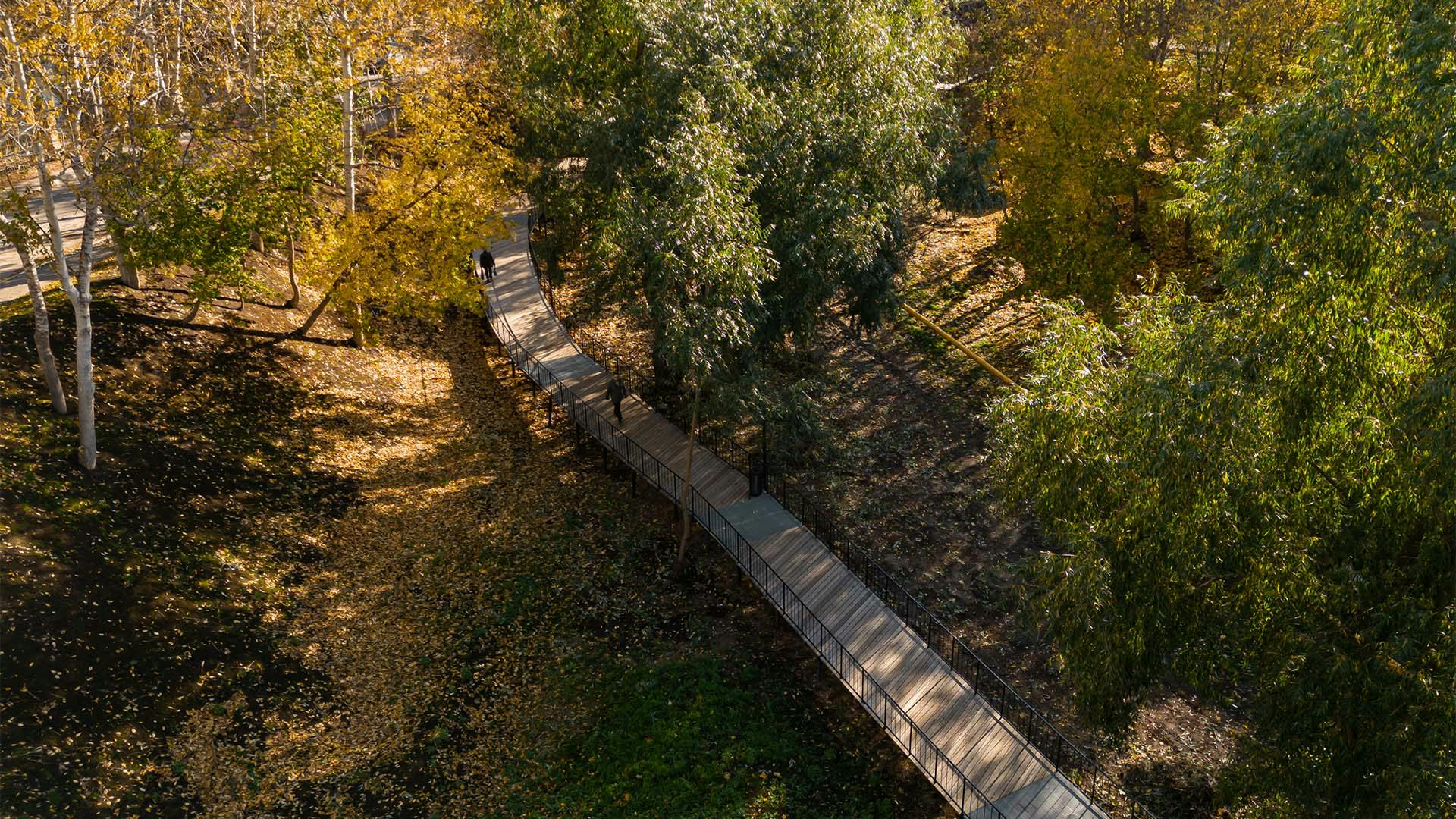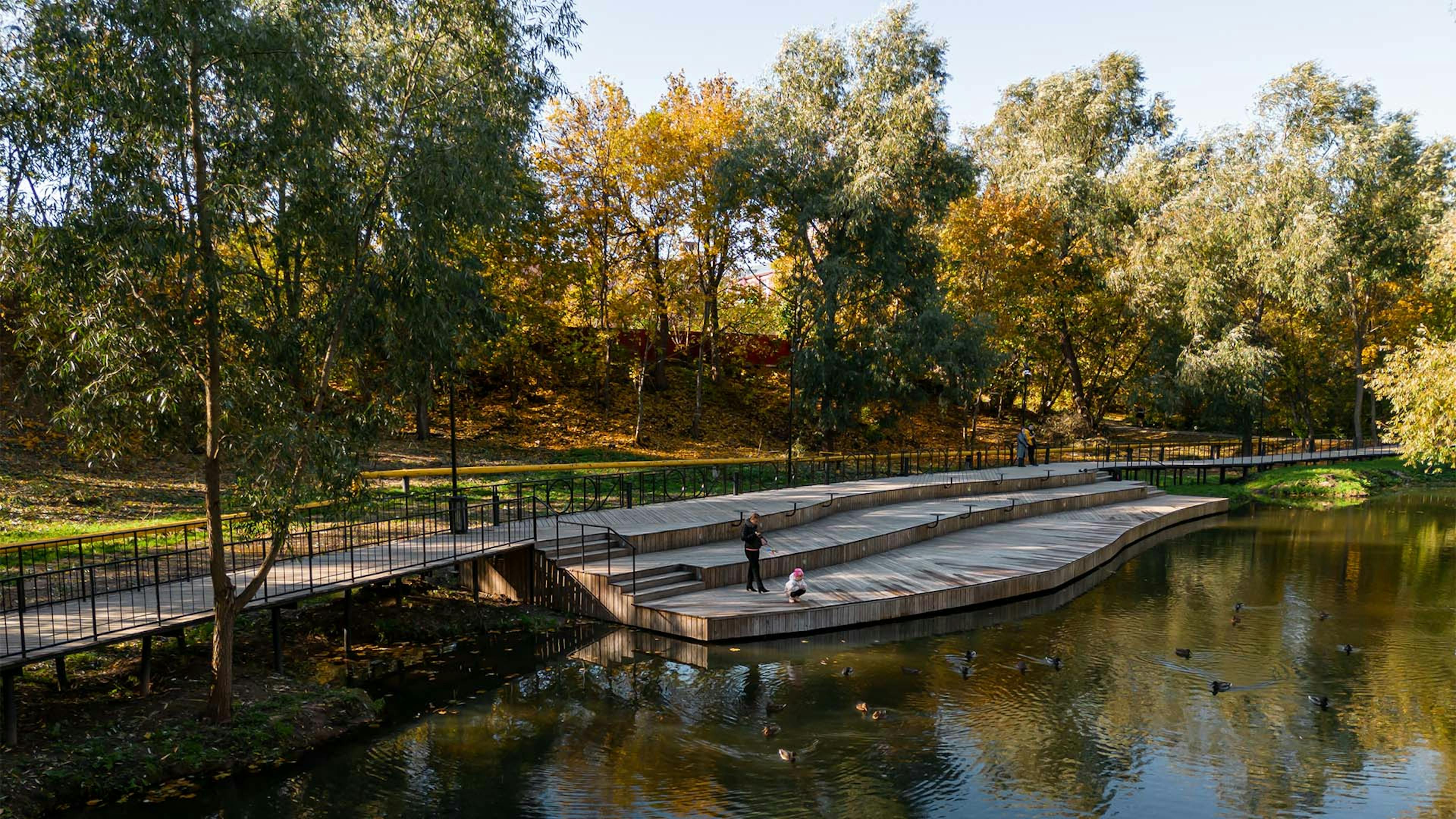 Заброшенная территория оврага преобразовалась в место отдыха и встреч горожан. На пруду разместился амфитеатр, появились новые связи в виде лестниц, деревянный променад. Ограждения для всех объектов выполнены в общей стилистике Нового торга.