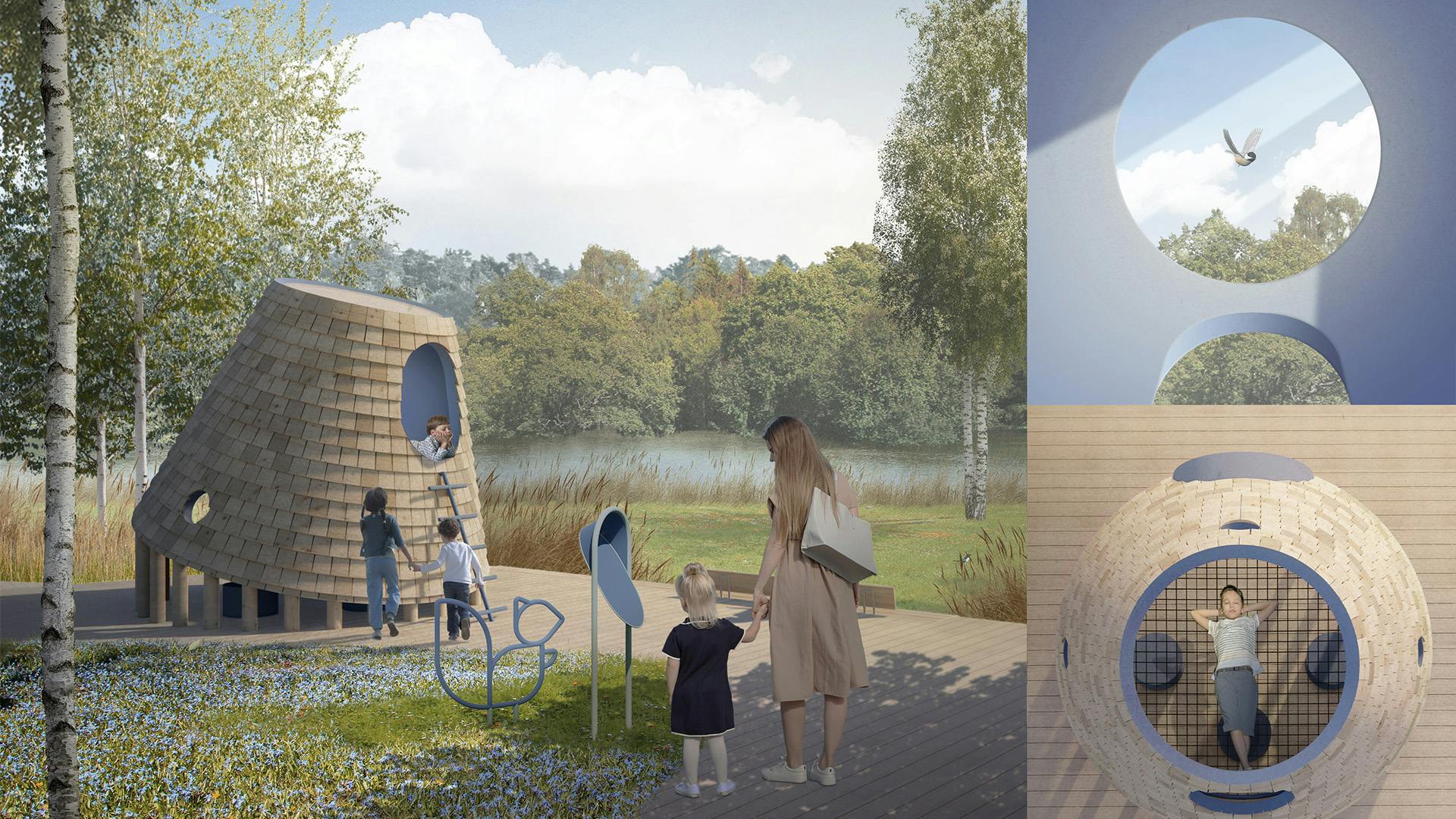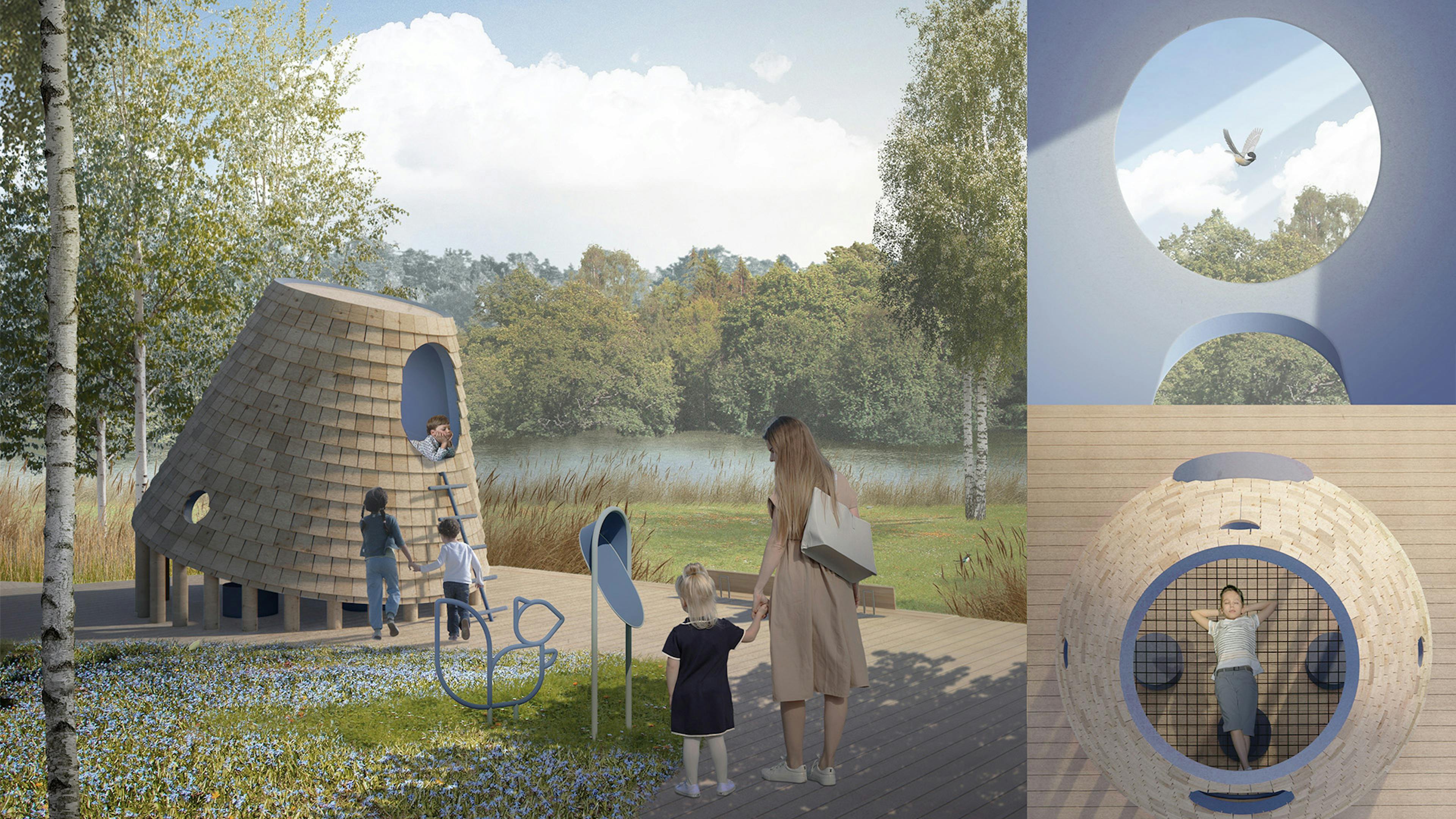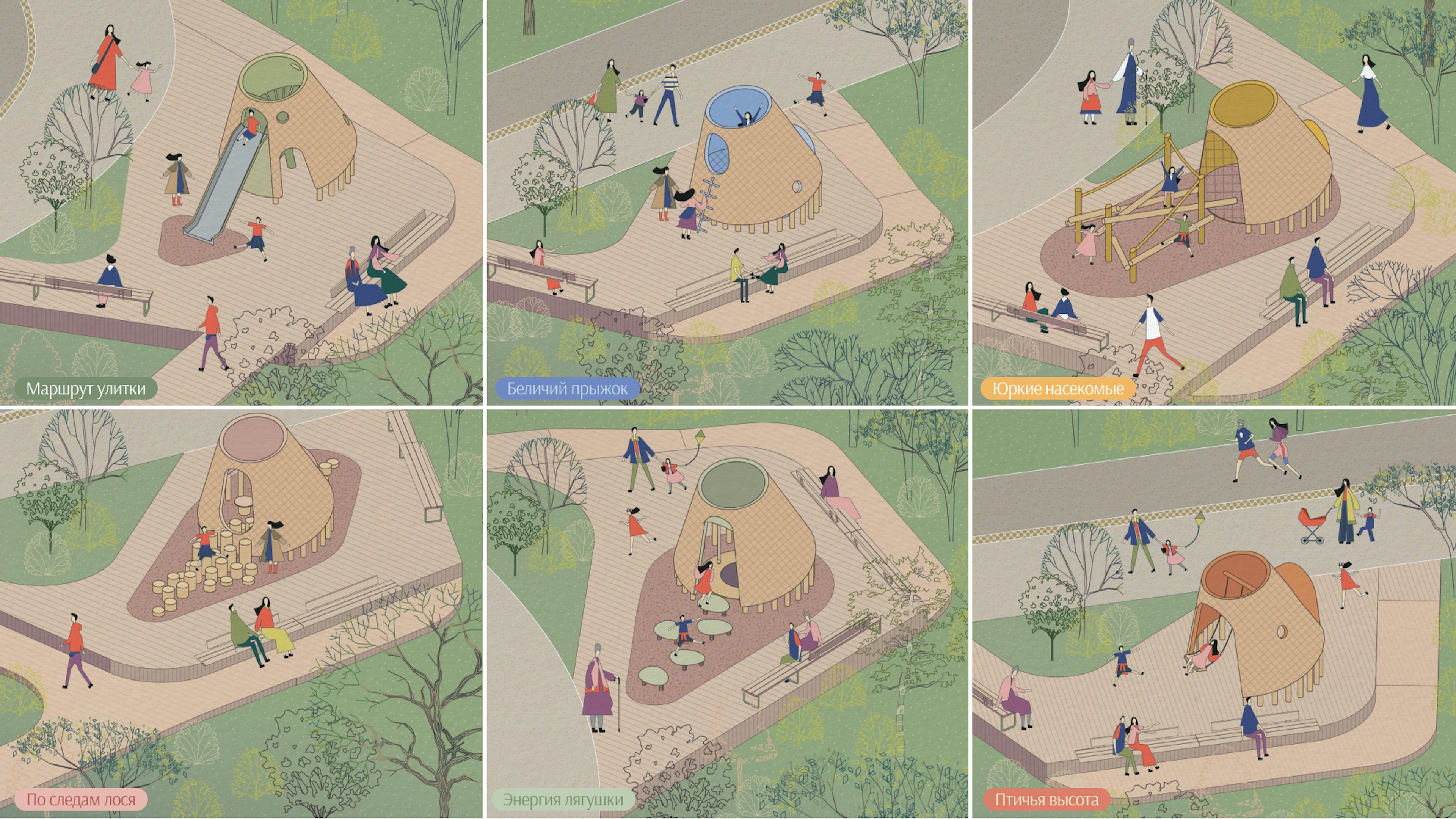 На променаде вдоль реки предусмотрено создание шести лесных обсерваторий — игровых павильонов для детей и их родителей, которые обращают внимание на важность бережного отношения к лесу и его обитателям. Внутри каждой лесной обсерватории расположено игровое оборудование, которое помогает имитировать поведение животных: парить на качелях как птица, перелезать по ветке как муравей. Образовательная навигация с фигурами лесных жителей и информационными стендами дополняют лесные обсерватории. Для разработки обсерваторий была организована творческая мастерская со школьниками.