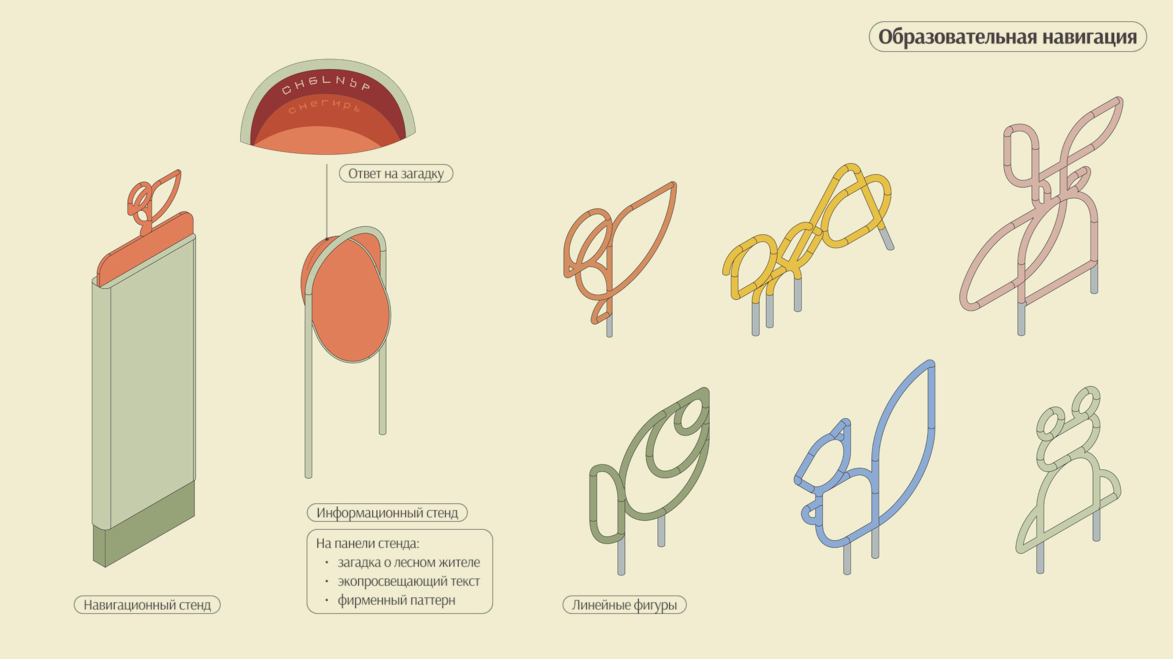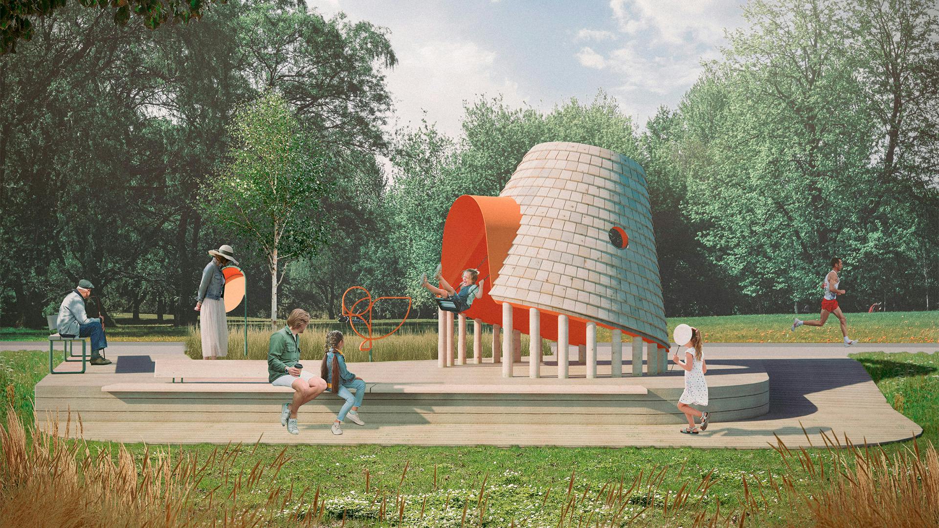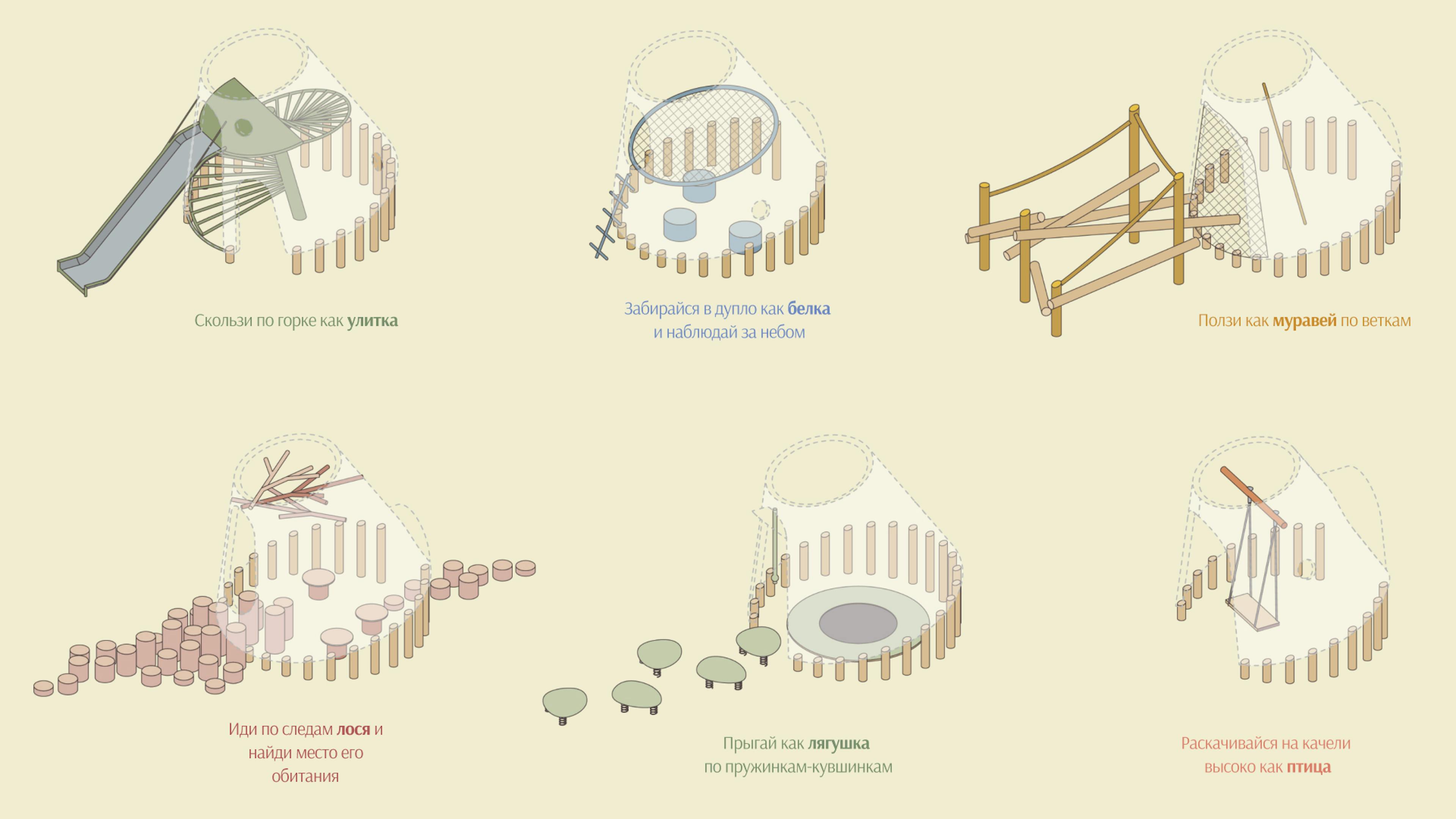 На променаде вдоль реки предусмотрено создание шести лесных обсерваторий — игровых павильонов для детей и их родителей, которые обращают внимание на важность бережного отношения к лесу и его обитателям. Внутри каждой лесной обсерватории расположено игровое оборудование, которое помогает имитировать поведение животных: парить на качелях как птица, перелезать по ветке как муравей. Образовательная навигация с фигурами лесных жителей и информационными стендами дополняют лесные обсерватории. Для разработки обсерваторий была организована творческая мастерская со школьниками.