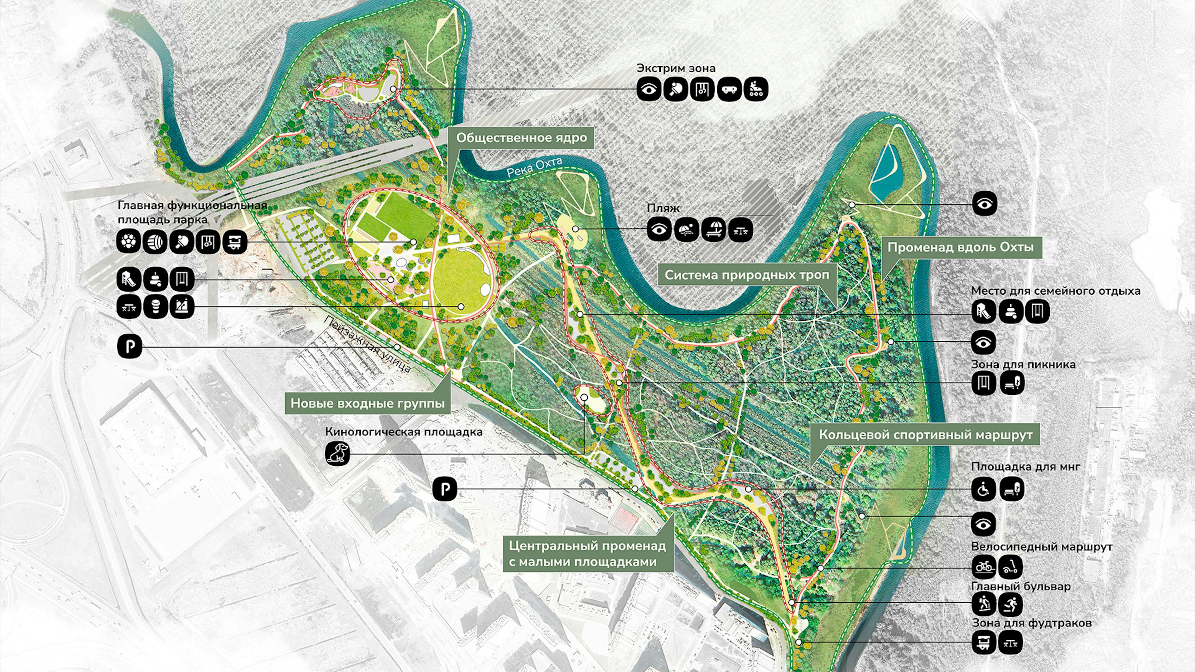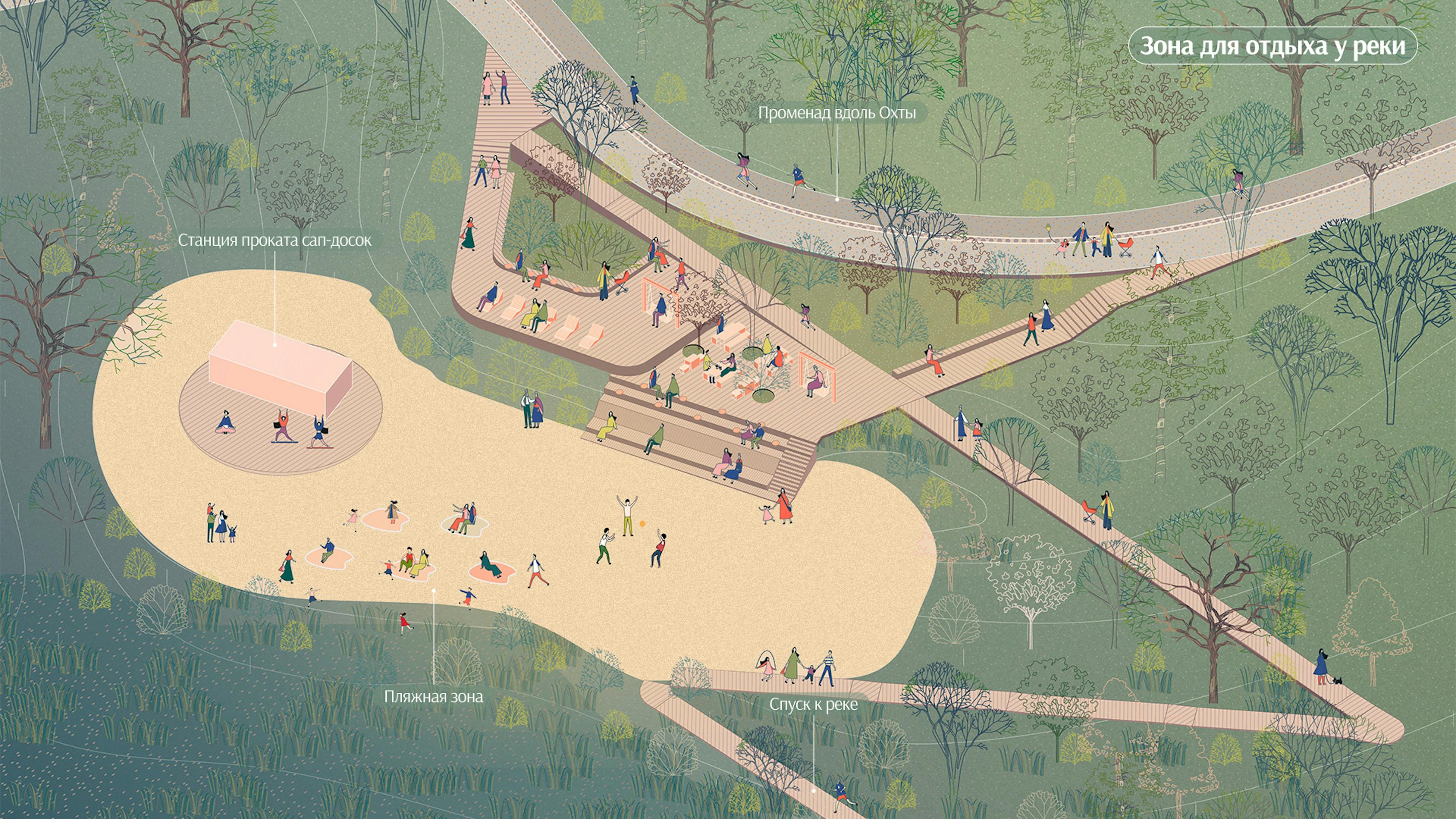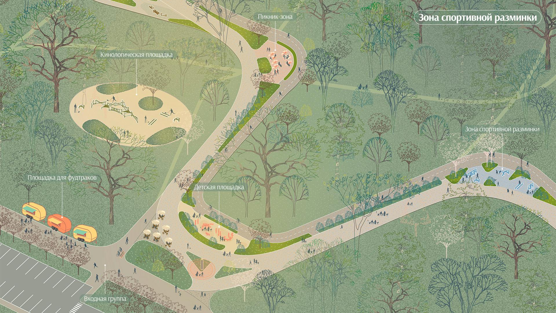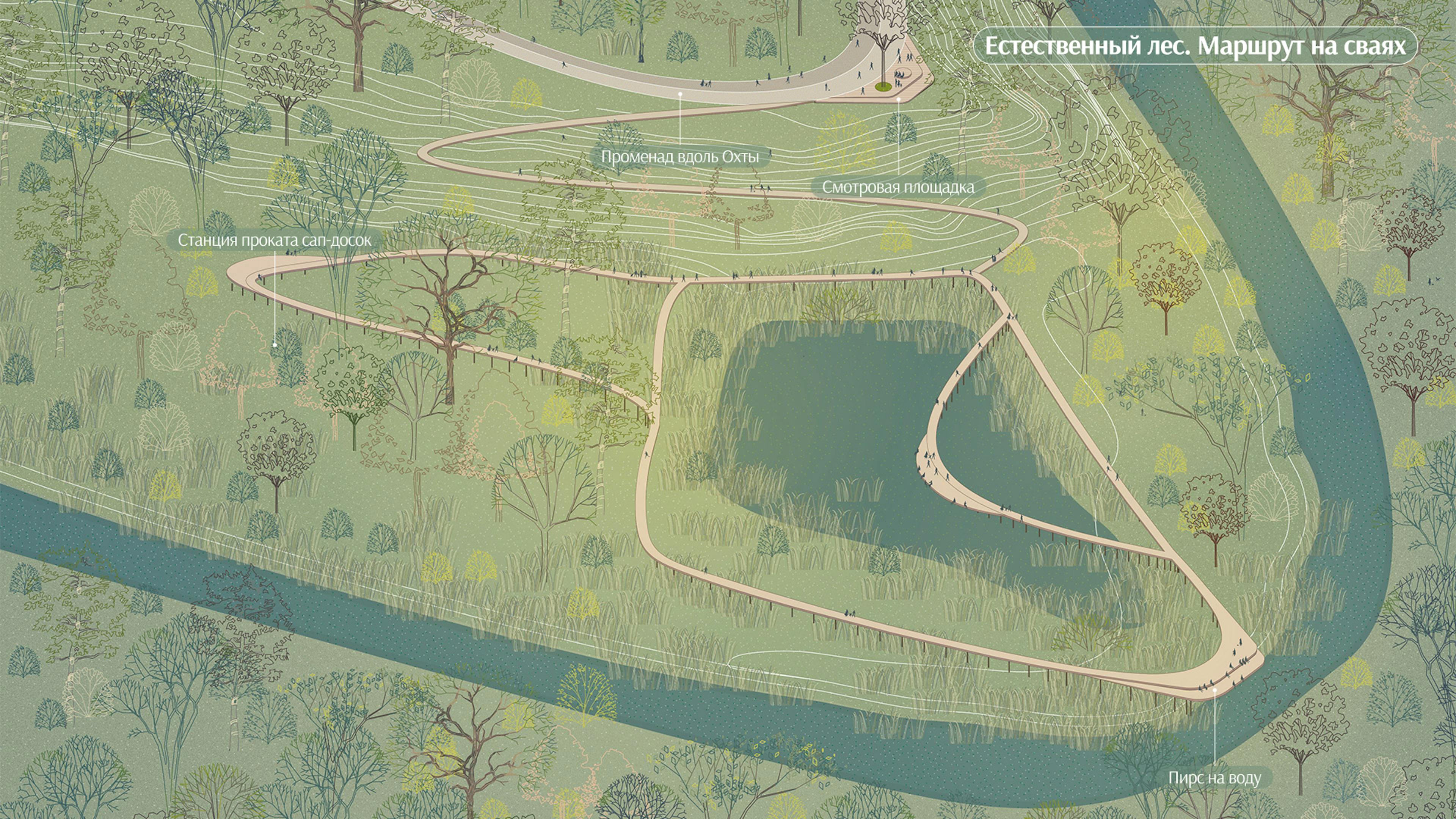 Для распределения антропогенной нагрузки предусмотрена вариативность маршрутов под разные пользовательские сценарии: променад вдоль реки, кольцевой маршрут, велопешеходный маршрут и тропиночная сеть с поддерживающей инфраструктурой. Стратегия озеленения Пейзажного лесопарка базируется на максимальном сохранении массива леса и околоводных растений.