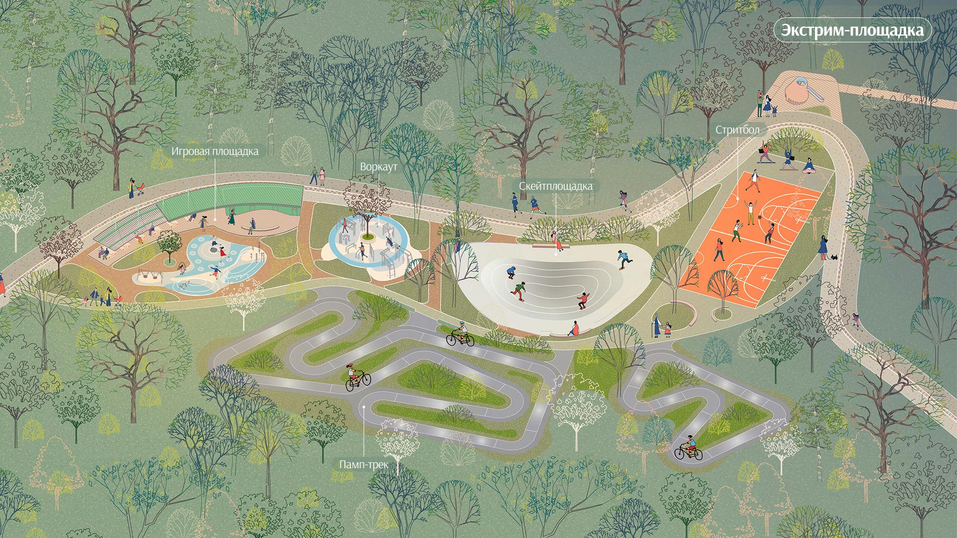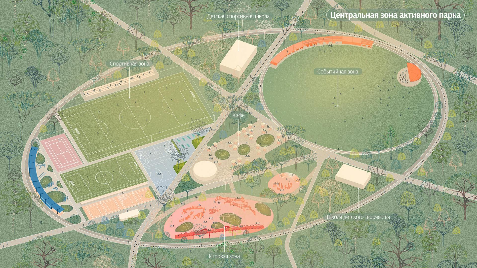 • 15% территории — активный парк с событийной, игровой, спортивной, рекреационной и базовой инфраструктурой, разработанной в соответствии с запросами горожан