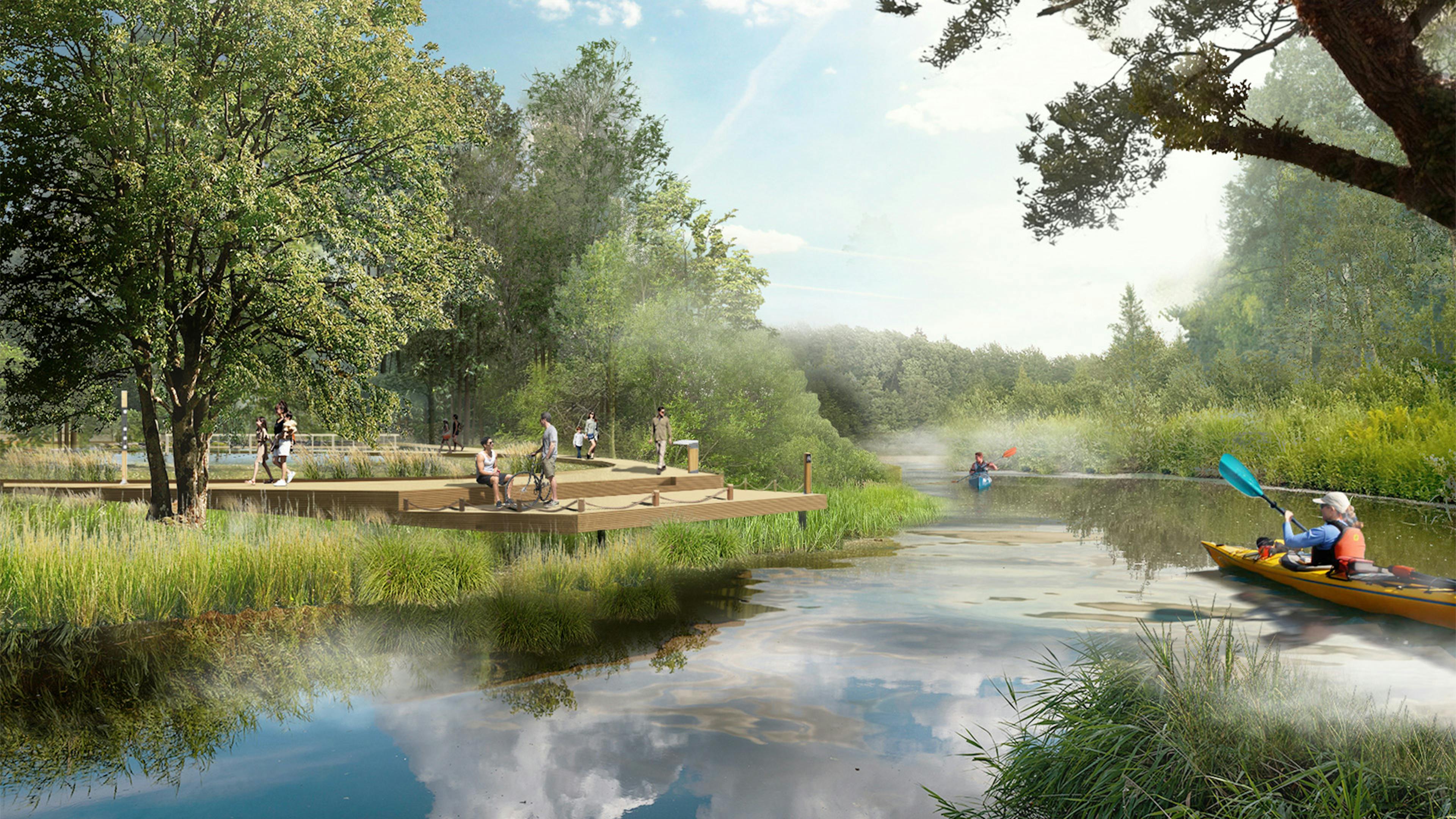 • Сохранение 85% территории естественного леса с природными тропами, променадом вдоль реки, маршрутами на сваях по затопляемым зонам, смотровыми площадками и выделенной зоной для отдыха
