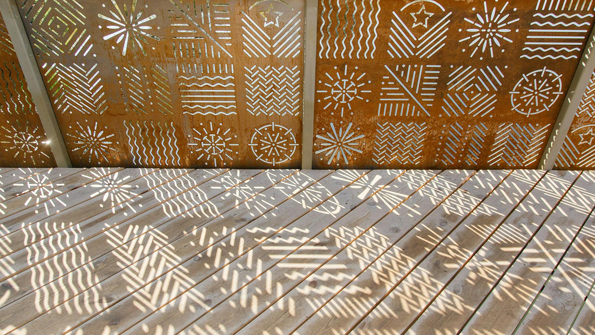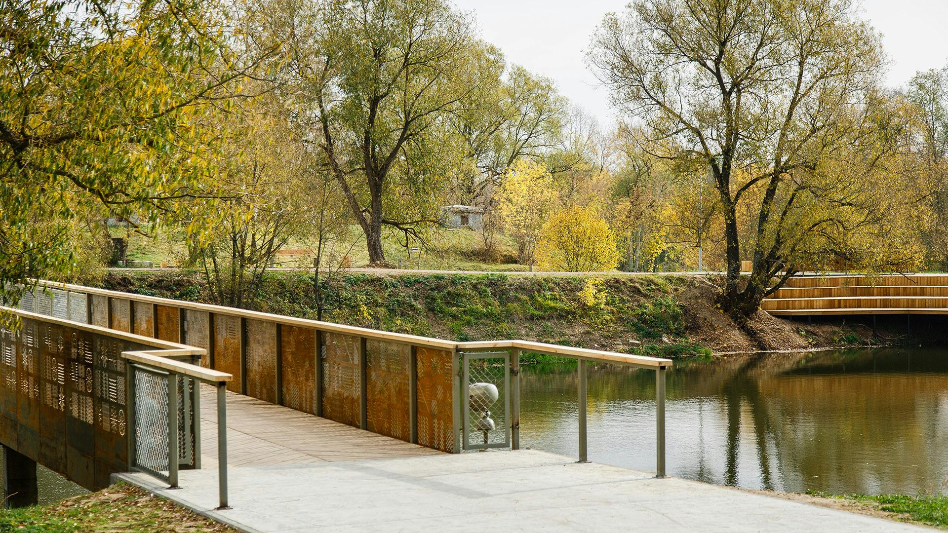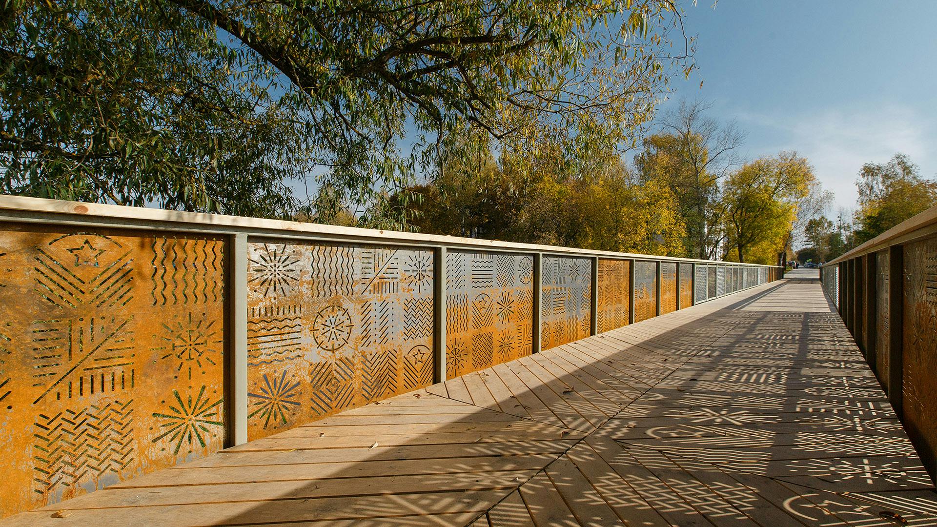 Старый мост через пруд реконструирован с помощью листов кортеновской стали. На листы, которые также используются для ограждений амфитеатра и пирсов, перфорацией нанесен специально разработанный орнамент: он соединяет символику военного городка (звезды) и традиционные узоры местных ситцев, подчеркивая идею объединения военного и текстильного районов Тейкова. Рыжий оттенок кортена также хорошо вписывается в природную среду и дополняет «теплоту» деревянных элементов.