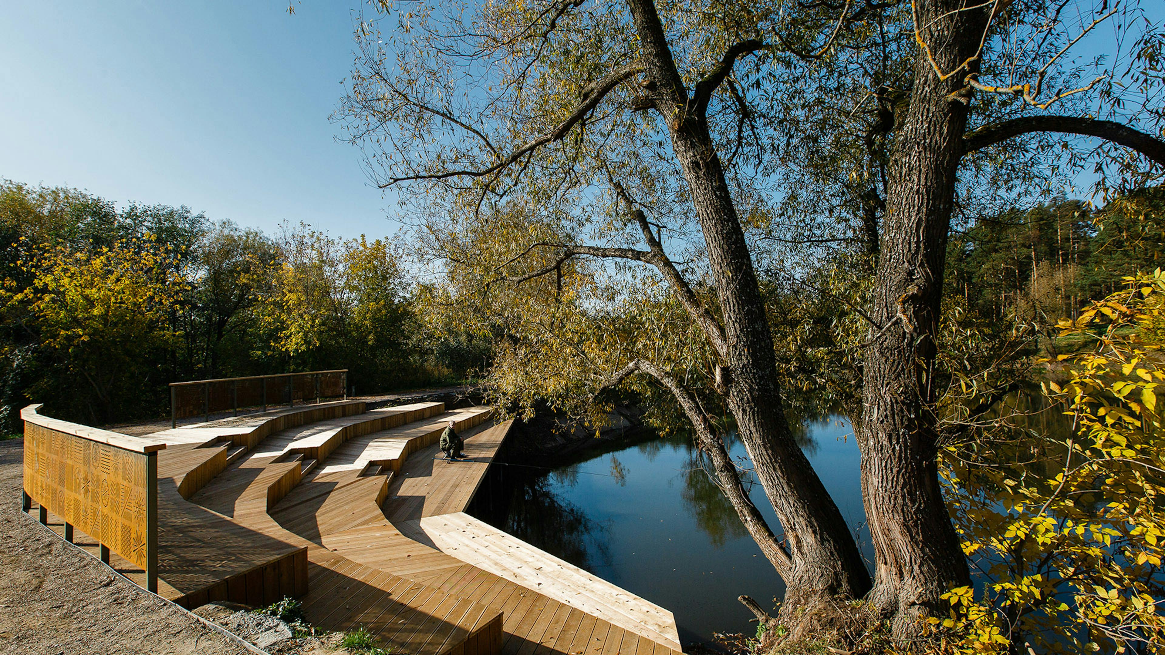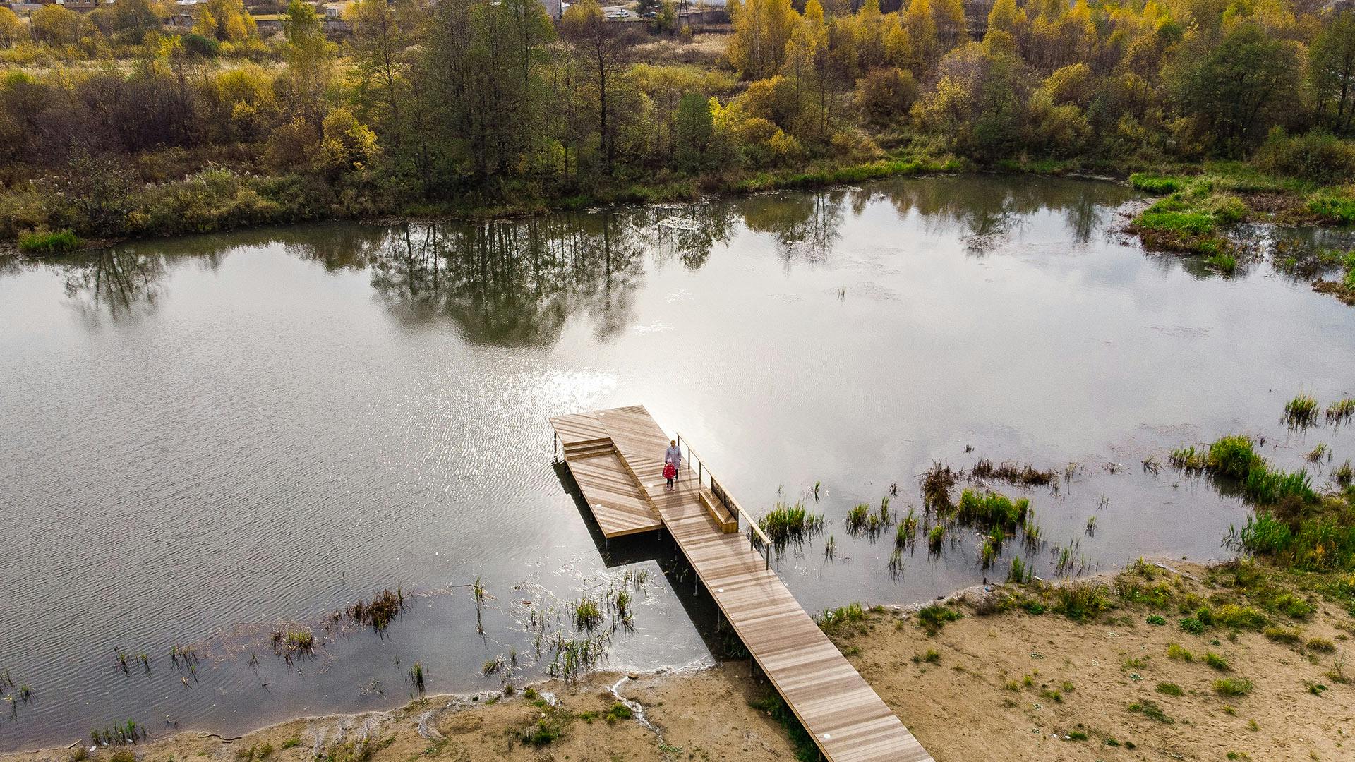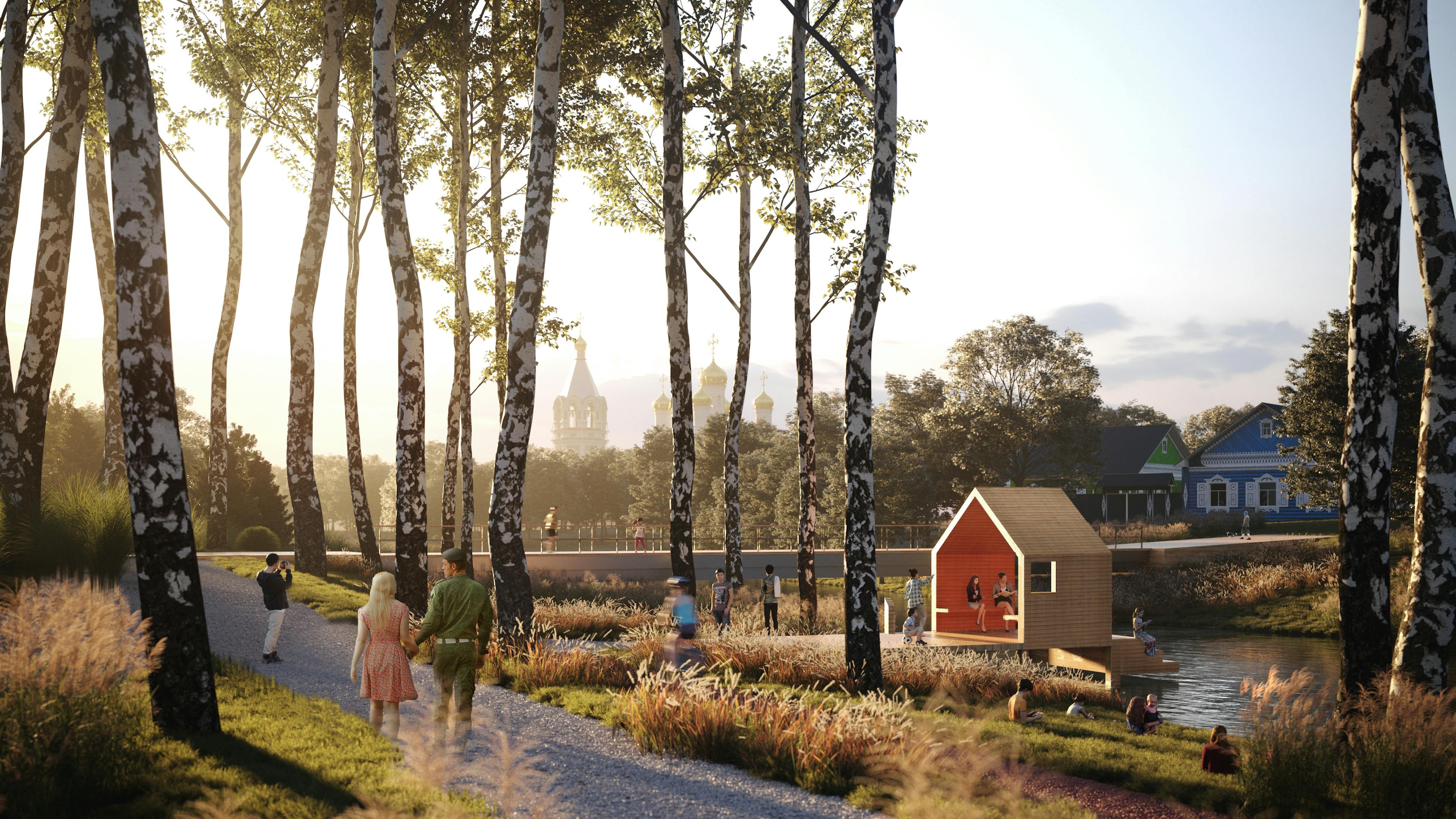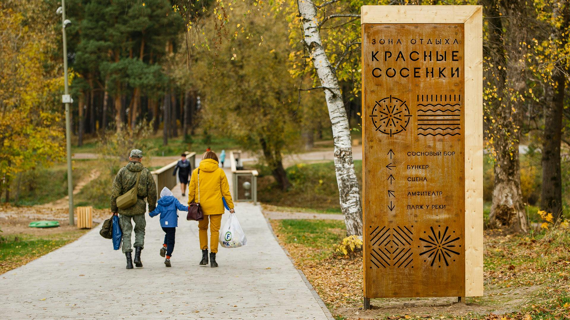 В 2020 году была реализована первая очередь проекта — зона отдыха «Красные сосенки». Она расположена рядом со старым сосновым бором, и важно было подчеркнуть красоту местной природы, создать гармоничное и умиротворенное пространство. У набережной Вязьмы появился городской пляж с пирсами для рыбалки и отдыха, детской площадкой, созданной из обработанных стволов, и зоной для пикников. На Генеральском пруду вырос амфитеатр, а рядом с ним — небольшая сцена. Природный характер зоны подчеркивают плавные изгибы новых дорожек, вписанные в рельеф.