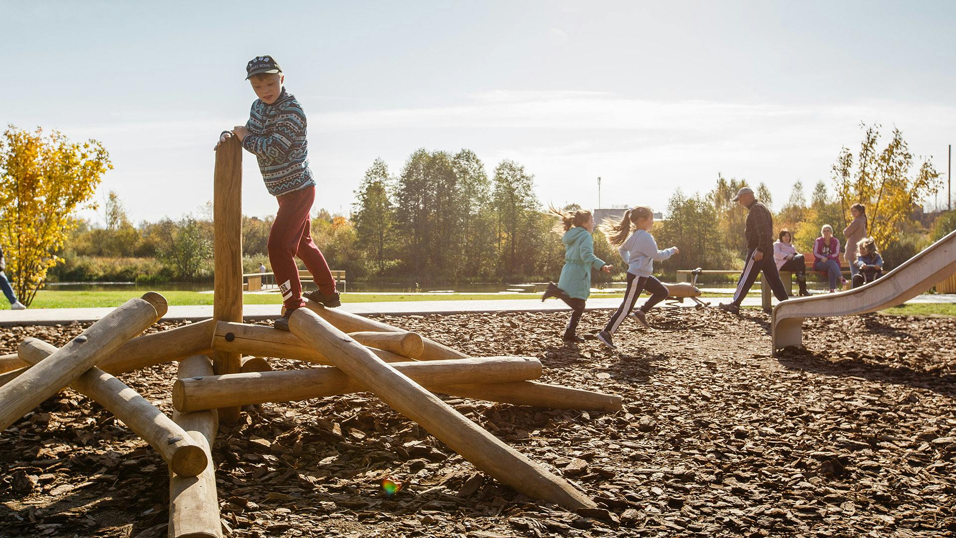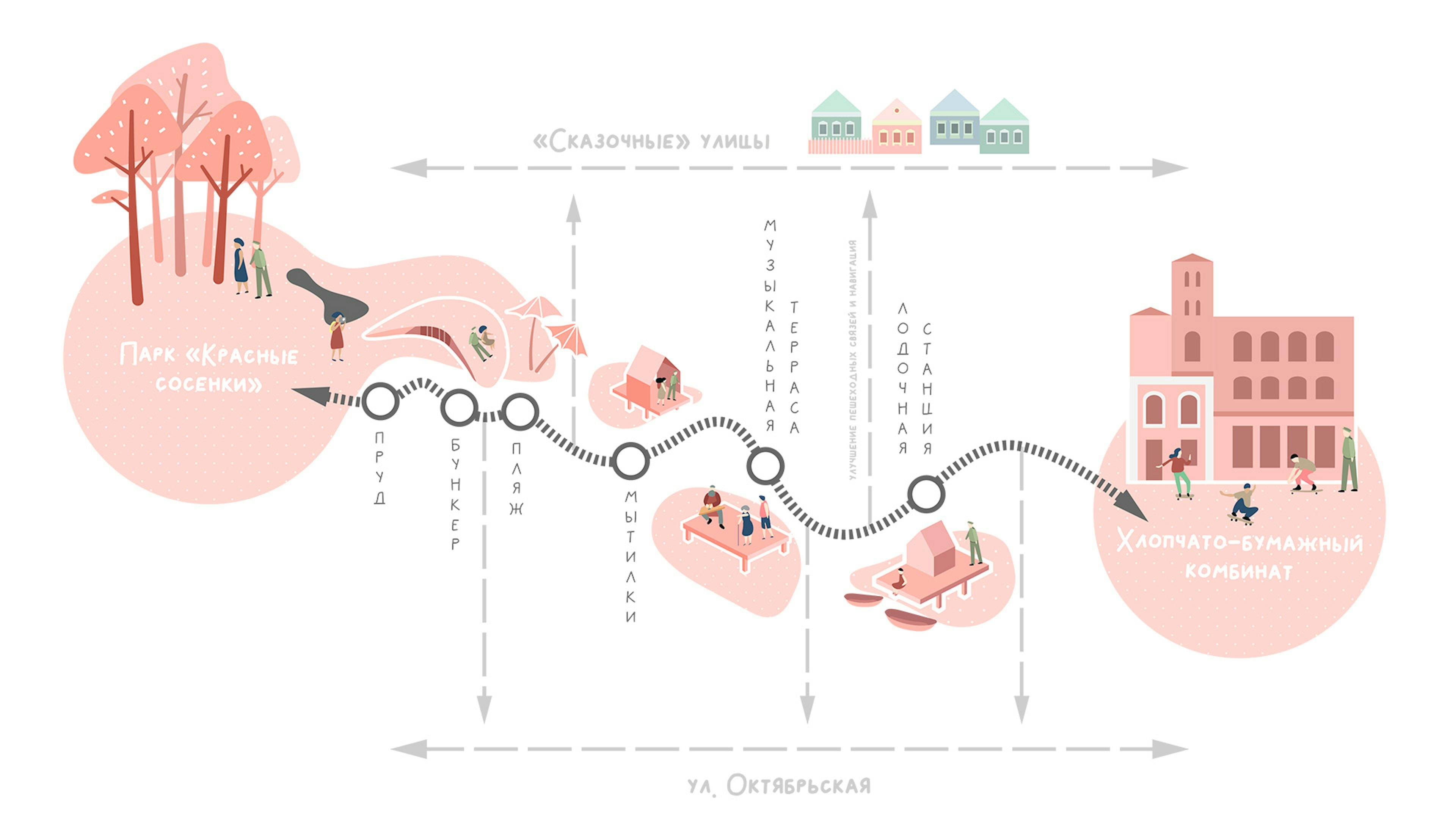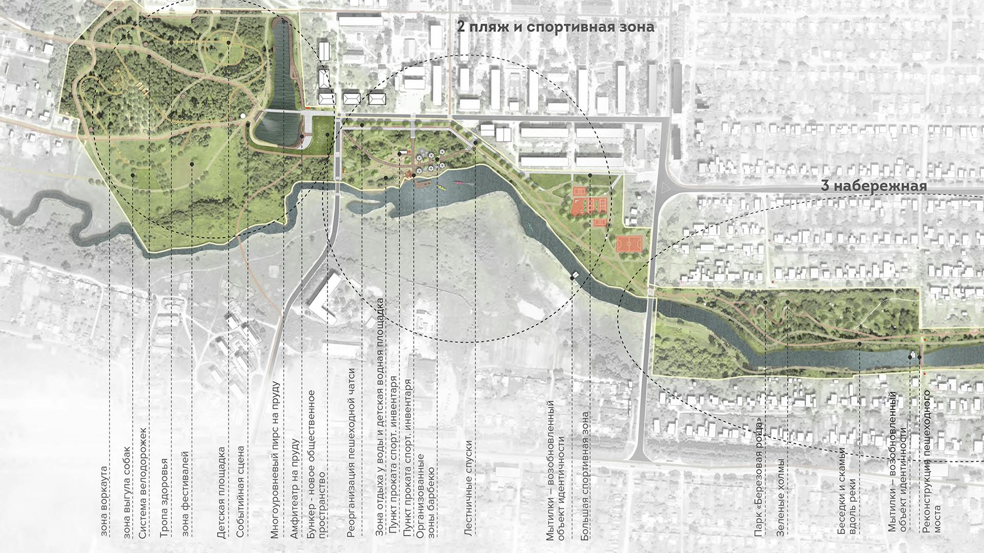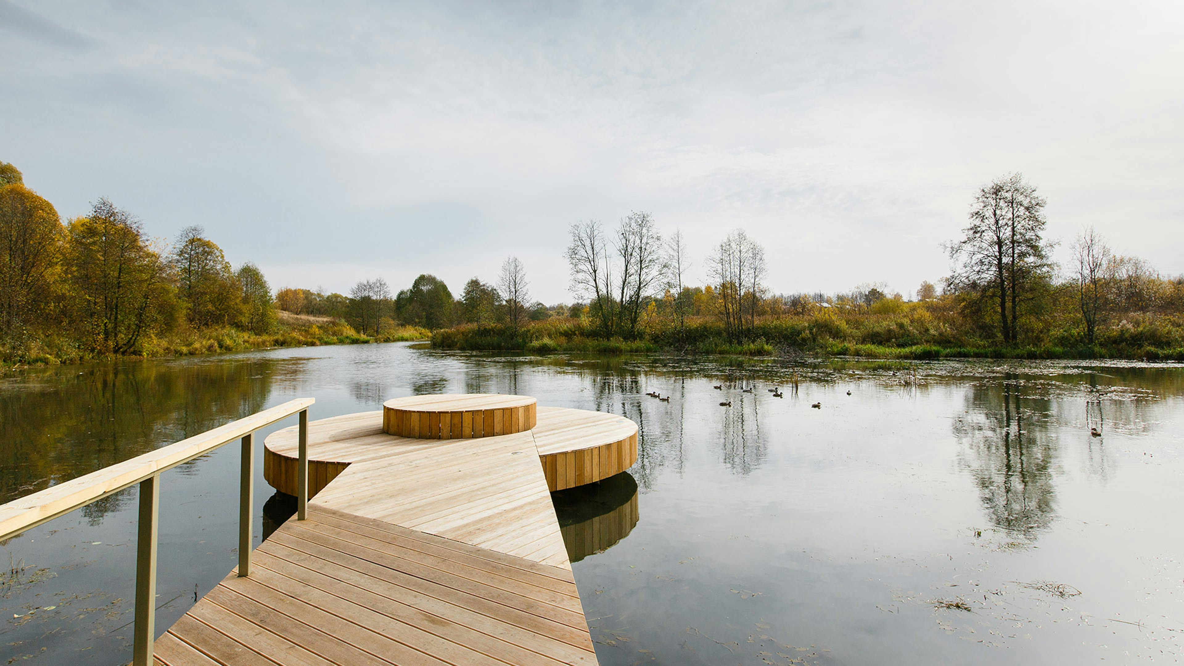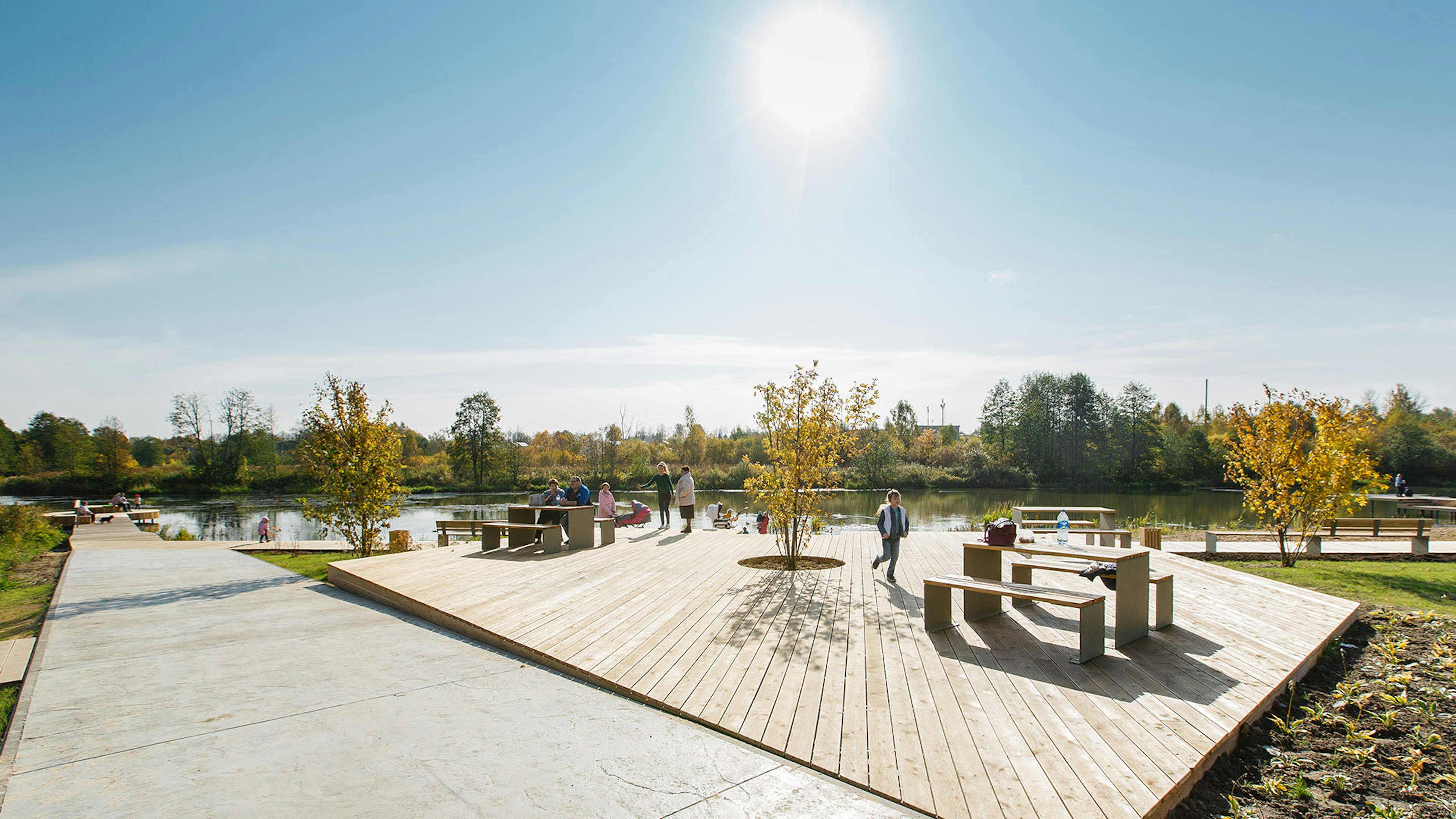 В 2020 году была реализована первая очередь проекта — зона отдыха «Красные сосенки». Она расположена рядом со старым сосновым бором, и важно было подчеркнуть красоту местной природы, создать гармоничное и умиротворенное пространство. У набережной Вязьмы появился городской пляж с пирсами для рыбалки и отдыха, детской площадкой, созданной из обработанных стволов, и зоной для пикников. На Генеральском пруду вырос амфитеатр, а рядом с ним — небольшая сцена. Природный характер зоны подчеркивают плавные изгибы новых дорожек, вписанные в рельеф.