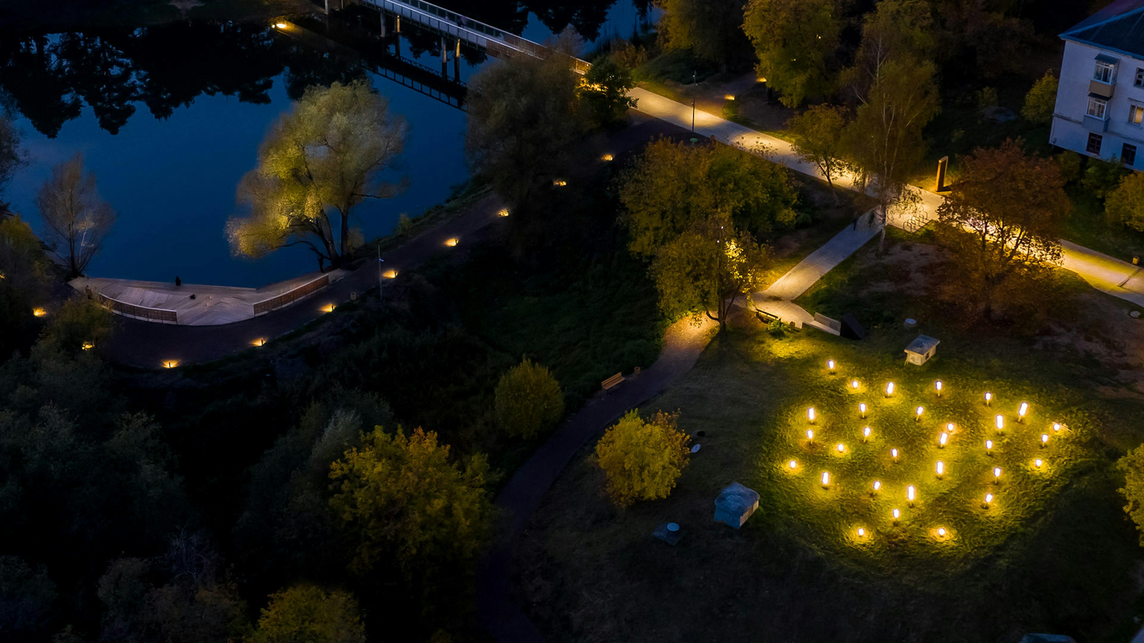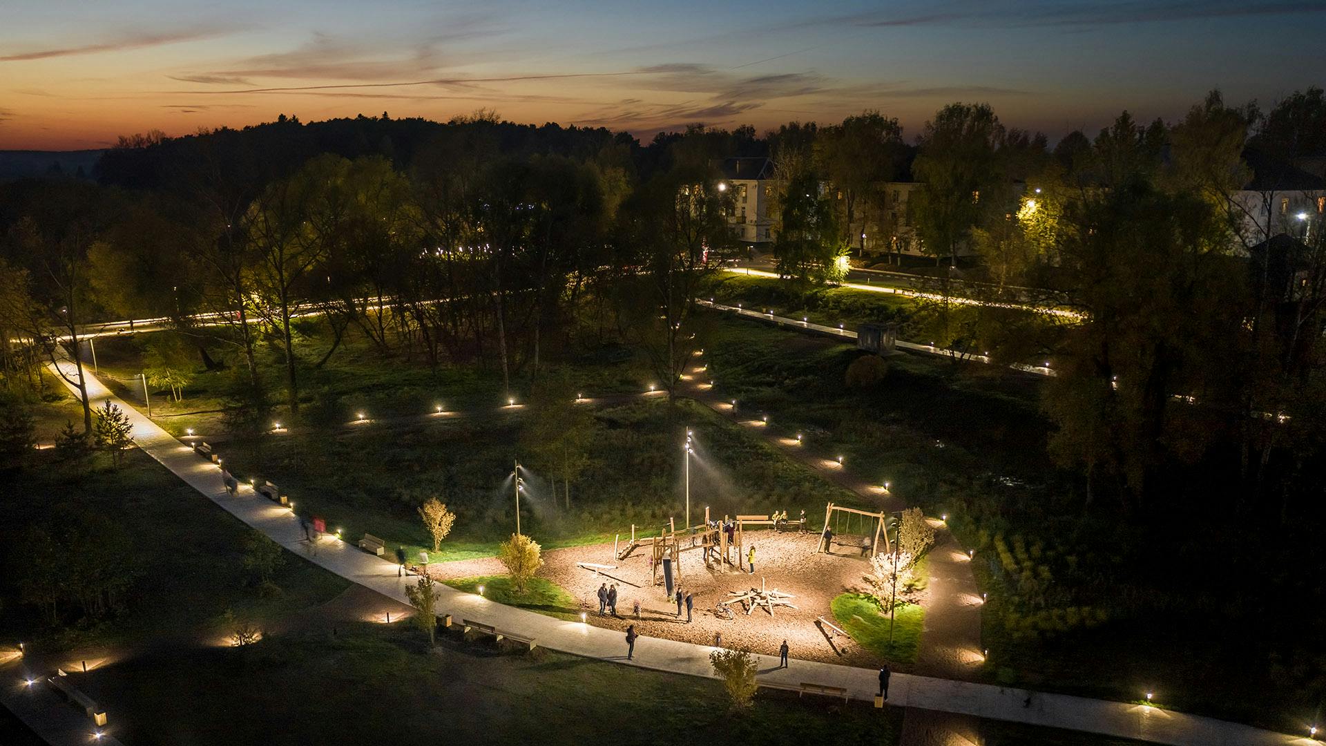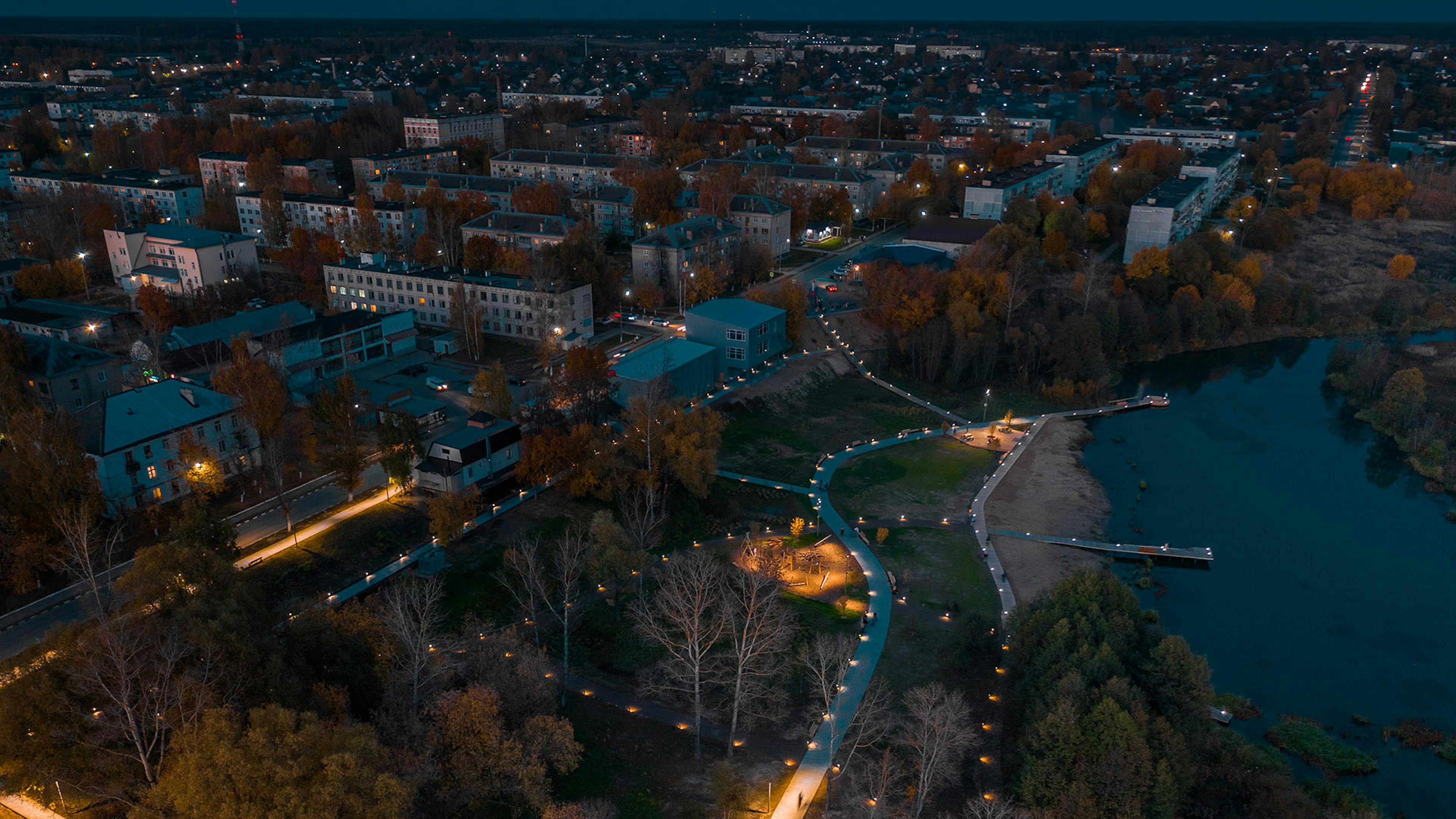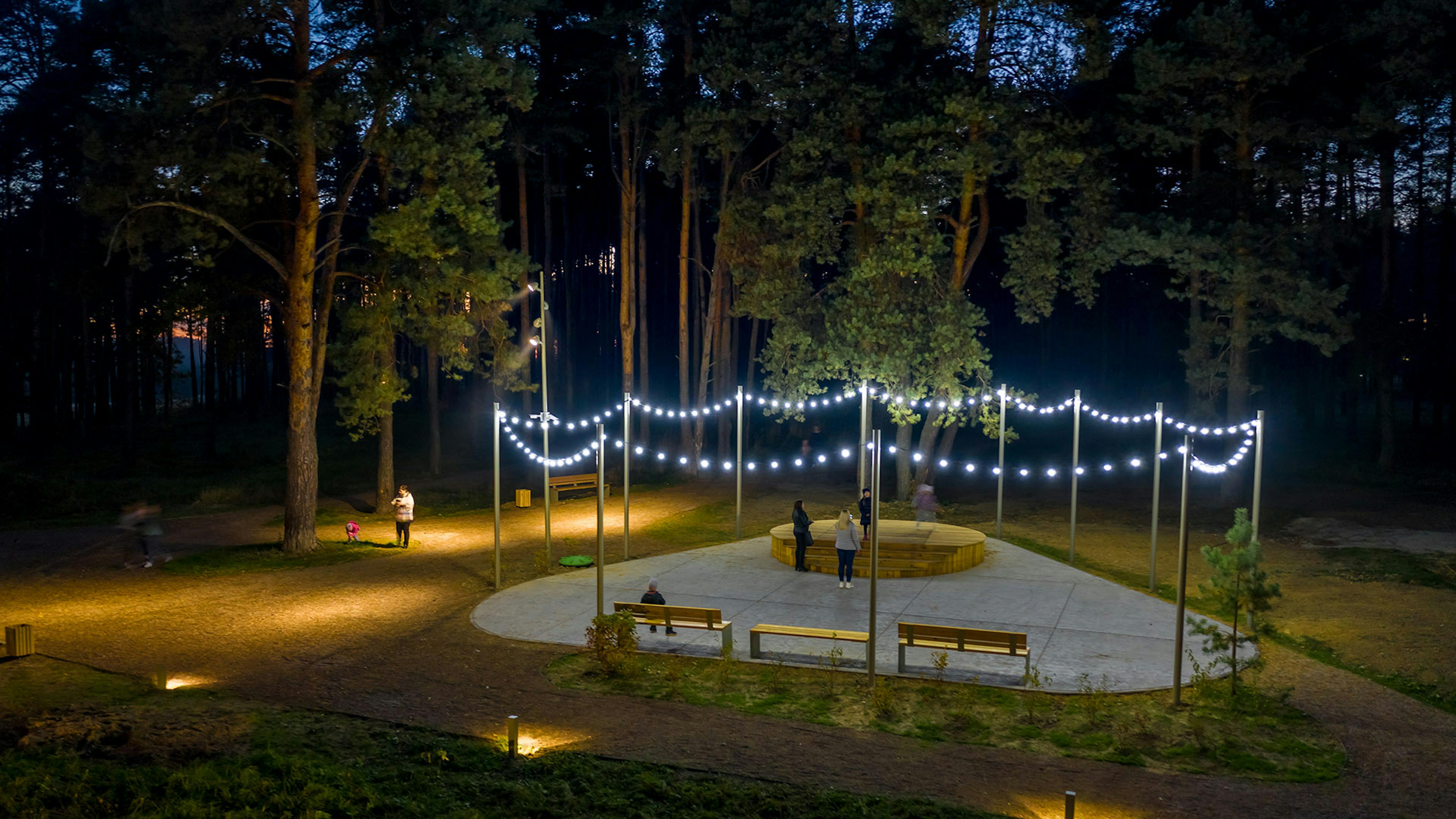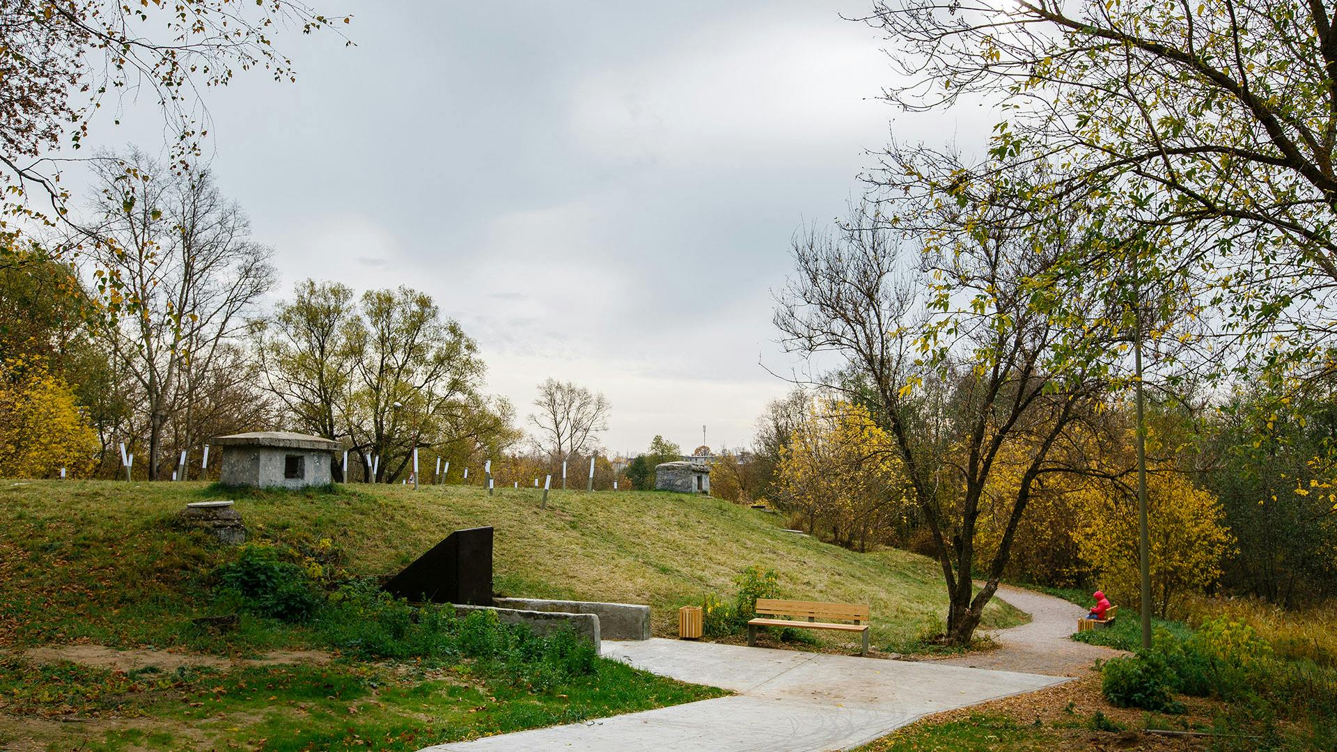 Нетривиальной задачей было вписать в проект заброшенный бункер у пруда. Чтобы смягчить восприятие сооружения, на его крыше мы разместили световую инсталляцию. «Лес» из светильников-столбиков в вечернее время становится необычной игровой зоной. Сам бункер в будущем откроется как площадка для выставок работ видеоарт-художников.